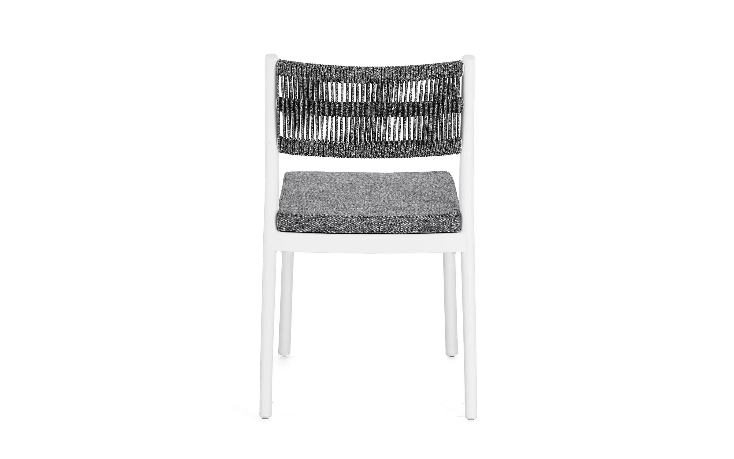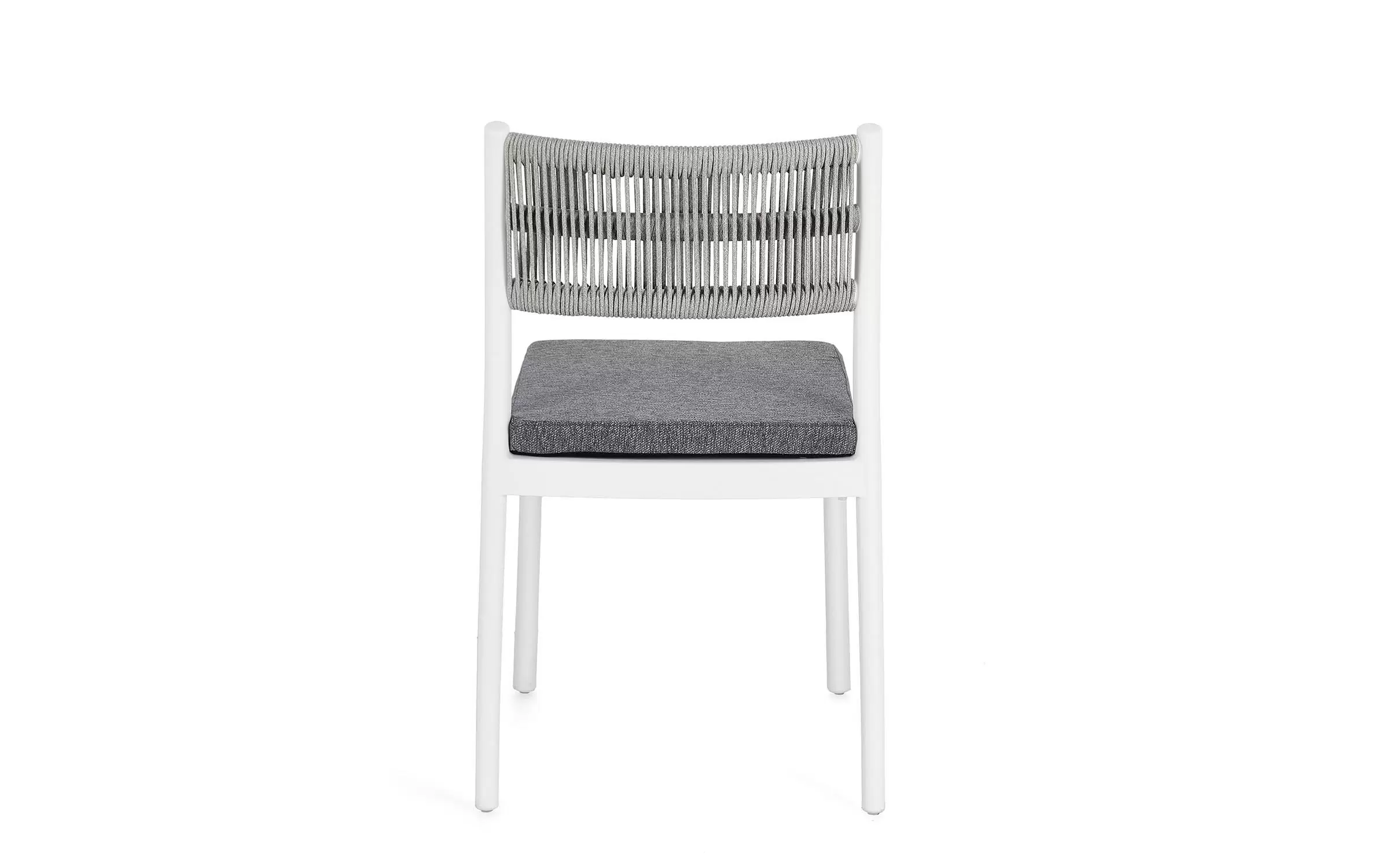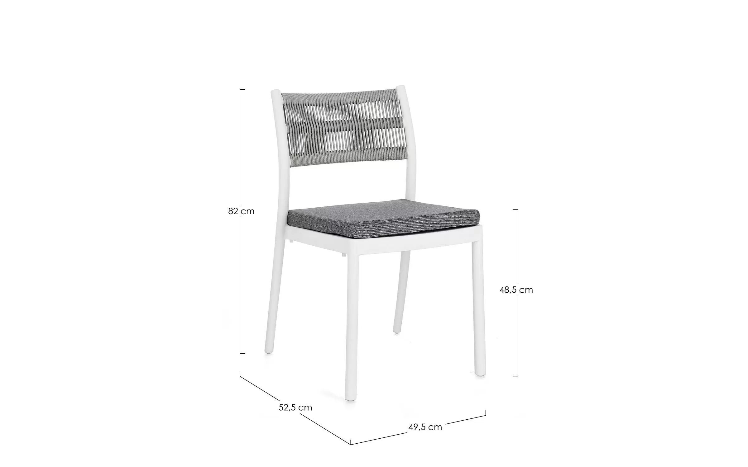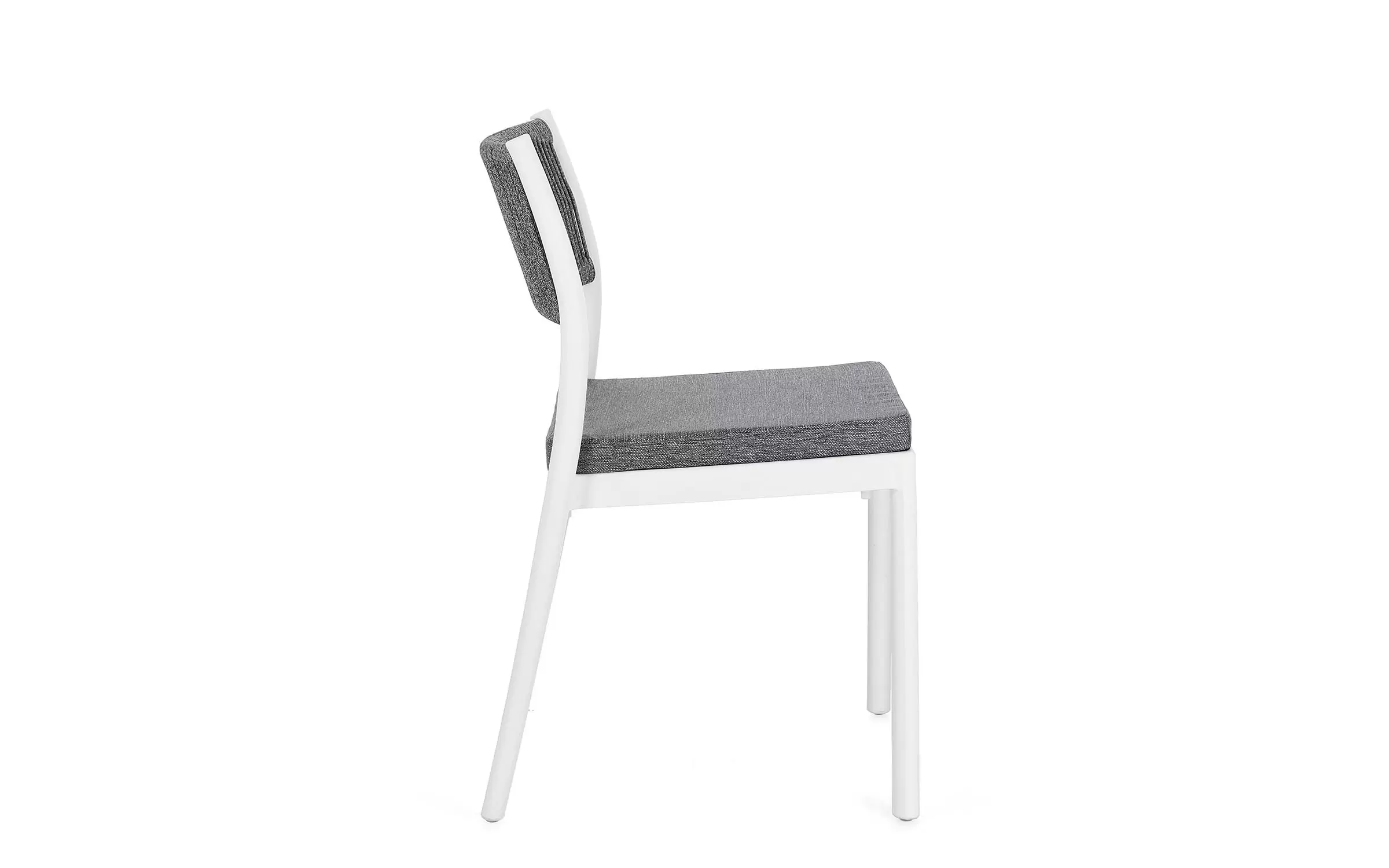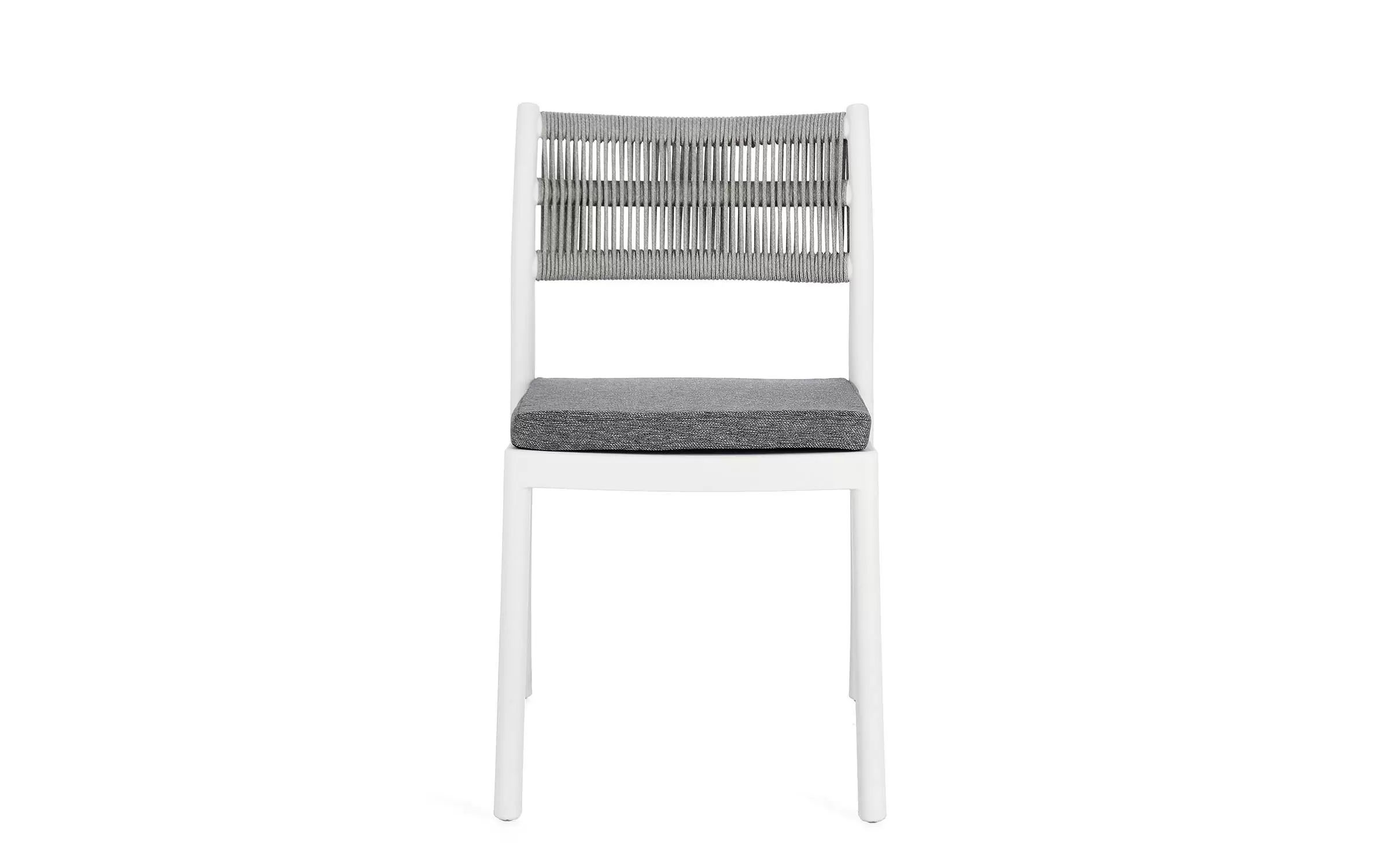 Aluminiowe krzesło na taras w kolorze białym z możliwością sztaplowania. Oparcie oplecione liną.