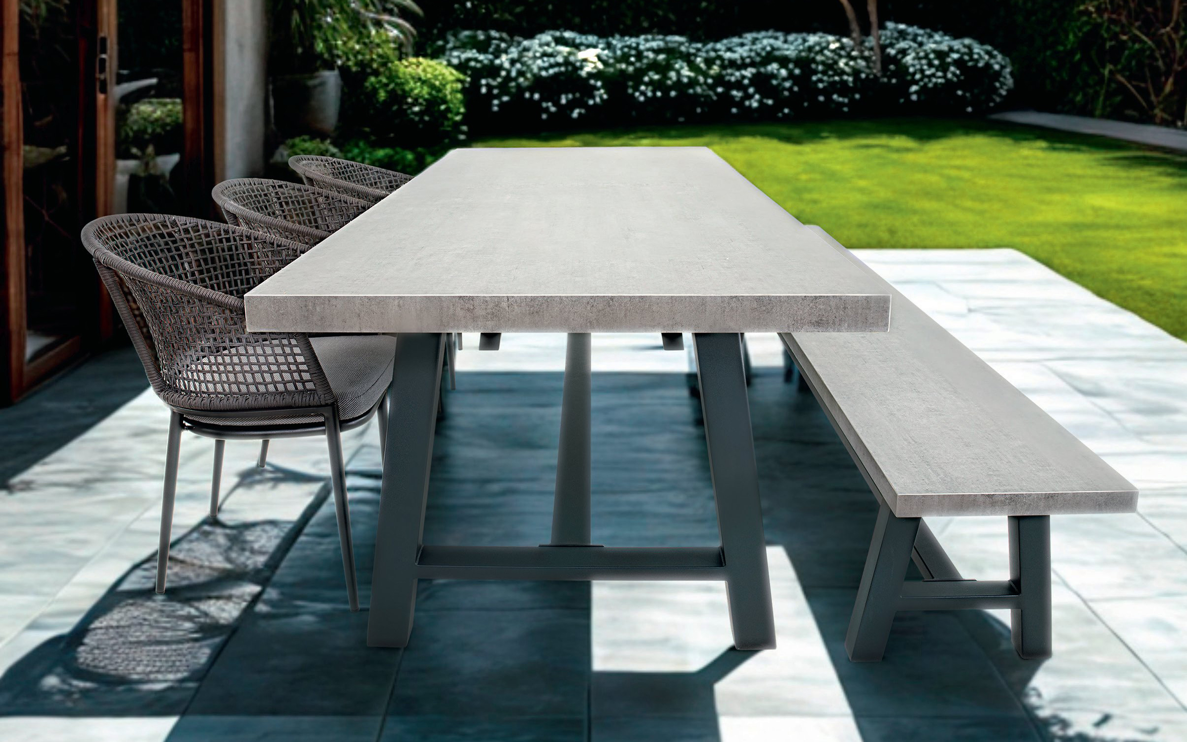 Podstawą niezawodności jest rama wykonana z malowanego proszkowo aluminium w głębokim, matowym odcieniu antracytu, która zapewnia pełną odporność na korozję i niekorzystne warunki atmosferyczne. Kluczowym elementem FRESCO jest siedzisko. Wykonane z 6-milimetrowego kamienia spiekanego, wzmocnionego aluminiowym rdzeniem typu plaster miodu oraz dodatkową płytą aluminiową, gwarantuje stabilność na lata. Ten zaawansowany materiał jest wyjątkowo odporny na zarysowania, wilgoć oraz promieniowanie UV, co czyni ławkę idealną do intensywnego, codziennego użytkowania.