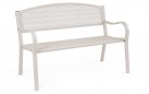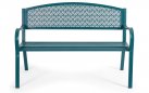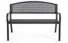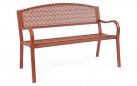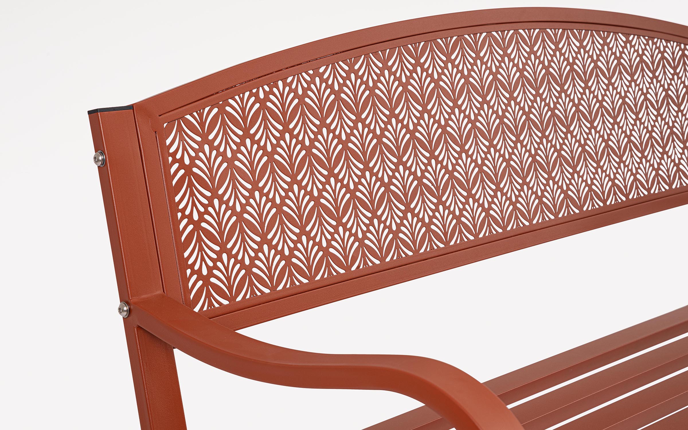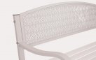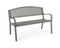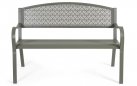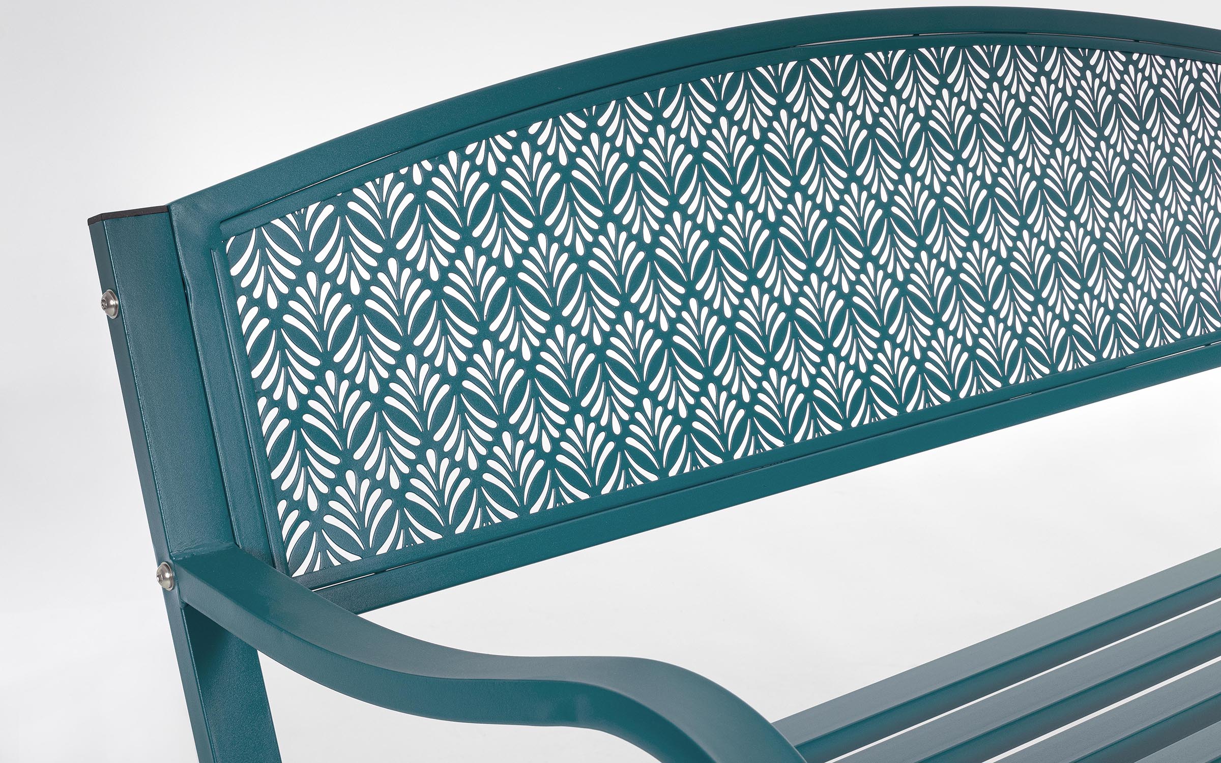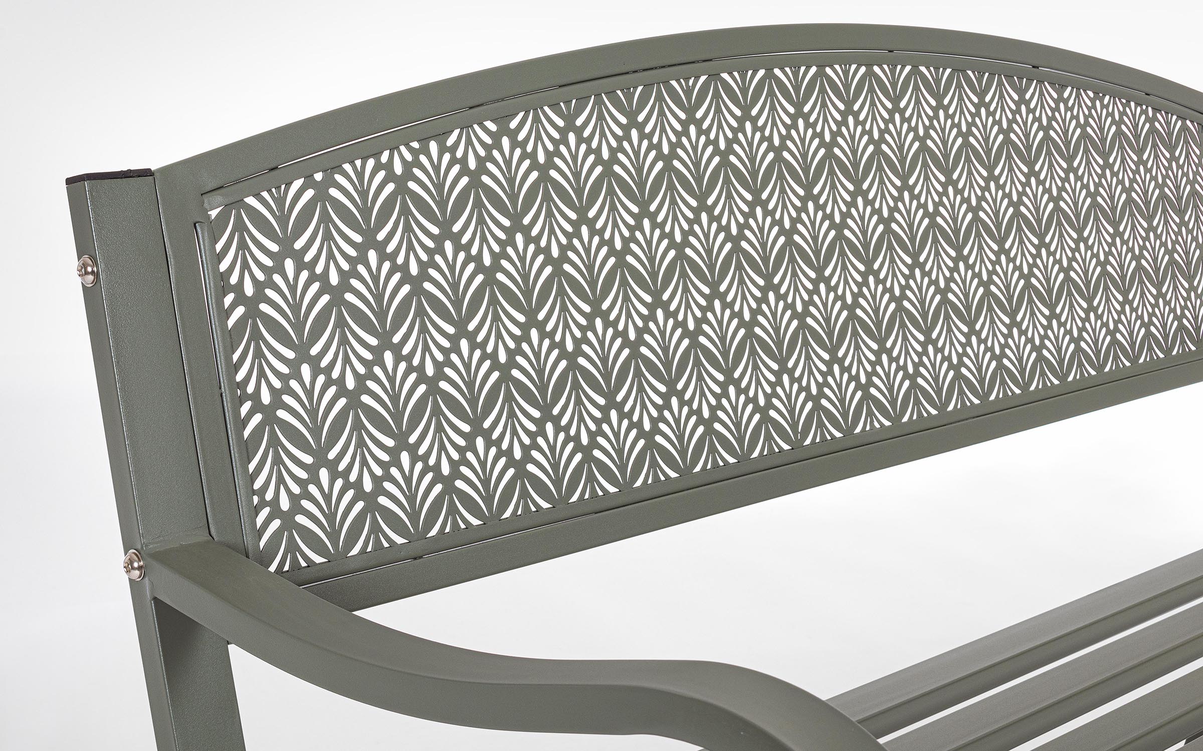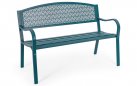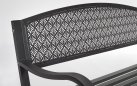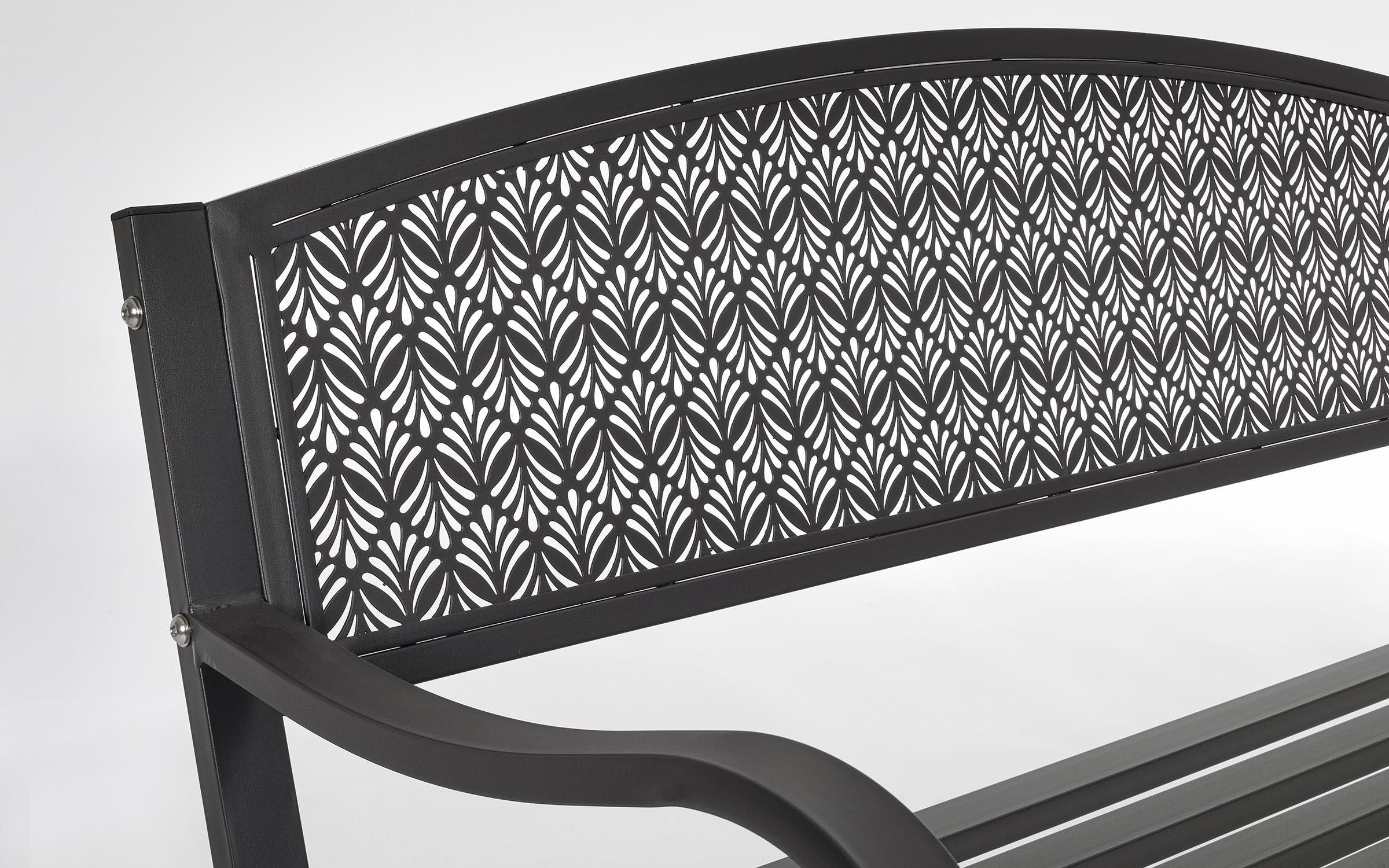 Metalowa ławka ogrodowa z podłokietnikami. Siedzenie z 'deseczek', natomiast oparcie z perforowanej ładnym wzorem blachy.