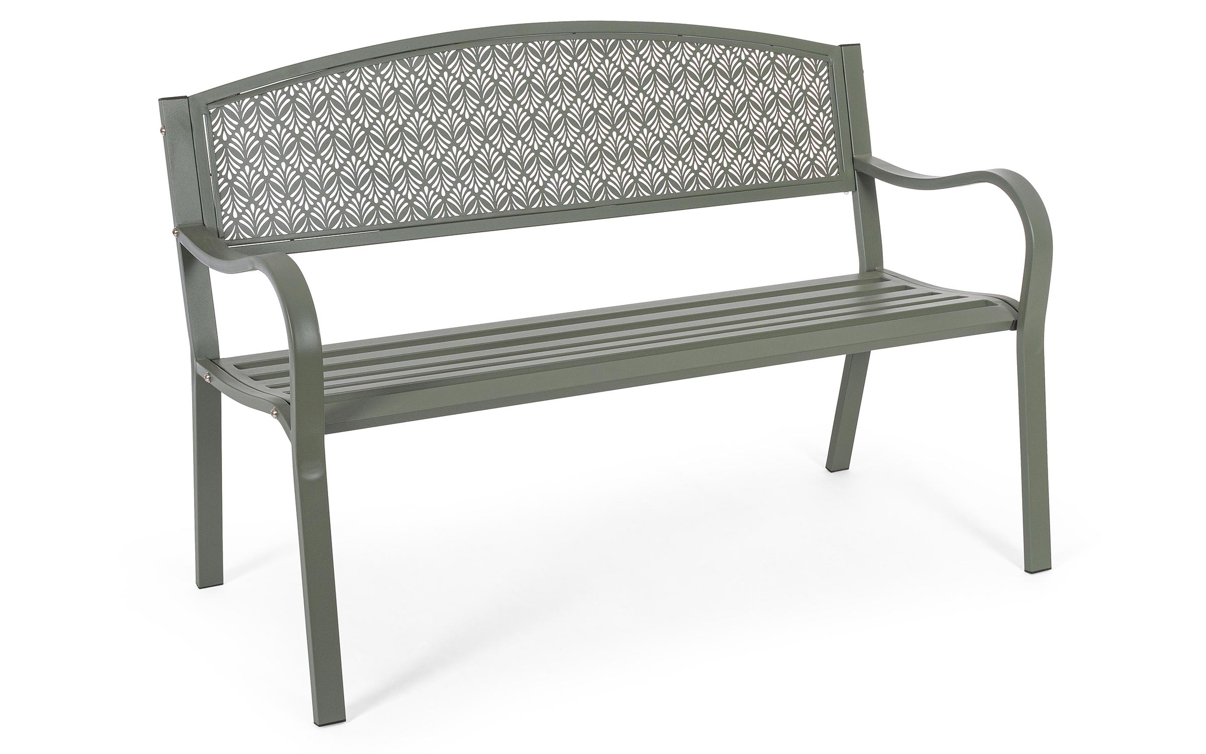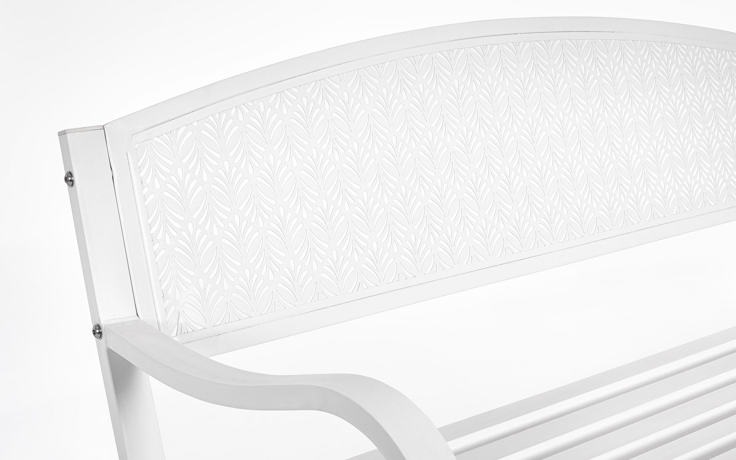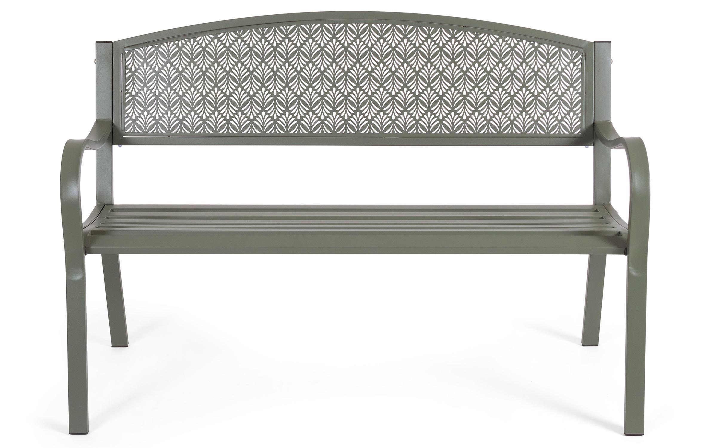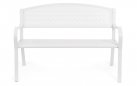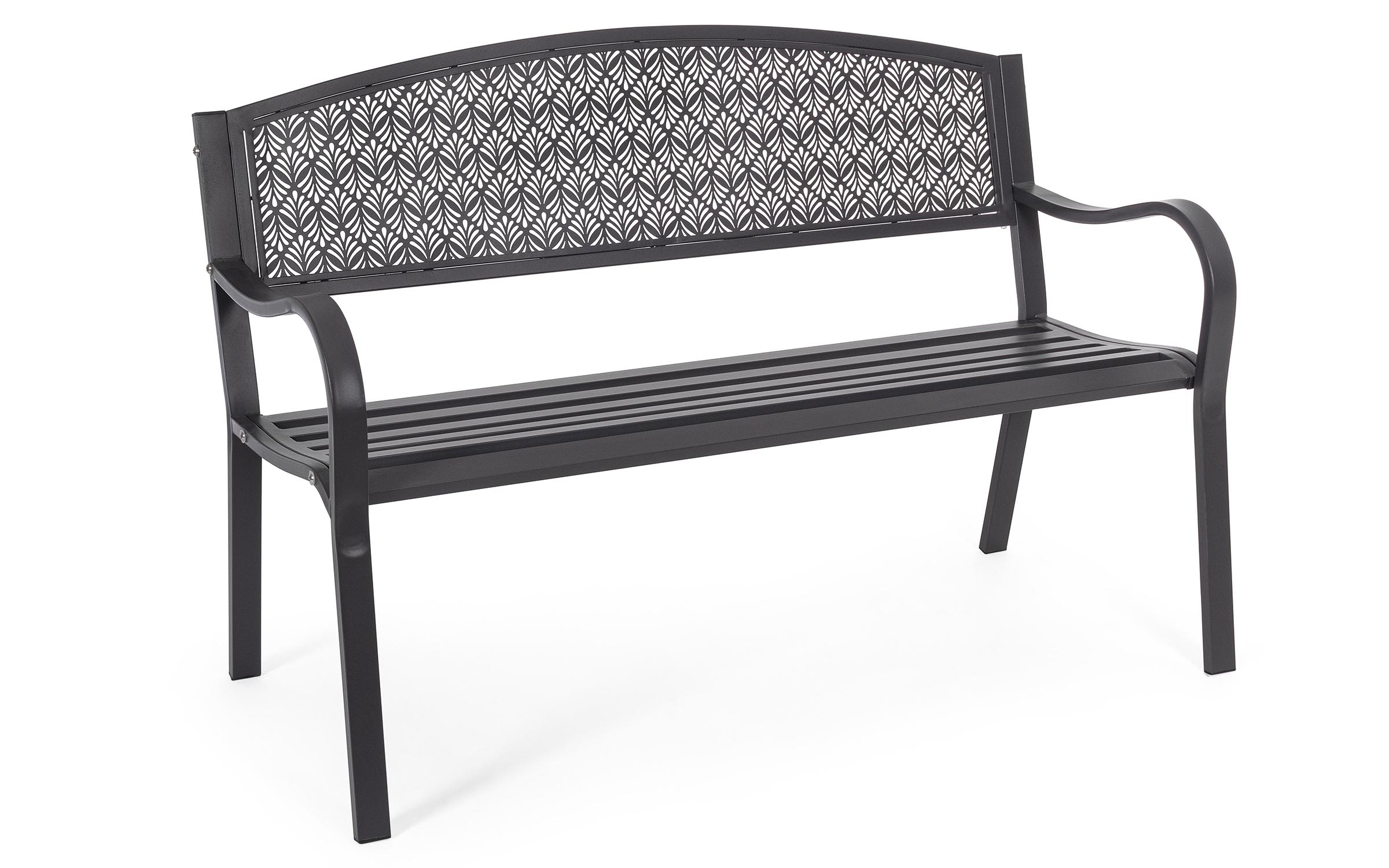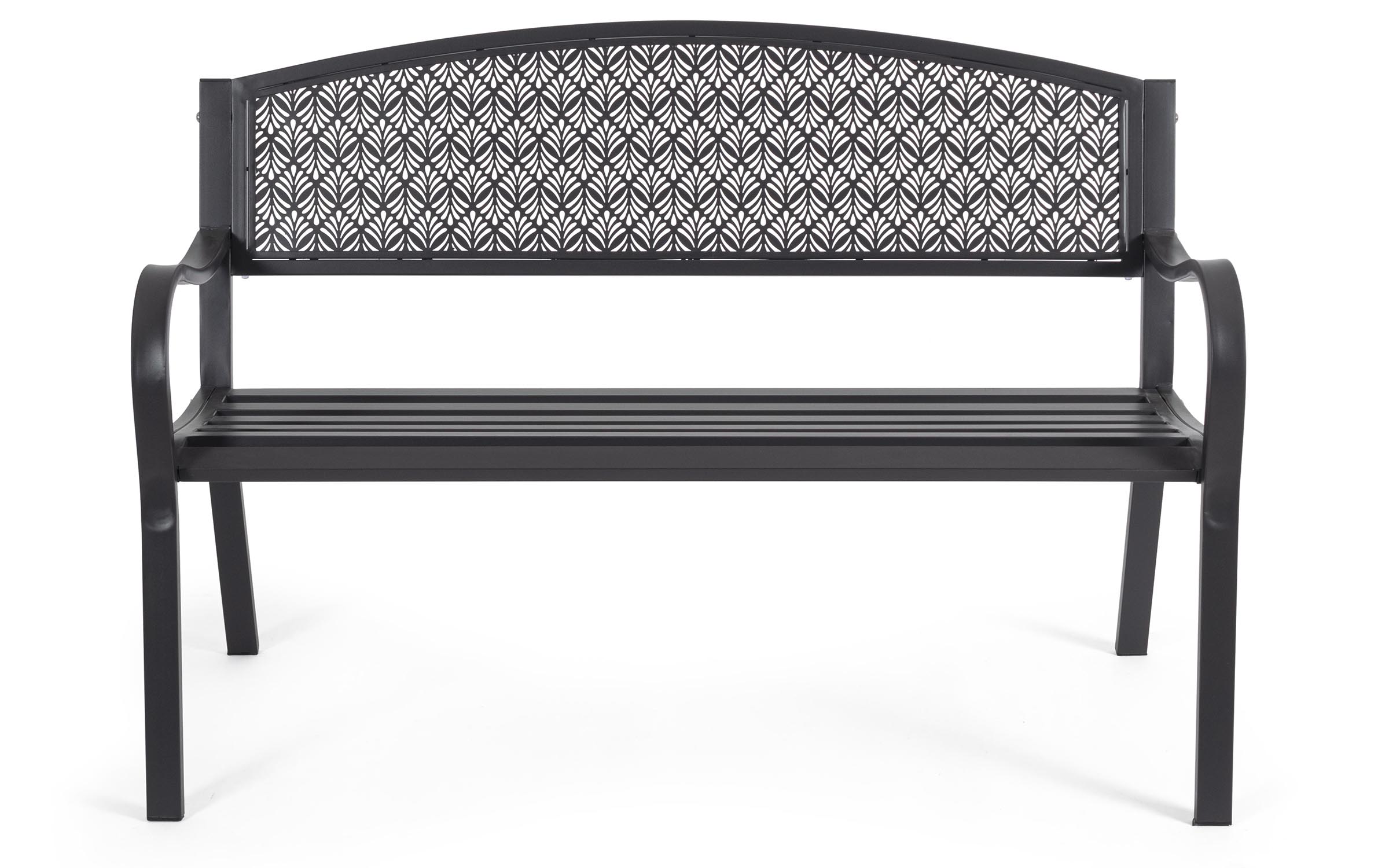 Metalowa ławka ogrodowa z podłokietnikami. Siedzenie z 'deseczek', natomiast oparcie z perforowanej ładnym wzorem blachy.