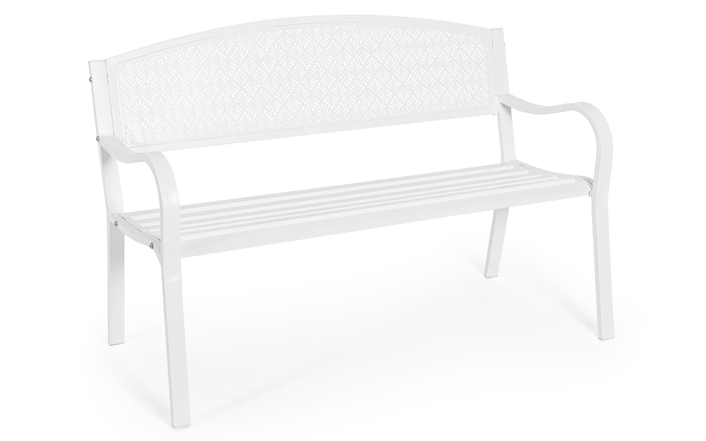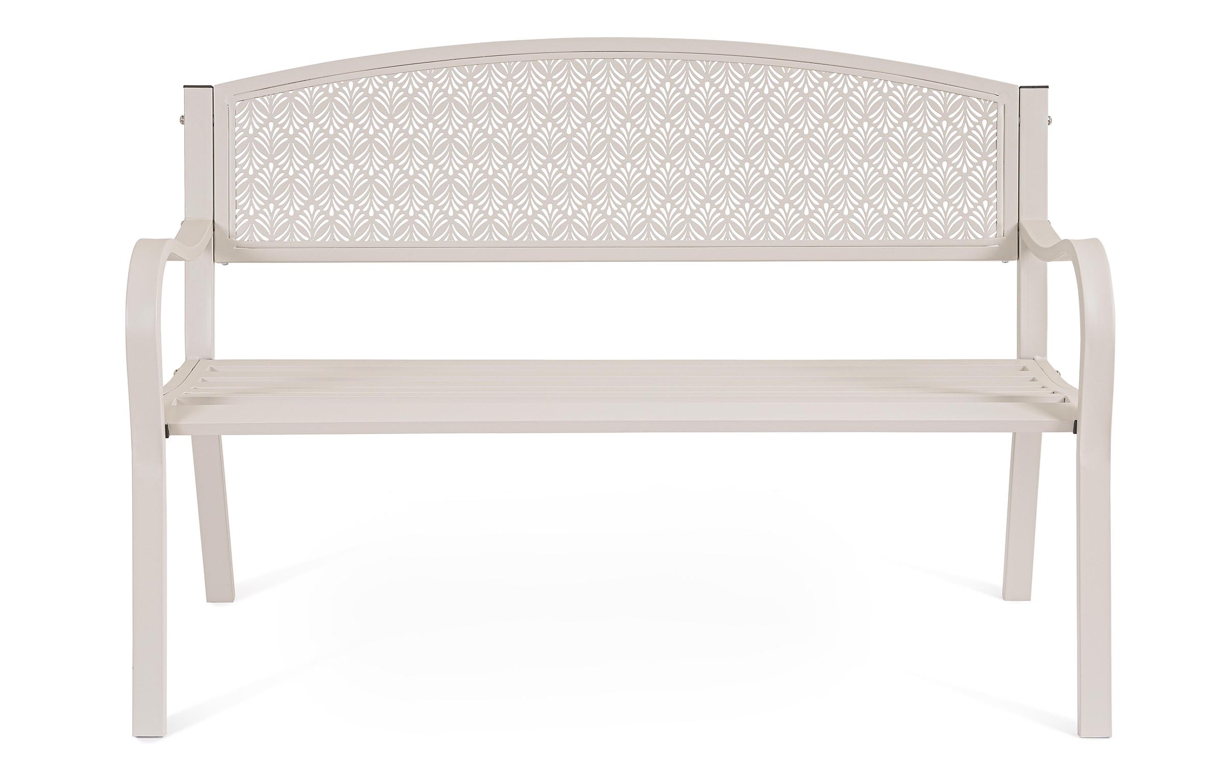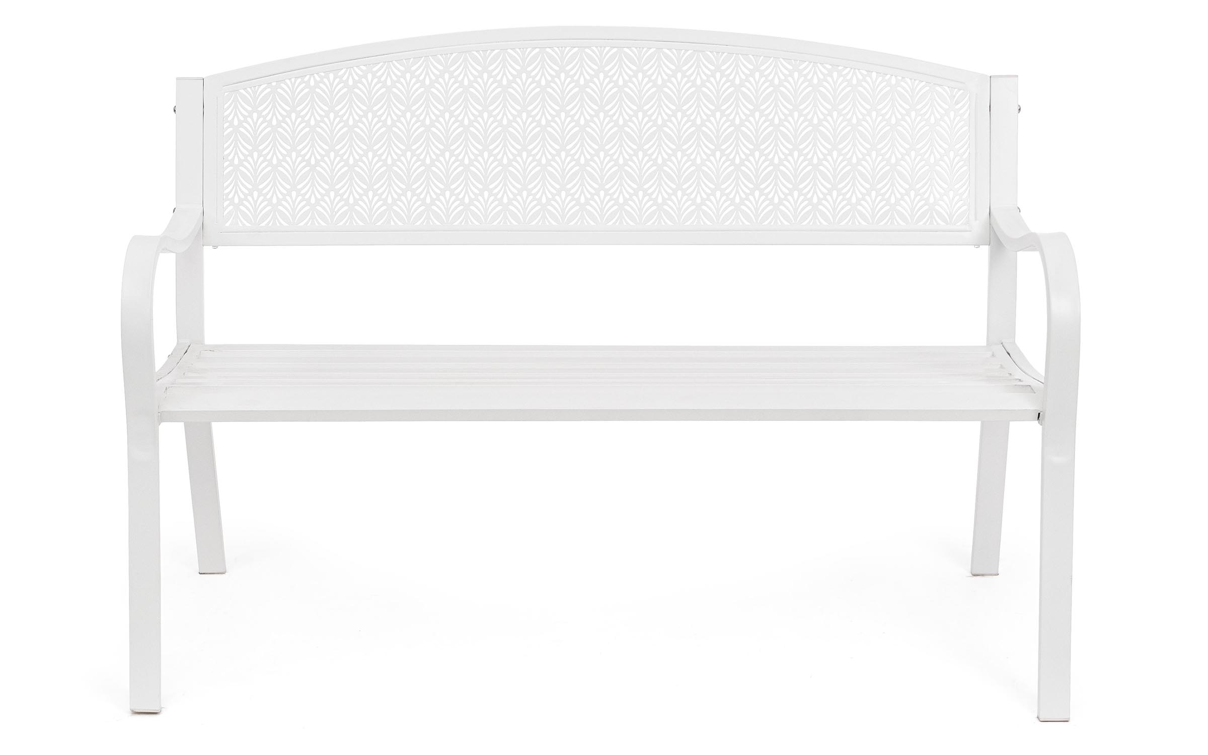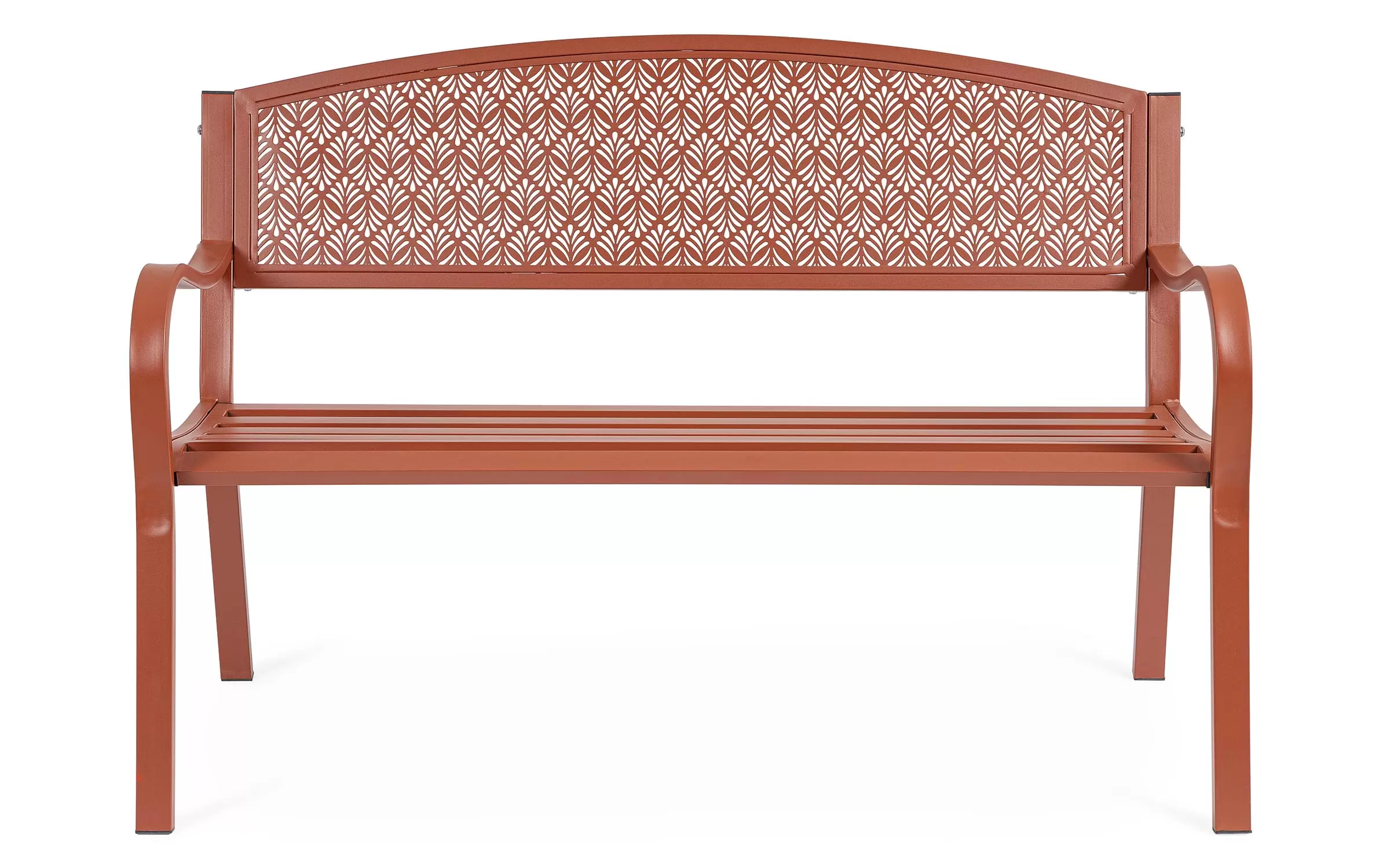 Metalowa ławka ogrodowa z podłokietnikami. Siedzenie z 'deseczek', natomiast oparcie z perforowanej ładnym wzorem blachy.