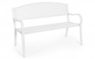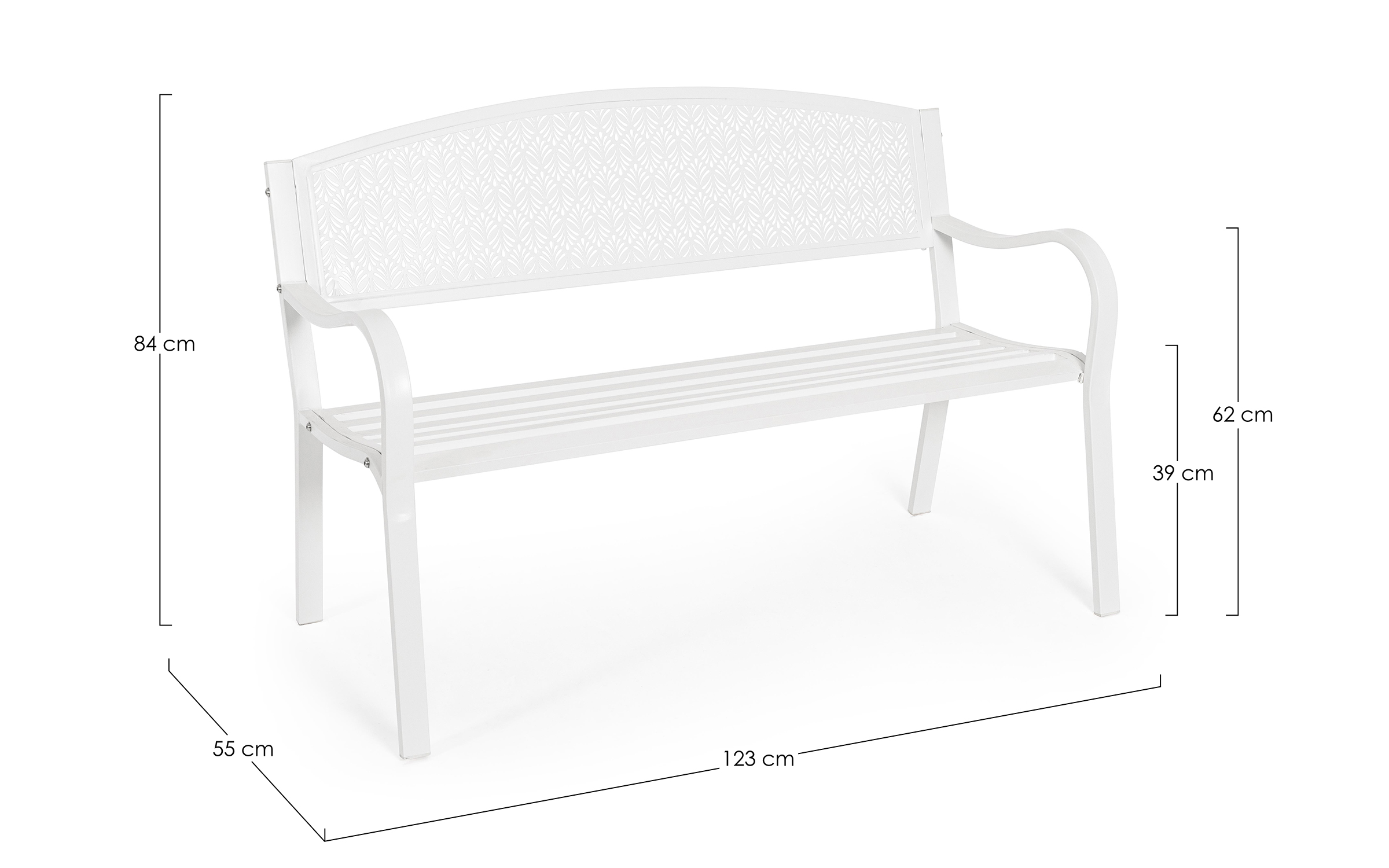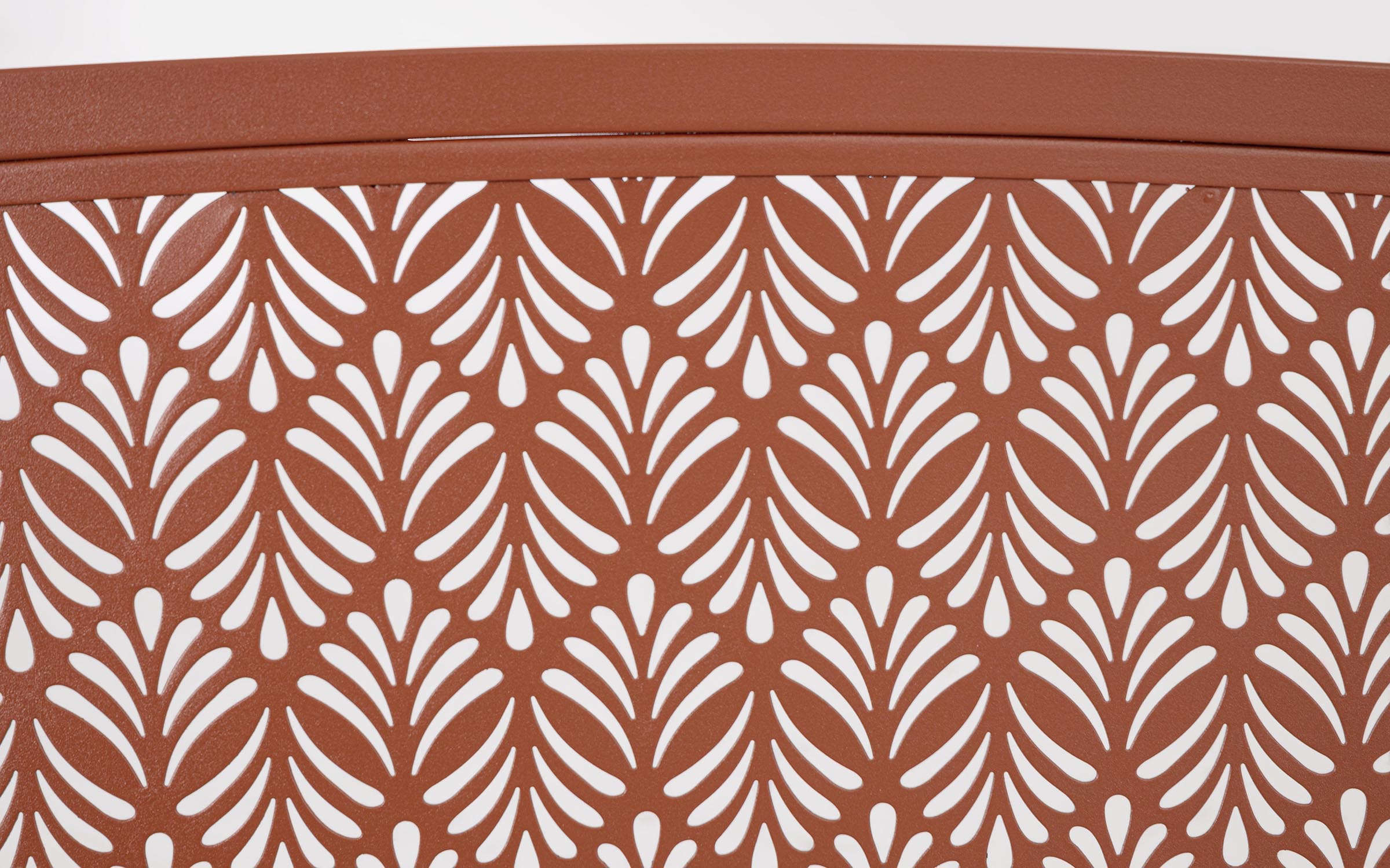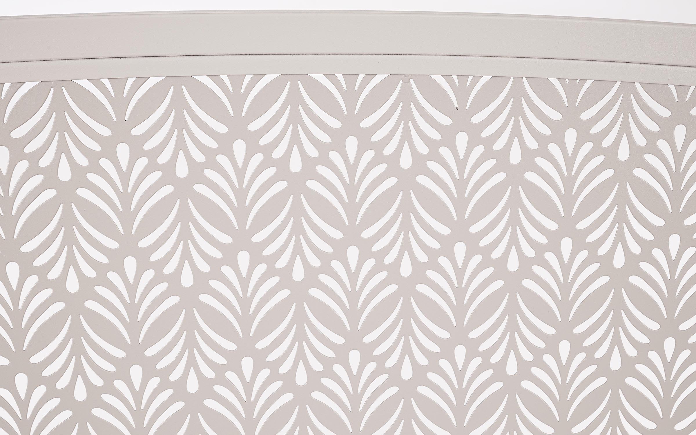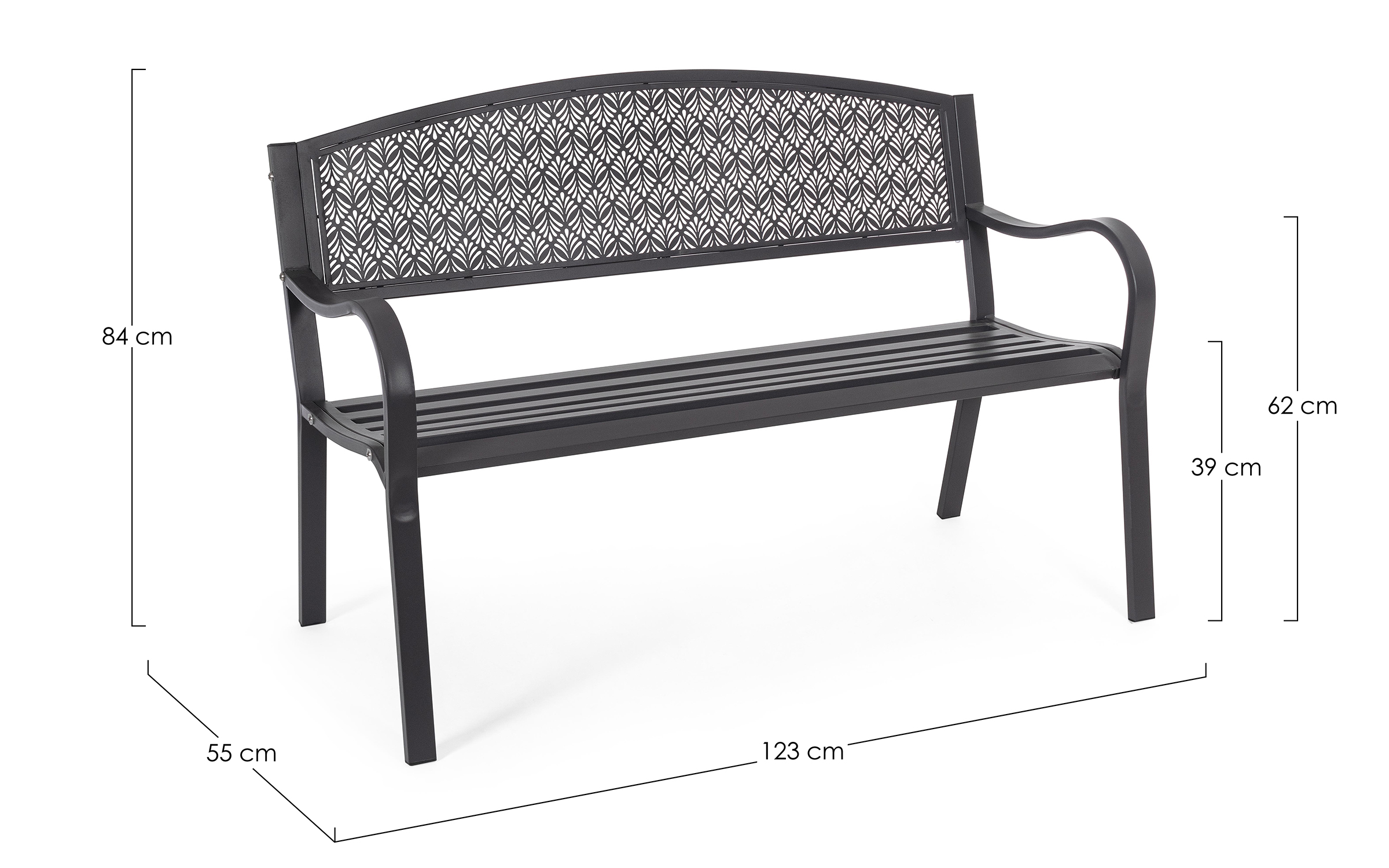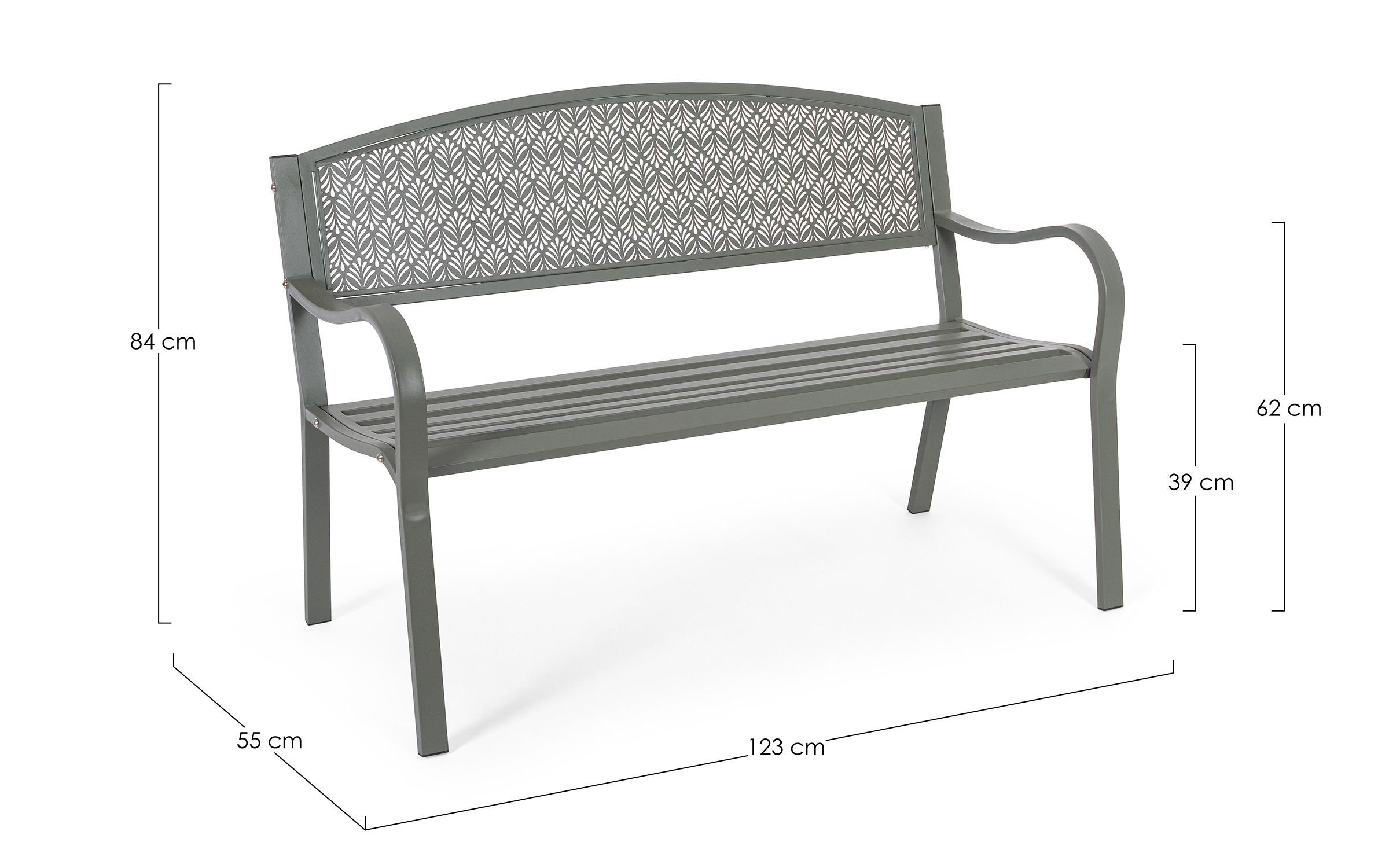 Metalowa ławka ogrodowa z podłokietnikami. Siedzenie z 'deseczek', natomiast oparcie z perforowanej ładnym wzorem blachy.