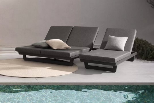 Nowoczesne łóżko / głęboka sofa na taras / czarna aluminiowa konstrukcja / boki z pasów polipropylenowych grube poduszki w kolorze szarym