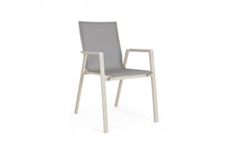 Nowoczesnye sztaplowane krzesło ogrodowe o aluminiowej konstrukcji z profilowanym siedziskiem z tekstyliny.