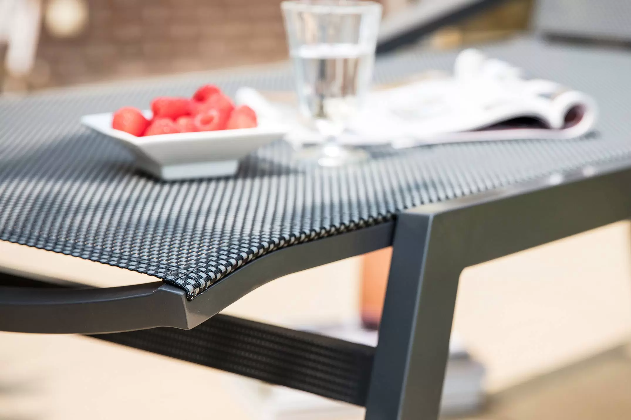 Aluminiowa konstrukcja malowana proszkowo w kolorze ciemnoszarym. Na siedzisku i oparciu pod poduszkami gęsta tekstylina.