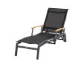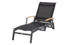 Leżak ogrodowy ALICE to komfortowy mebel wypoczynkowy do ogrodu, na taras lub przy basenie. Aluminiowa rama w kolorze antracytowym, siedzisko z napiętej tekstyliny oraz podłokietniki z certyfikowanego drewna teak tworzą trwałą i elegancką konstrukcję. Oparcie regulowane w 5 pozycjach pozwala na pełen relaks, a kółka ułatwiają przesuwanie leżaka.