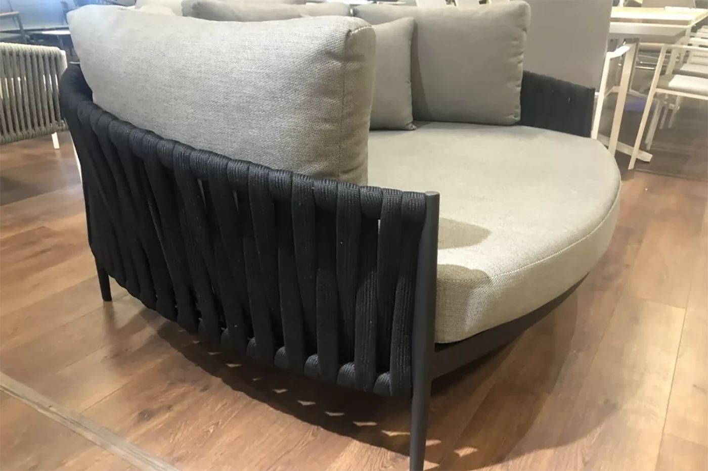 Łóżko ma elegancki czarny kolor konstrukcji aluminiowej, prawie czarne boki z liny polipropylenowej i wygodne szybkoschnące poduszki z szarymi poszewkami z materiału do użytku na zewnątrz Olefin.