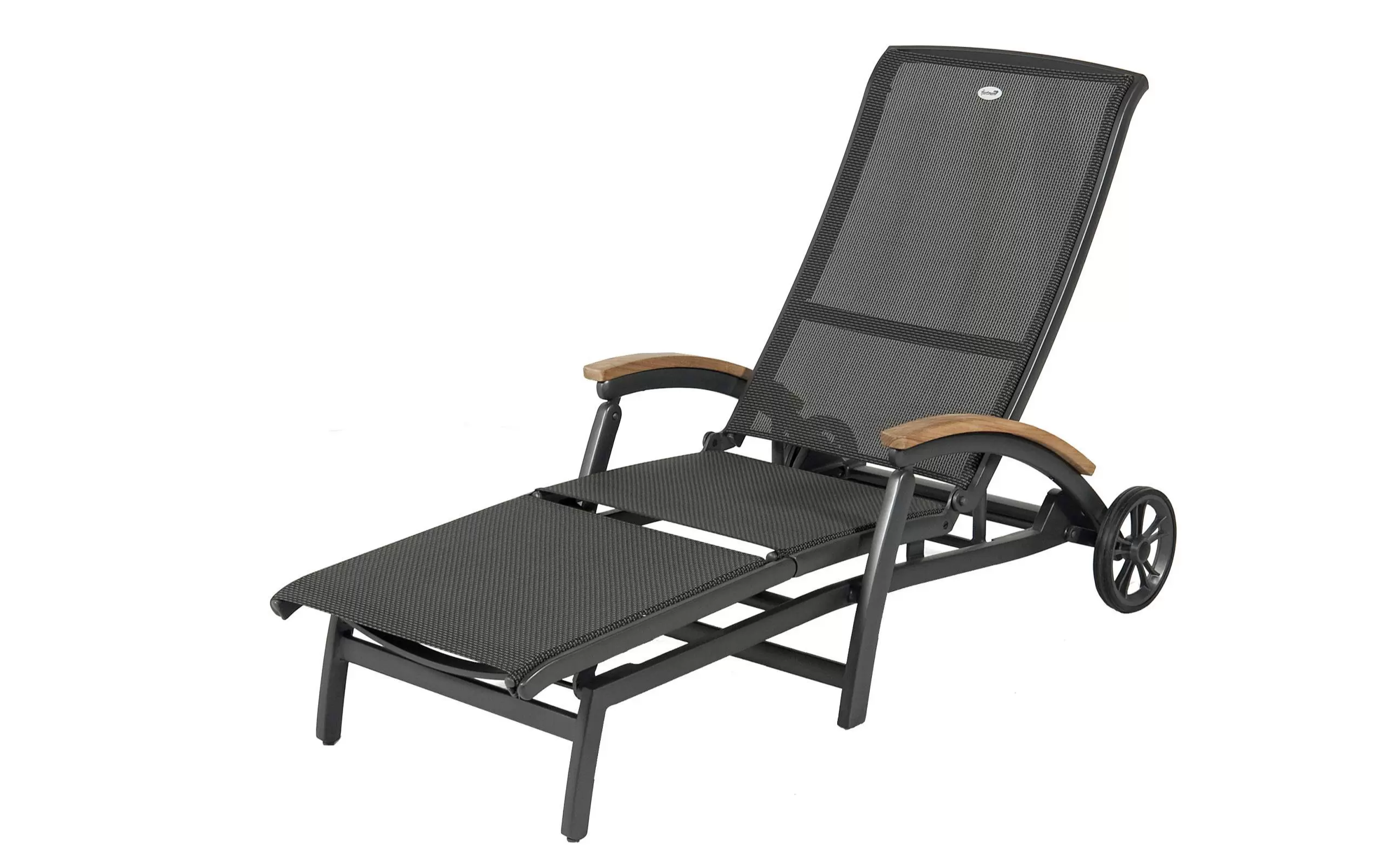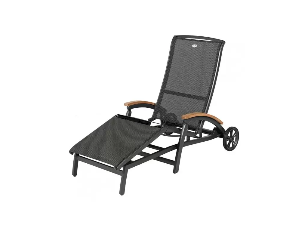 Leżak umożliwia opalanie i relaks w ogrodzie, na tarasie lub bezpośrednio przy basenie. Możesz położyć ręce na podłokietnikach z drewna tekowego, oparcie posiada pięciostopniową regulacje, a siedzisko można załamywać 3-stopniowo.