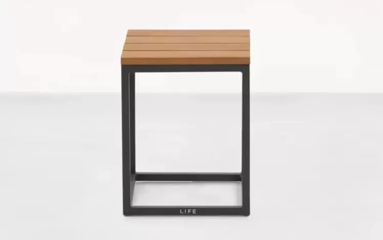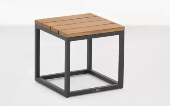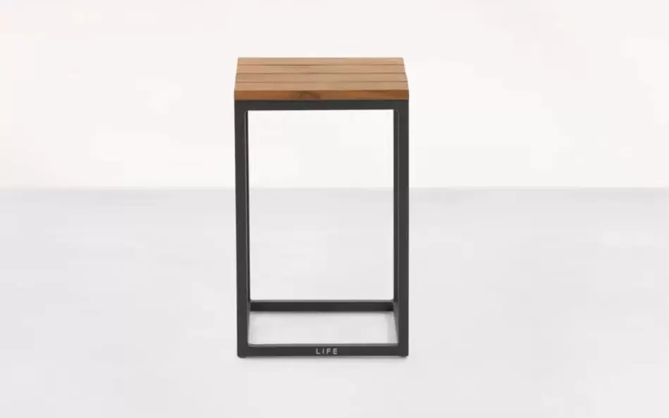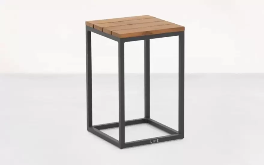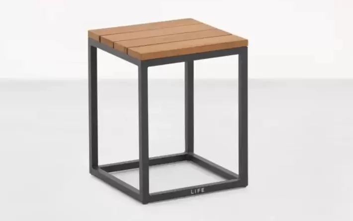Stolik kawowy Gili z blatem tekowym idealny do uzupełnienia wyposażenia tarasu, ogrodu lub balkonu. Aluminiowa konstrukcja w kolorze grafitowym lub białym z blatem z deseczek z drewna teak premium. Może służyć jako miejsce na kwiaty doniczkowe, lampę, dekoracje lub dodatkowy blat do odkładania naczyń, elektroniki czy książek.