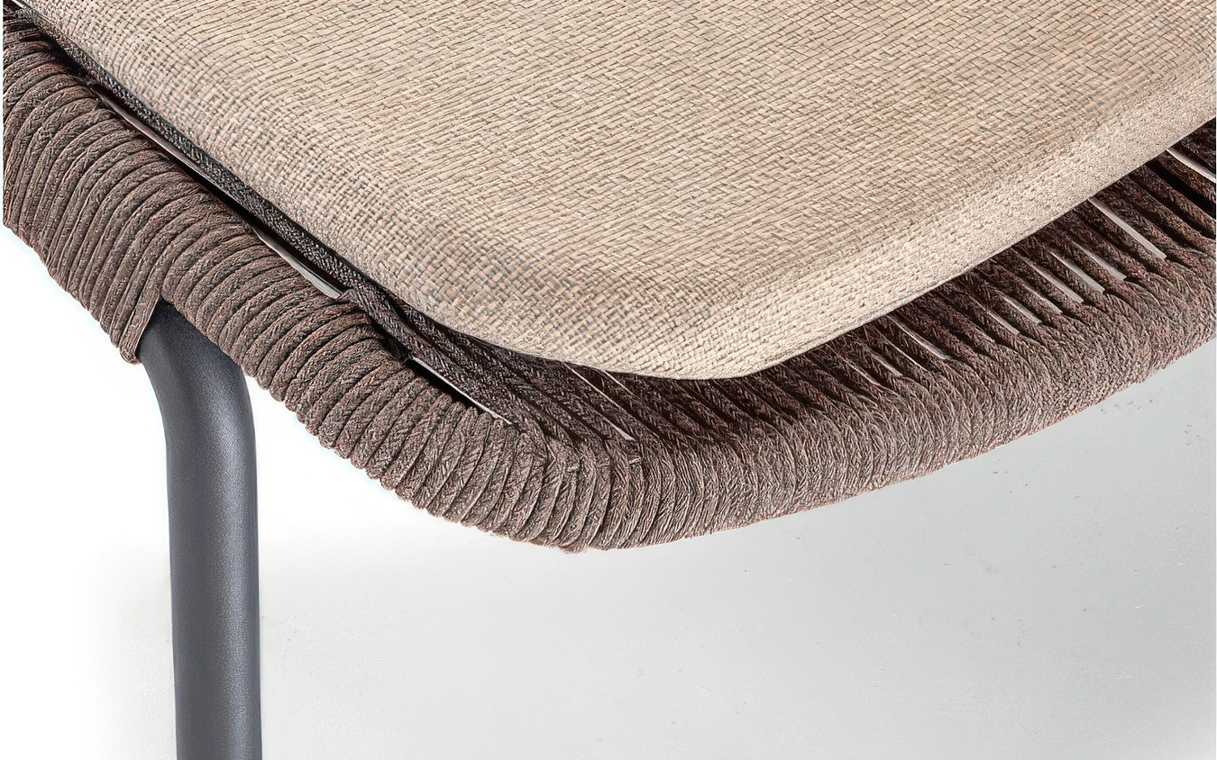 Rama wykonana jest z aluminium malowanego proszkowo, odpornego na korozję i działanie czynników atmosferycznych. Siedzisko pokrywa lina textilene Ø 6 mm, która zapewnia wysoką odporność na UV, wilgoć i intensywne użytkowanie.