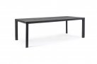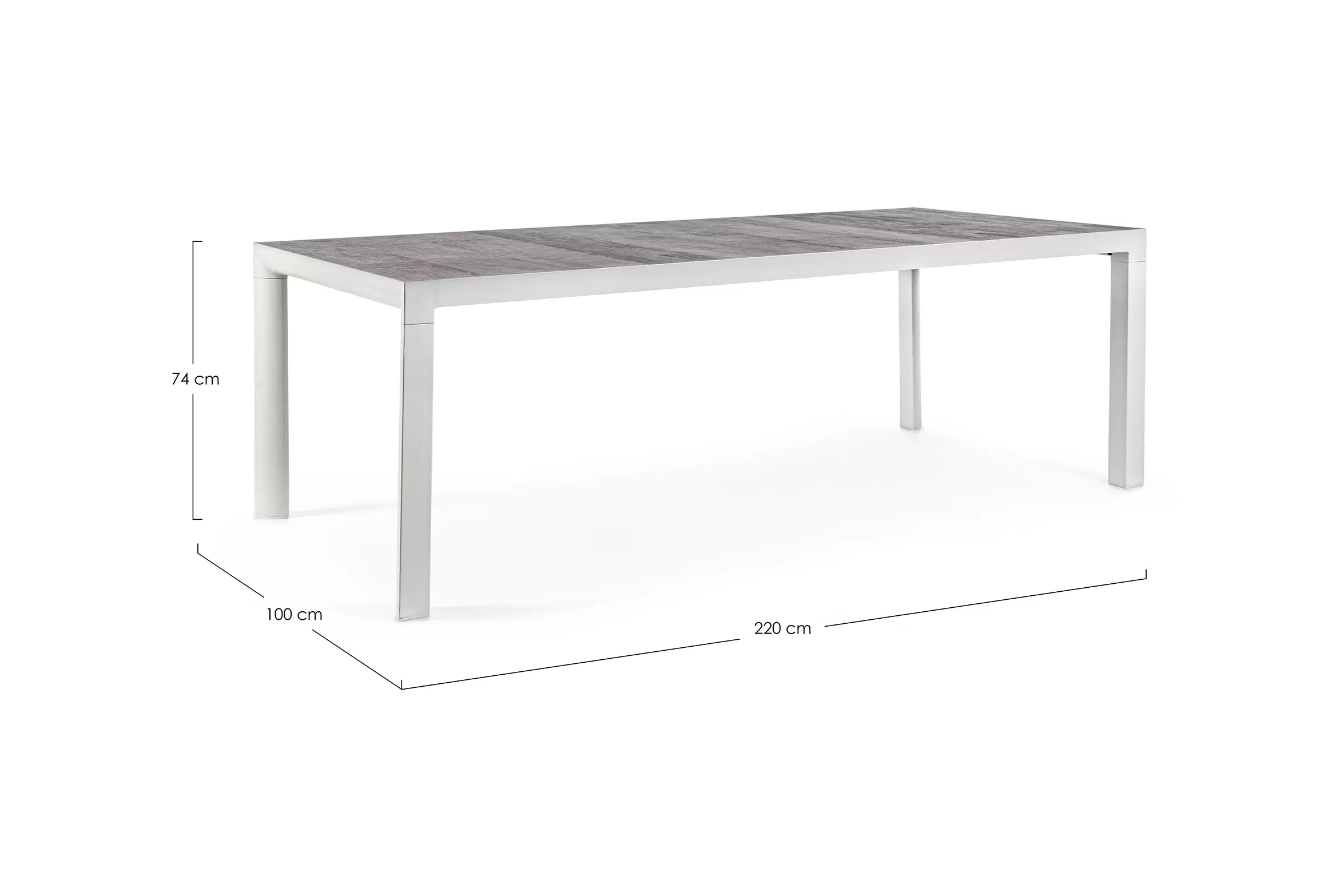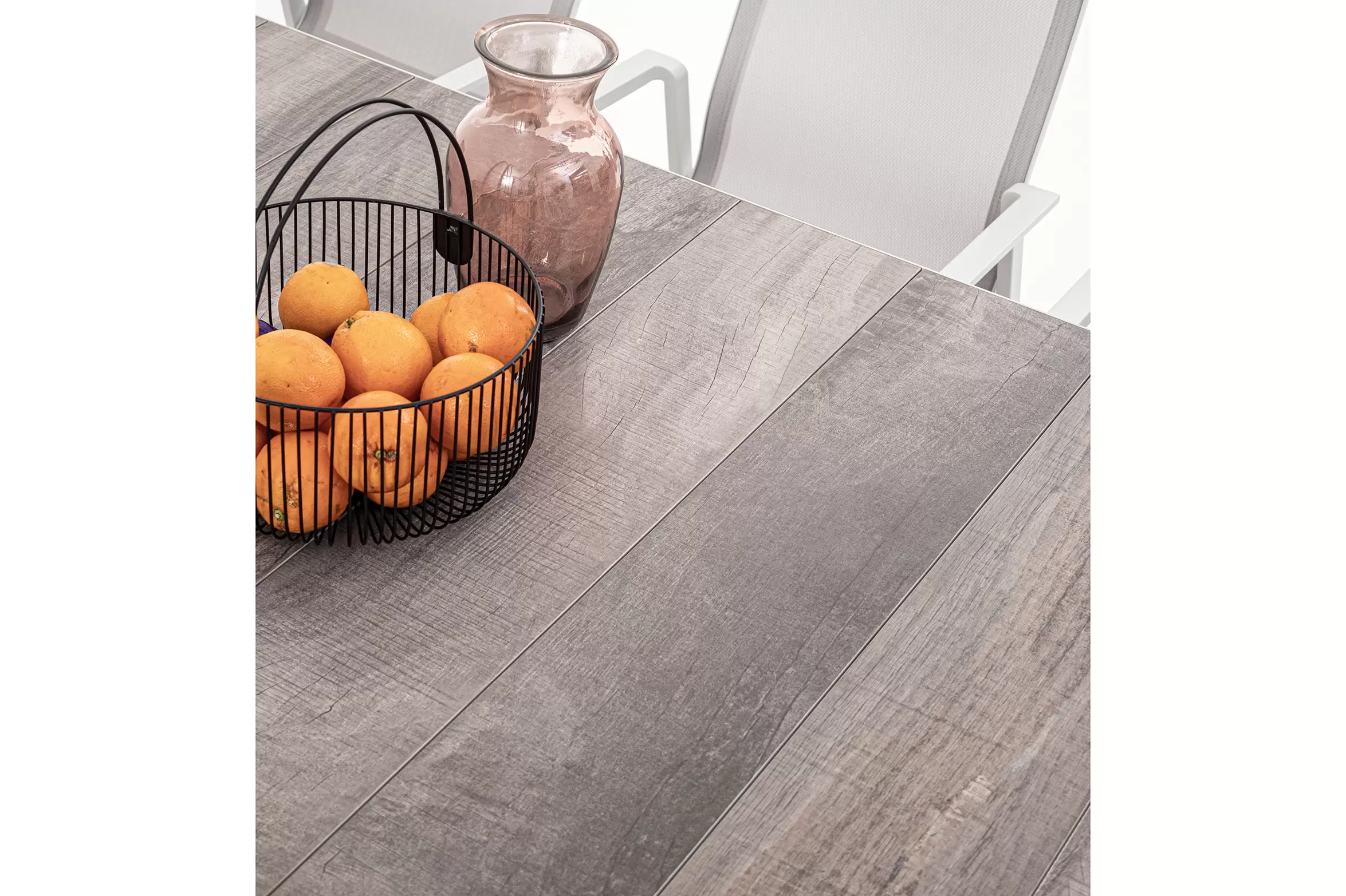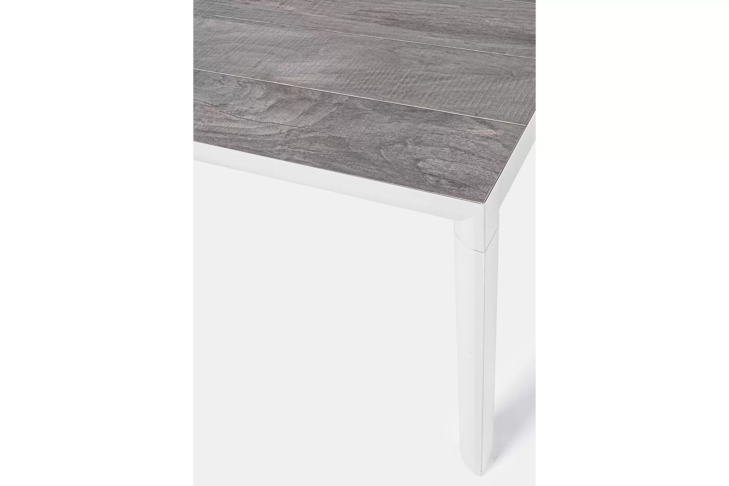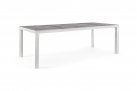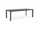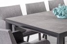 Stół do ogrodowej jadalni 220x100 cm z blatem z 4 paneli ceramicznych z wykończeniem imitującym drewnianą poszarzoną powierzchnię.