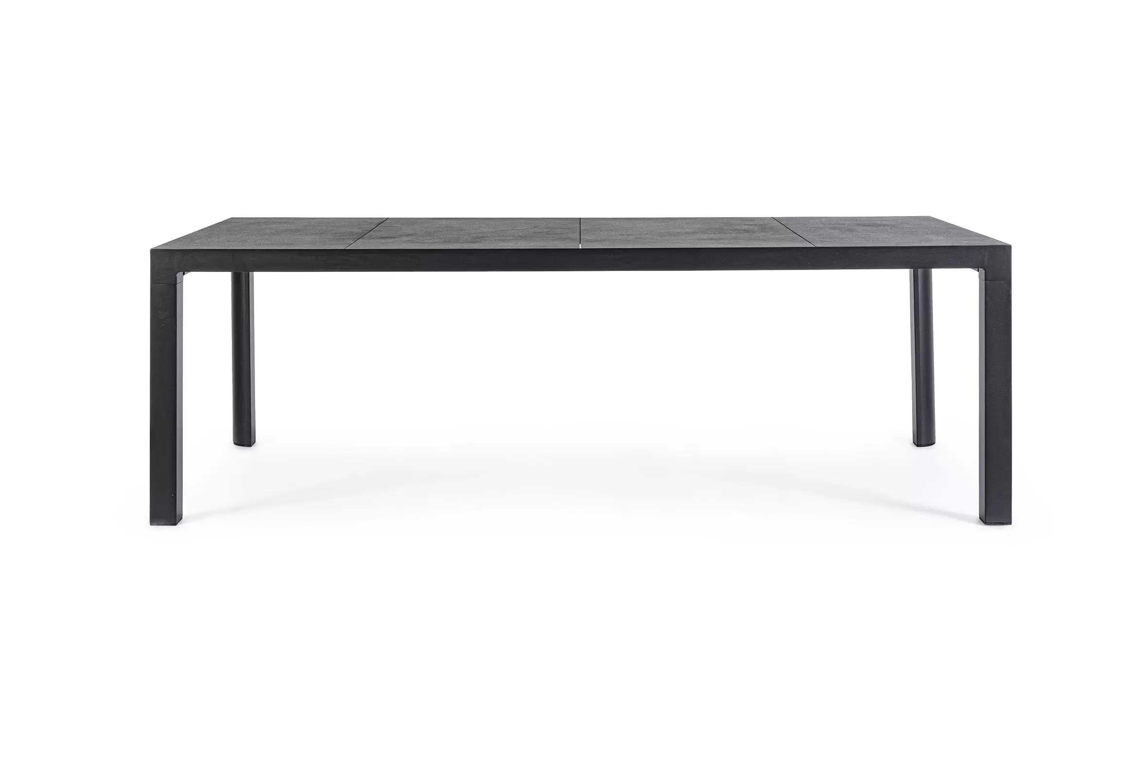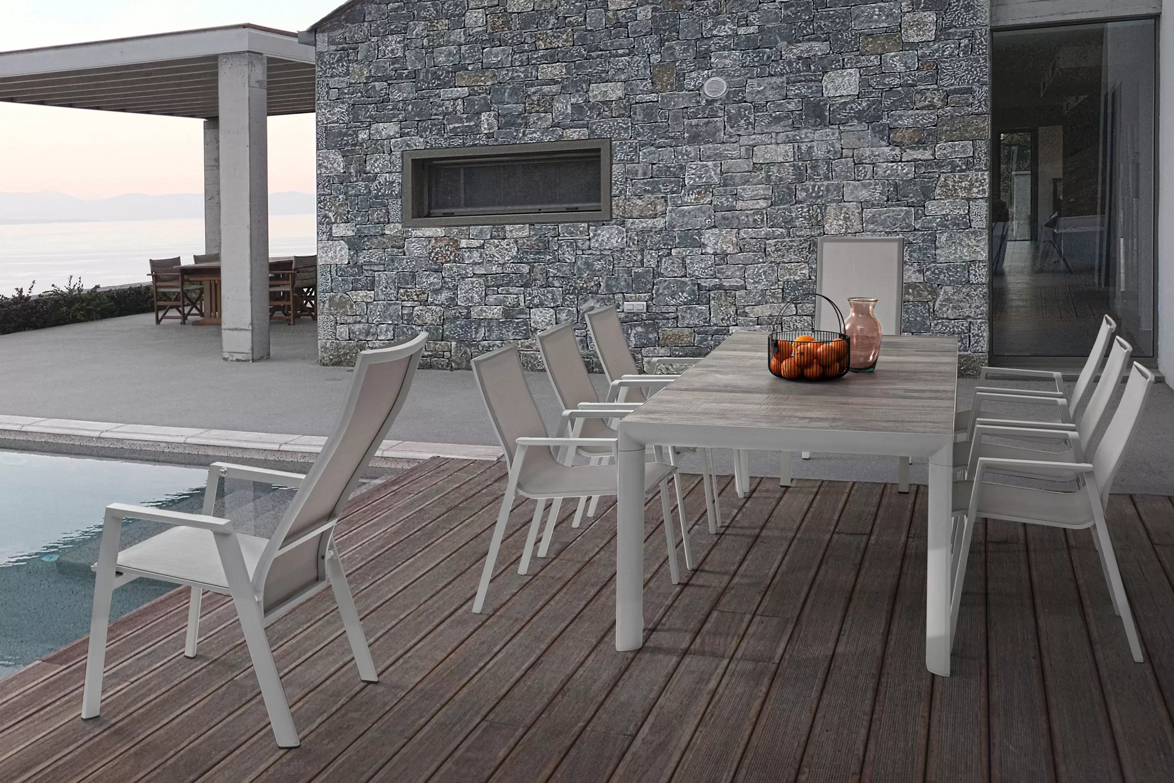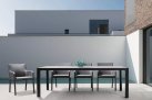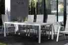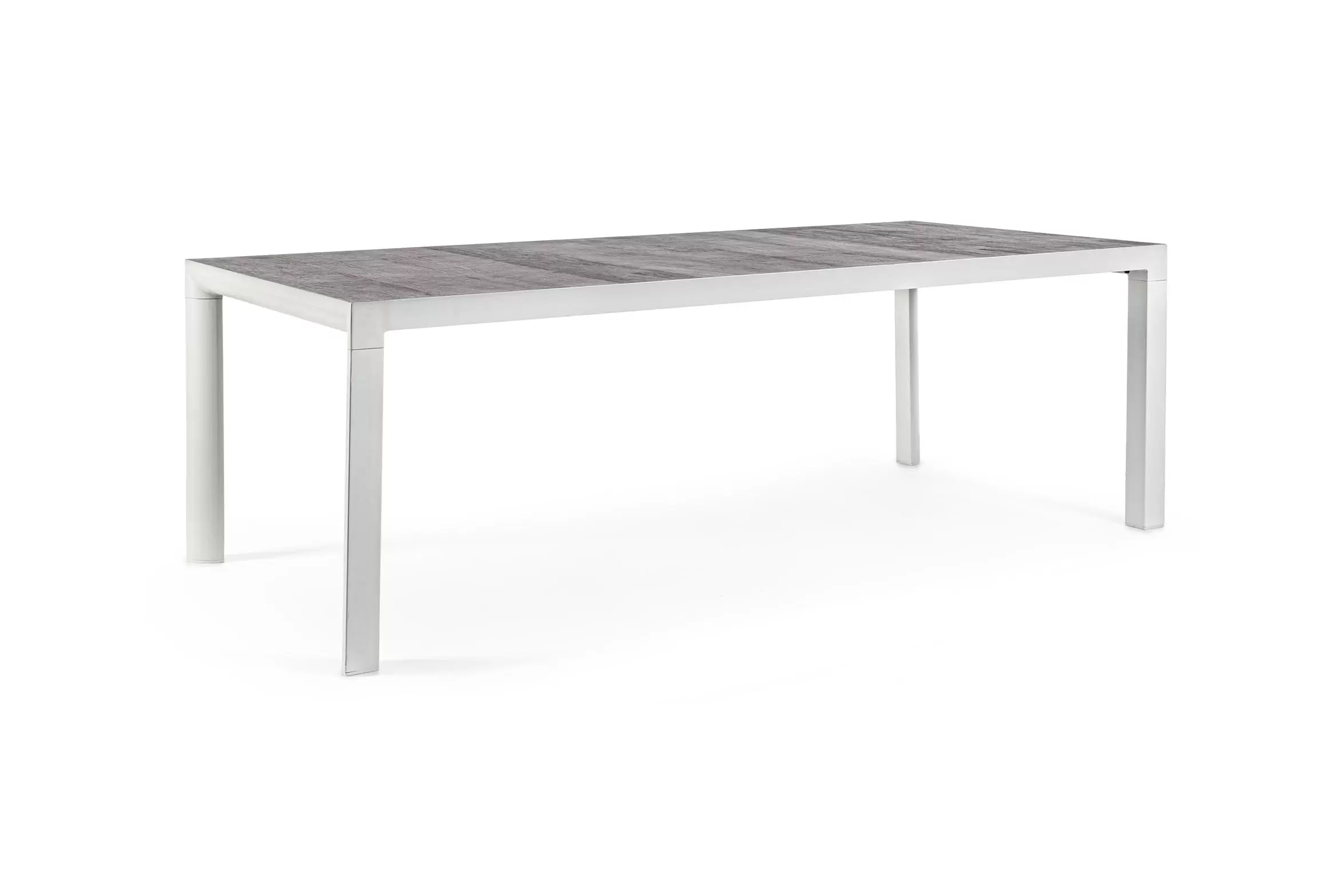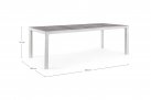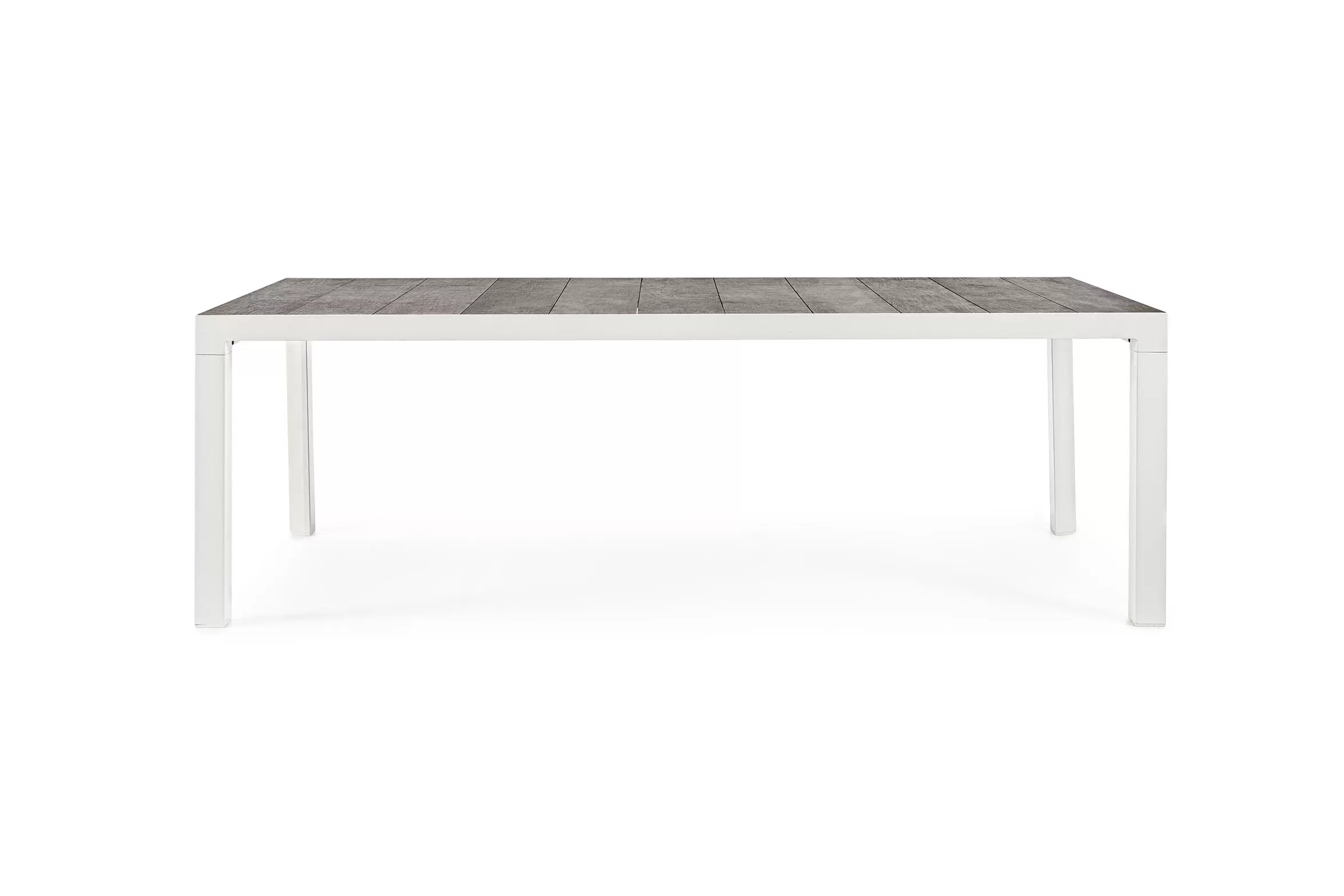 Stół do ogrodowej jadalni 220x100 cm z blatem z 4 paneli ceramicznych z wykończeniem imitującym drewnianą poszarzoną powierzchnię.