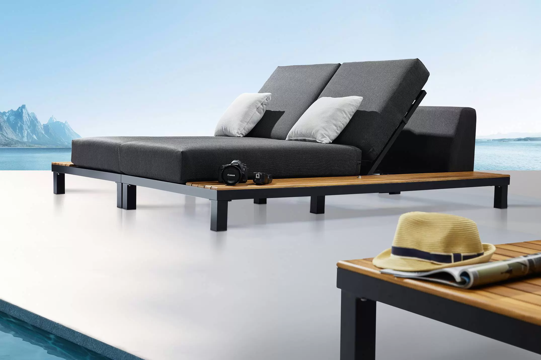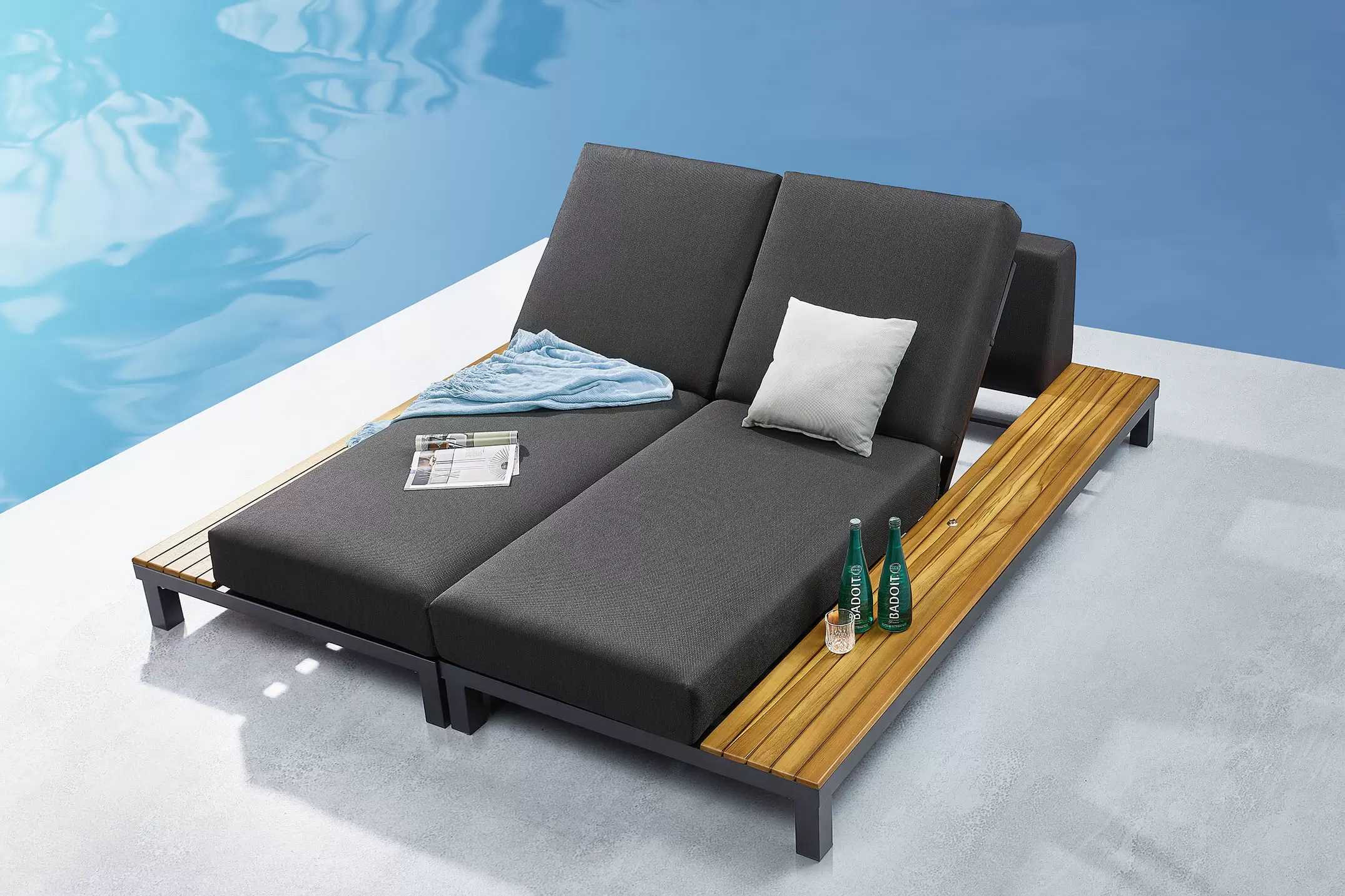 W skład zestawu wchodzą 2 leżaki o symetrycznym ustawieniu, mające po bokach wzdłuż całej długości stolik z blatem z drewna teak. Razem tworzą obszerne łóżko z grubymi wygodnymi poduszkami i regulowanym kilkustopniowo oparciem.