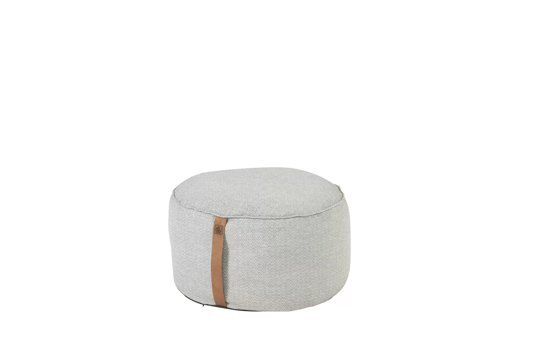 Pufa okrągła wykonana z odpornej na warunki atmosferyczne tkaniny Olefin.; Pufa ma wypełnienie, które doskonale nadaje się do użytku na zewnątrz. Skórzany pasek dopełnia luksusowy charakter tej pufy.