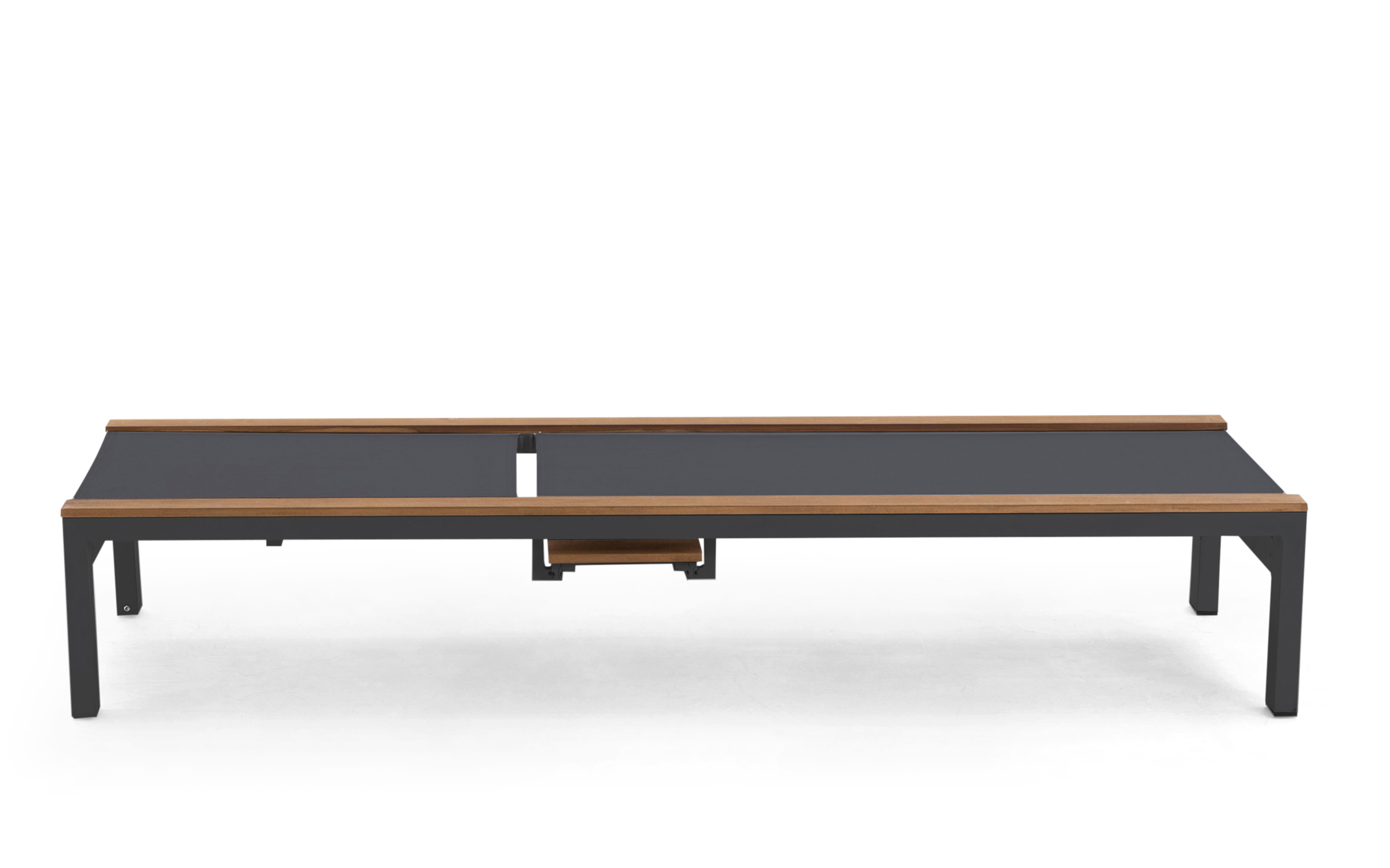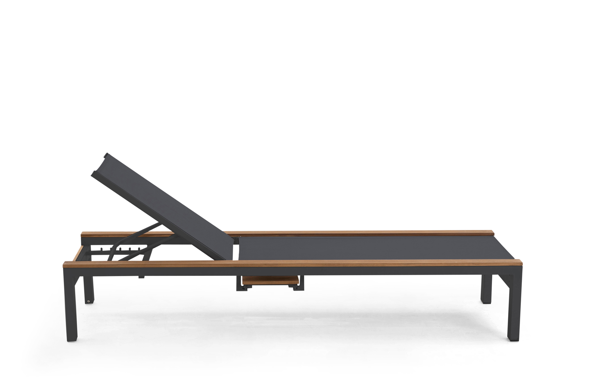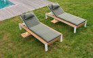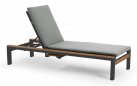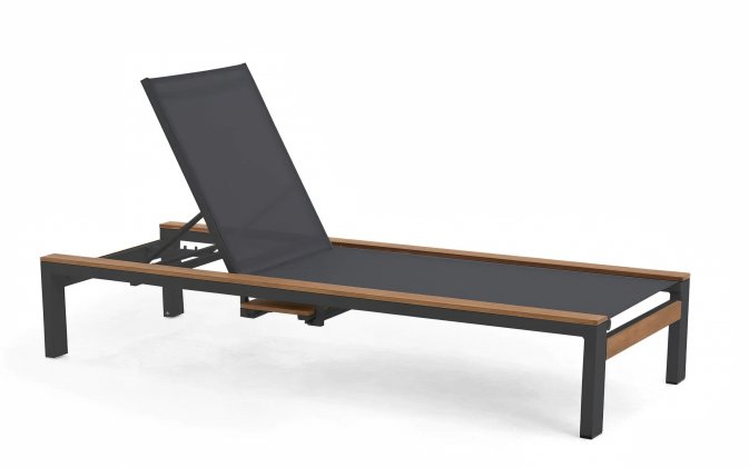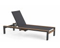 Ekskluzywny leżak z kółkami do łatwego przemieszczania oraz siedziskiem z tekstyliny oraz ciekawymi dodatkami z drewna teakowego barwionego na lekko miodowy kolor..