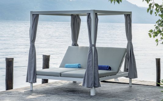 Duże łóżko ogrodowe z baldachimem i zasłonami / konstrukcja aluminiowa kolor biały / poducha wodoodporna PVC jasnoszara / dach z białej tekstyliny / zasłony jasnoszare Łóżko: 195d | 195s | 200w
