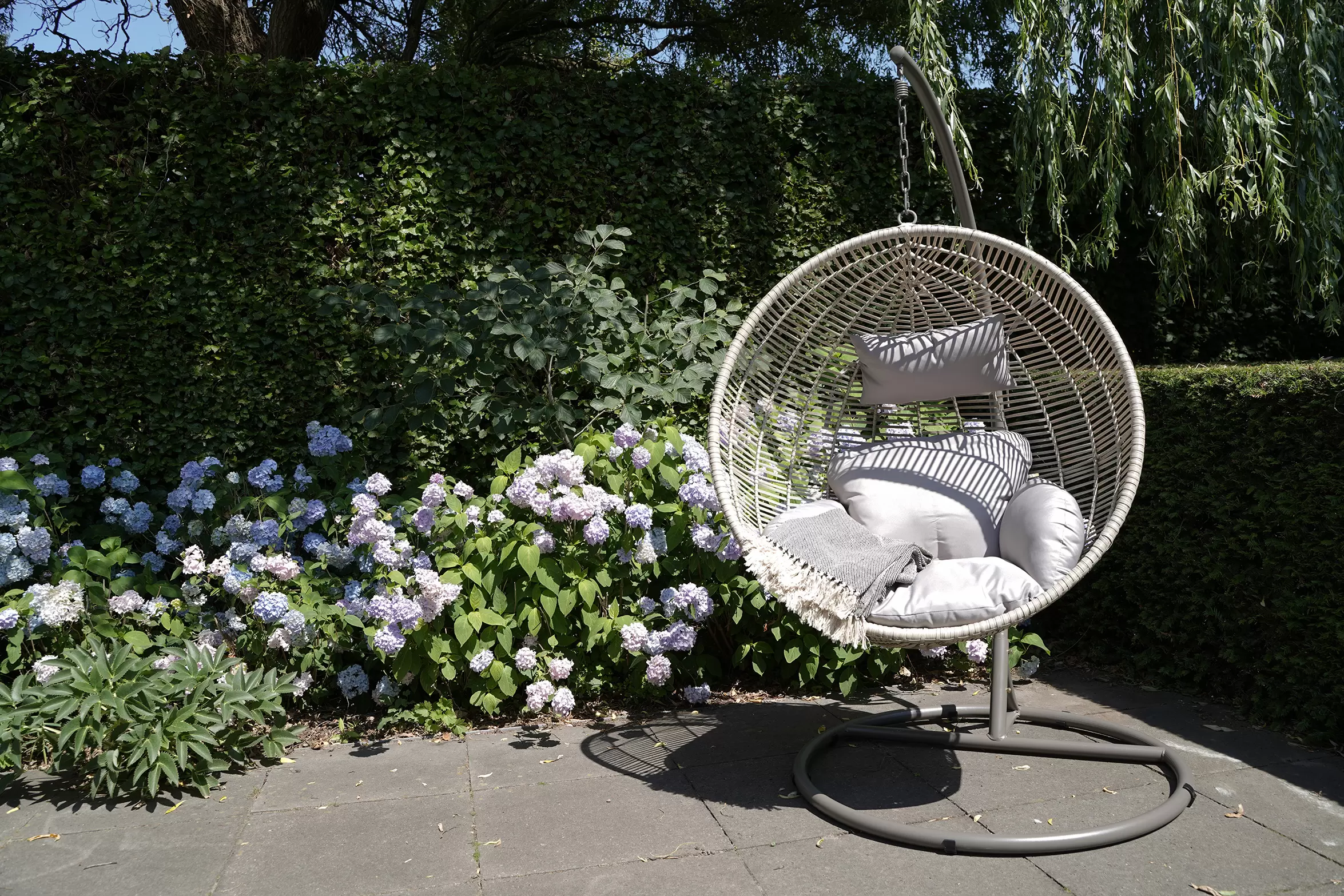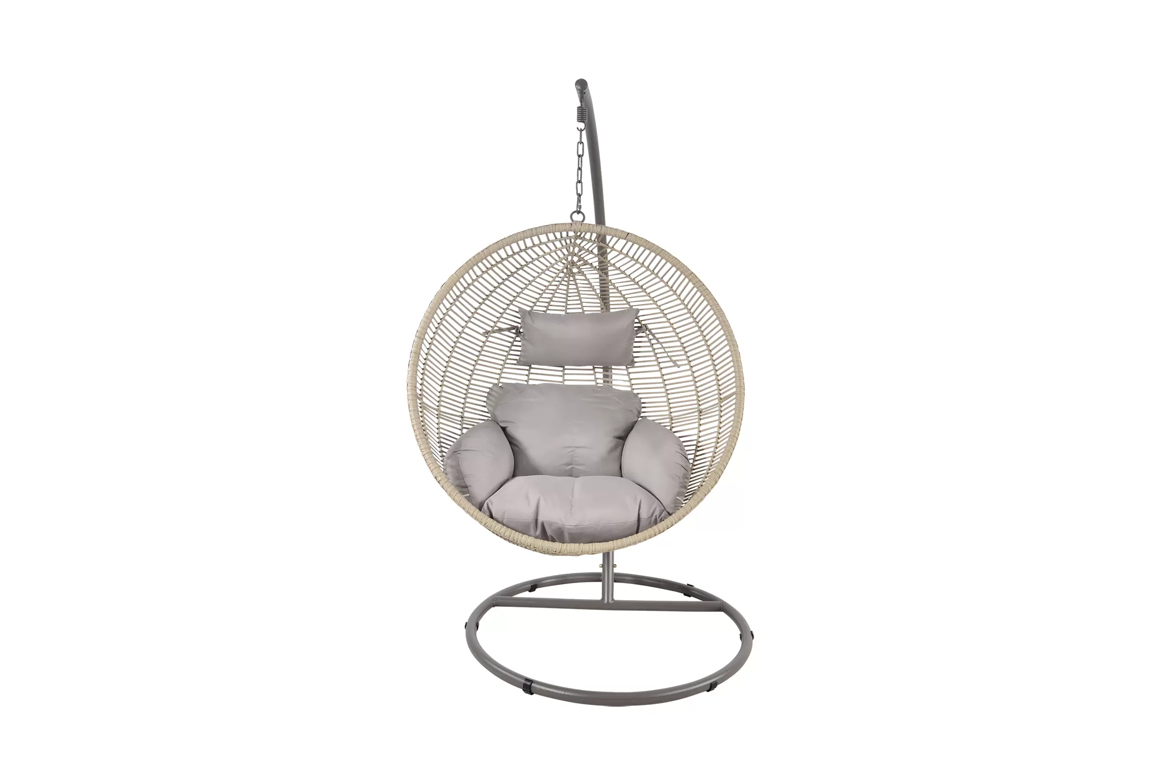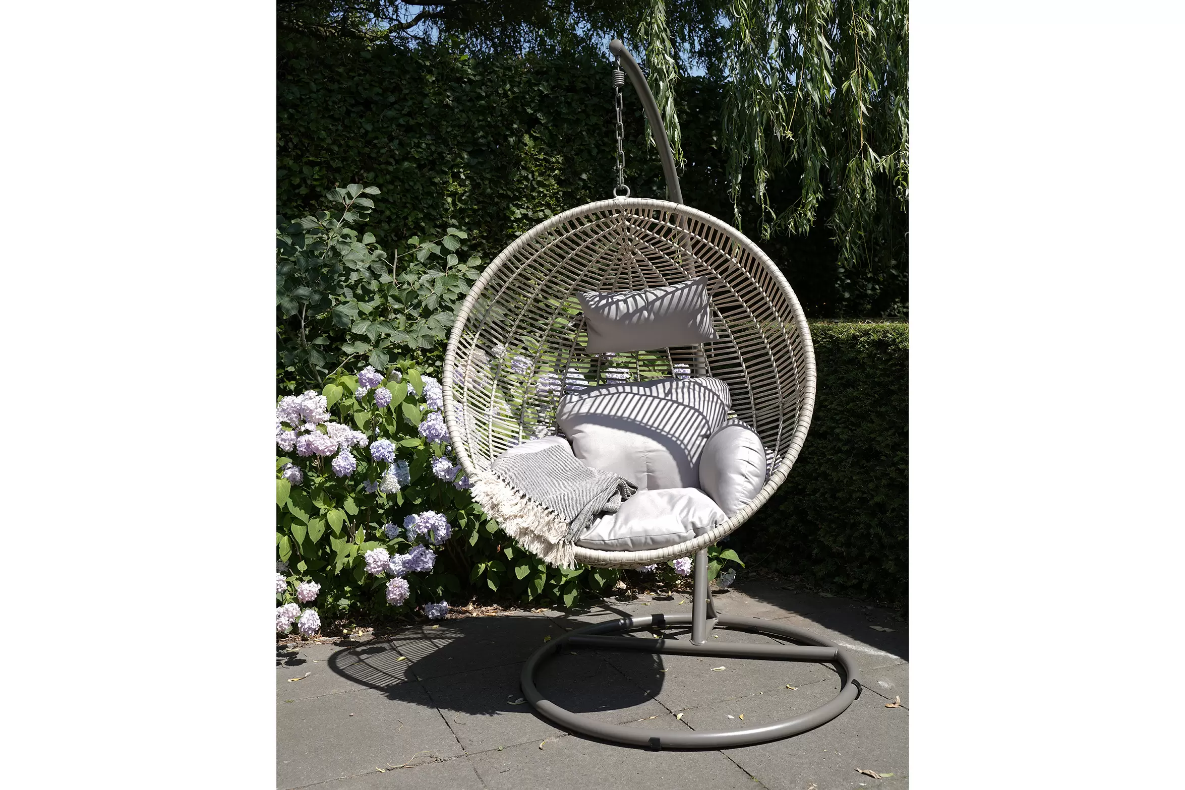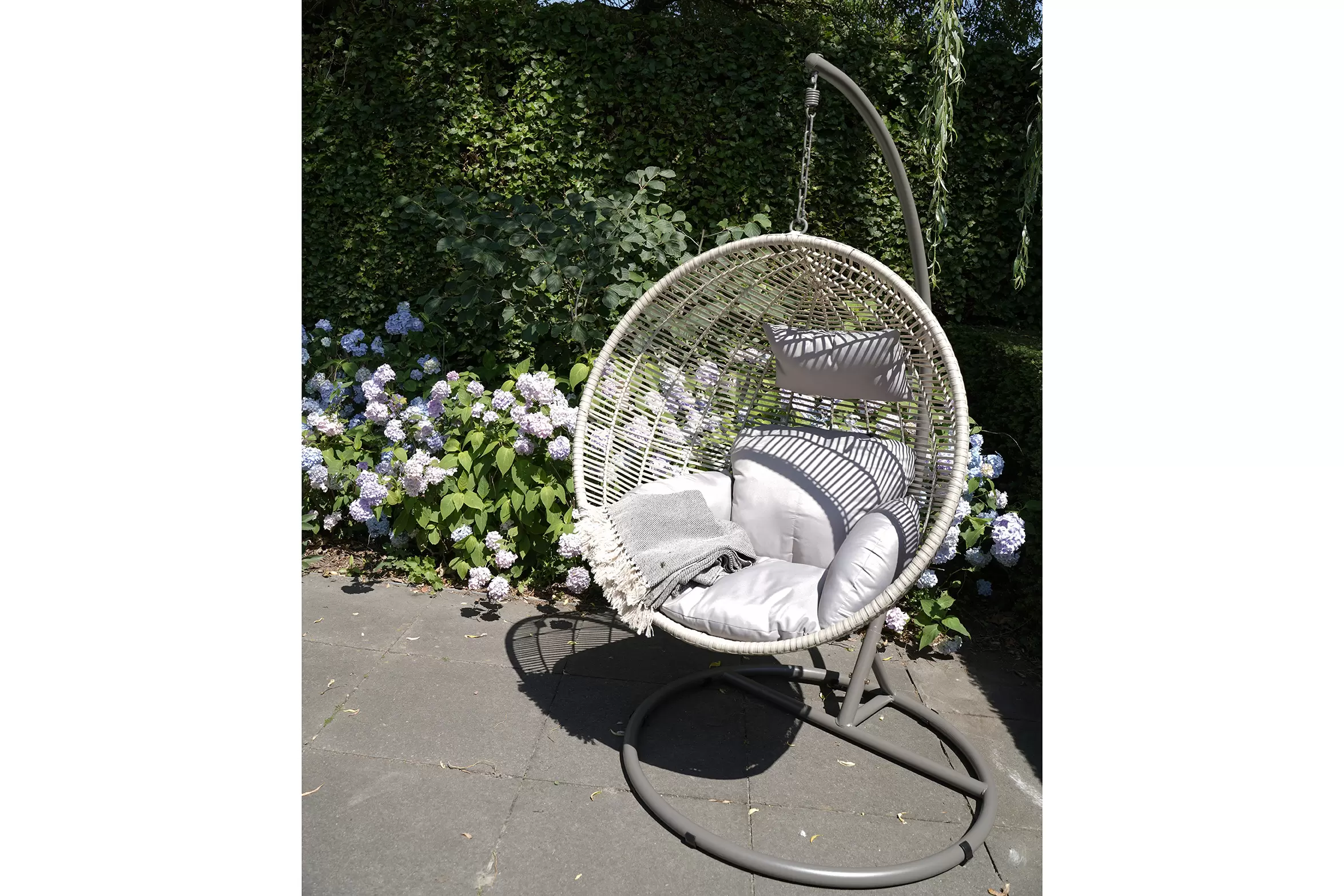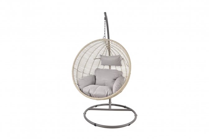 Huśtawka 1-osobowa typu kokon na stalowym stelażu. Siedzisko oplecione technorattanem. Wygodna poduszka.