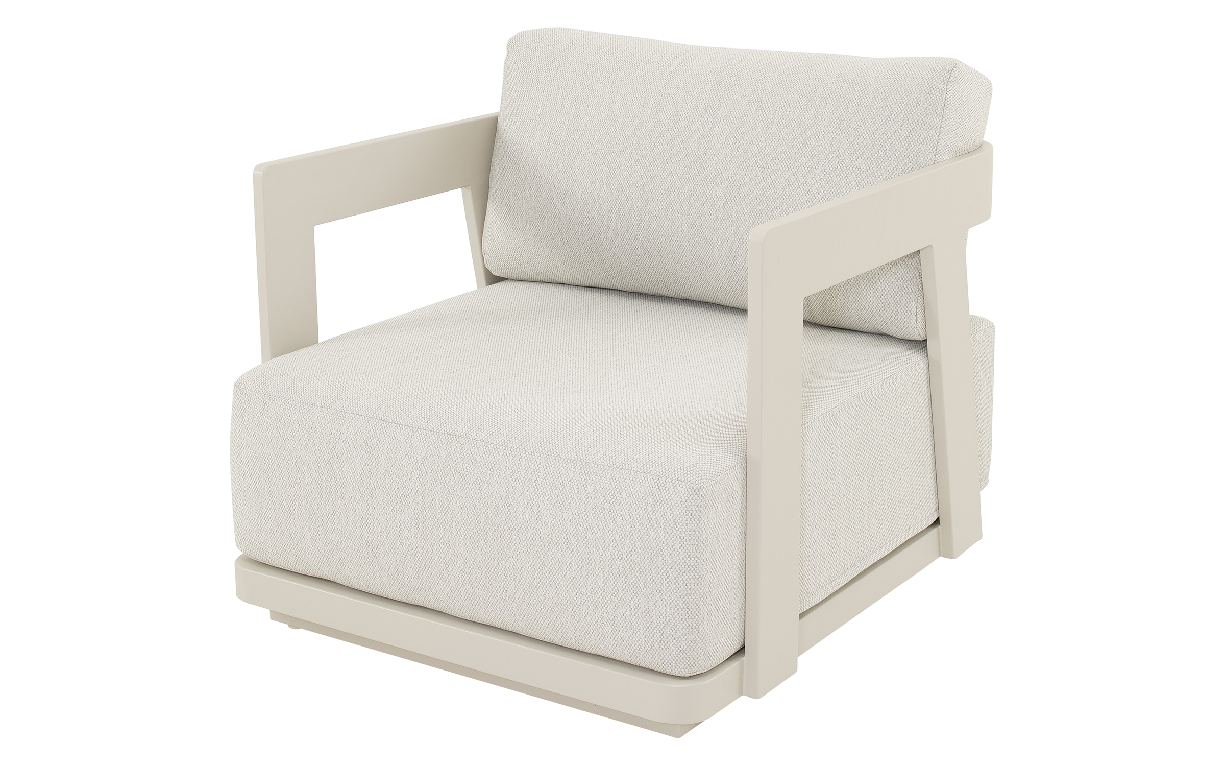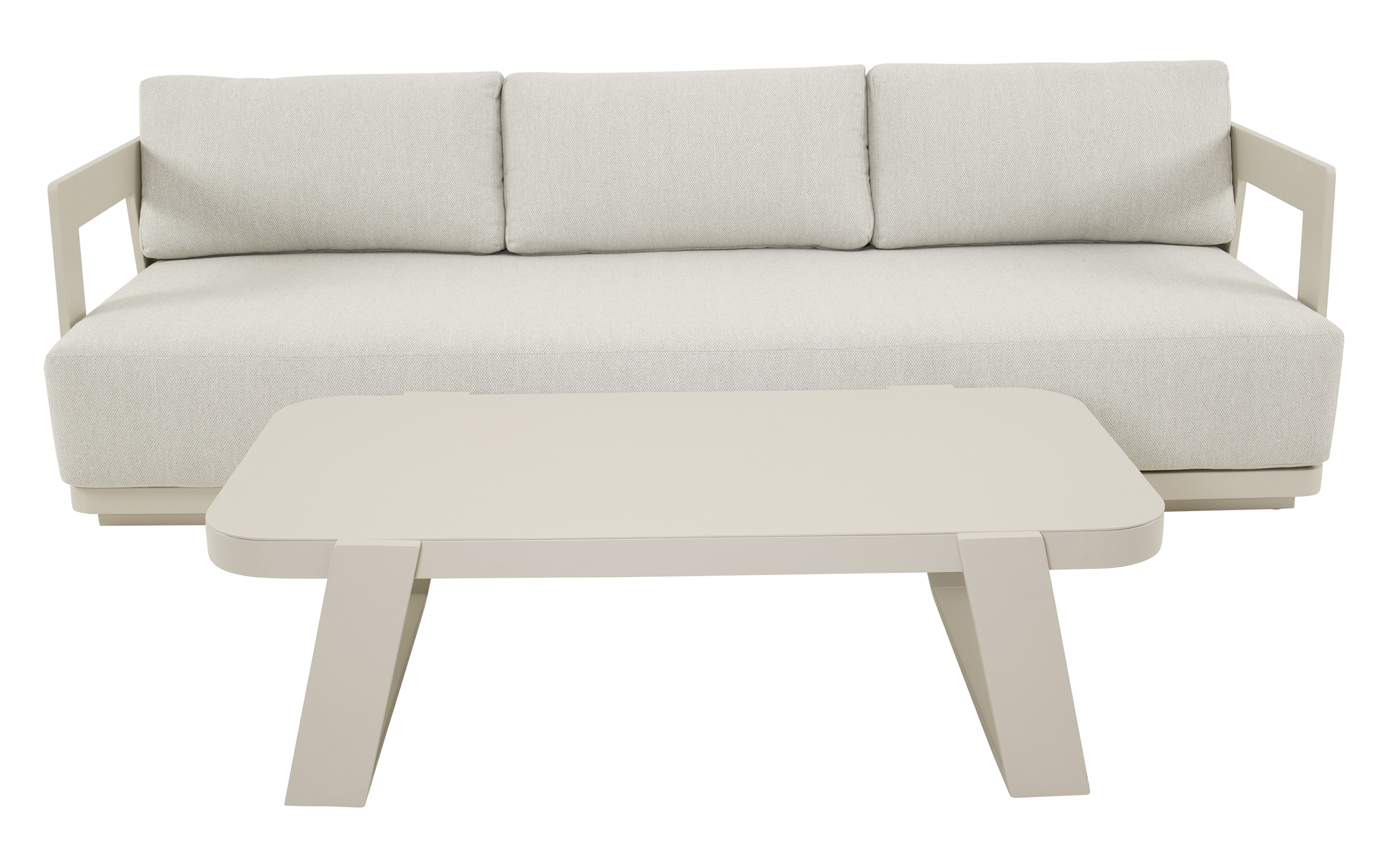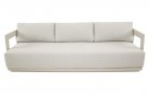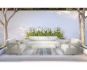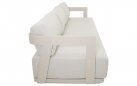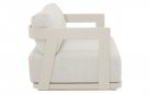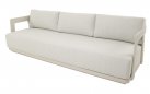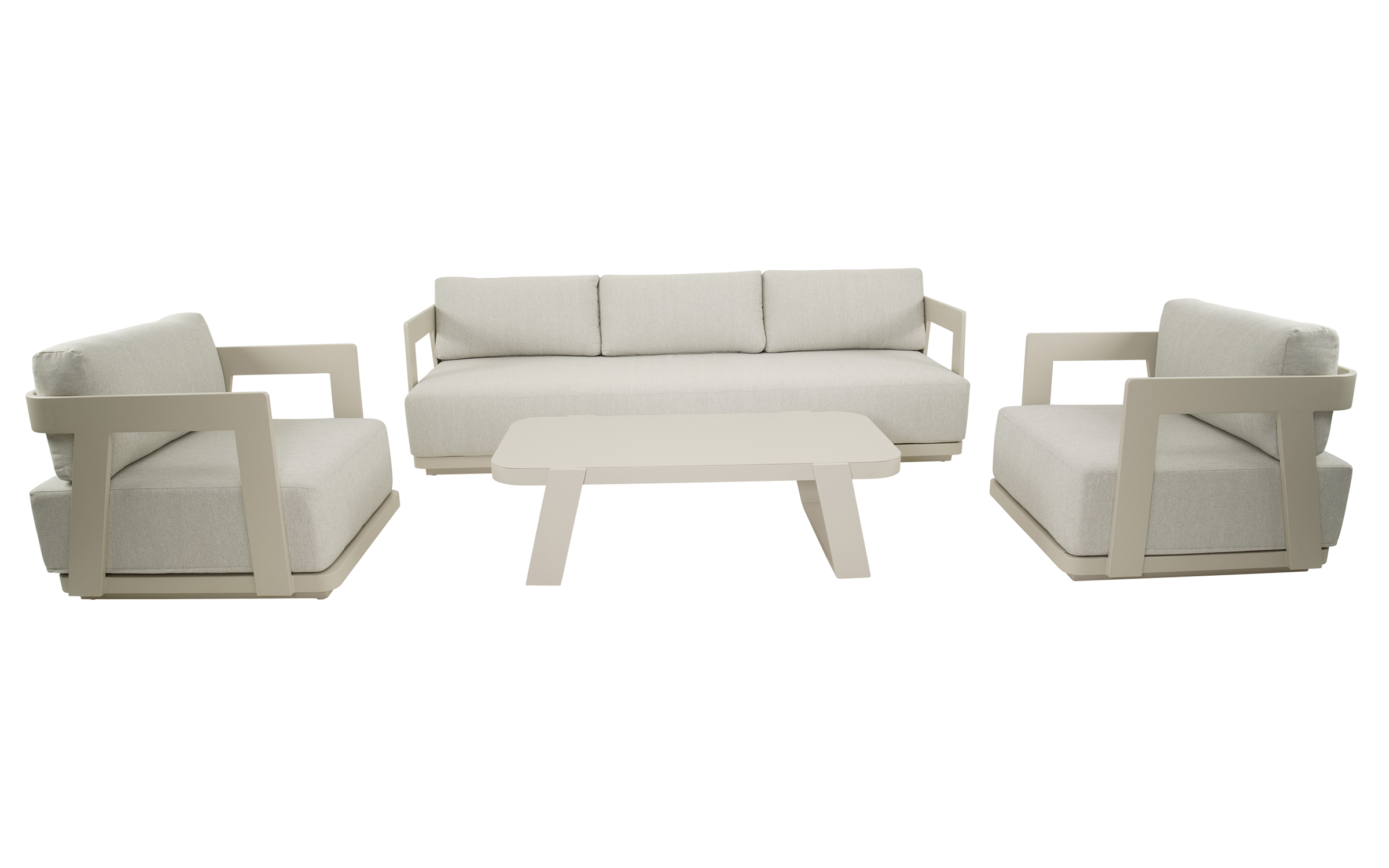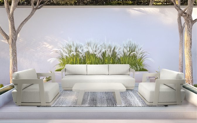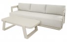Jasnobeżowy nowoczesny zestaw na taras z szeroką sofą, wygodnymi fotelami i bardzo grubymi, wygodnymi poduszkami. Trwałe materiały i łatwe w czyszczeniu poduszki oraz nowoczesny design stworzą na tarasie niepowtarzalny zakątek wypoczynkowy.