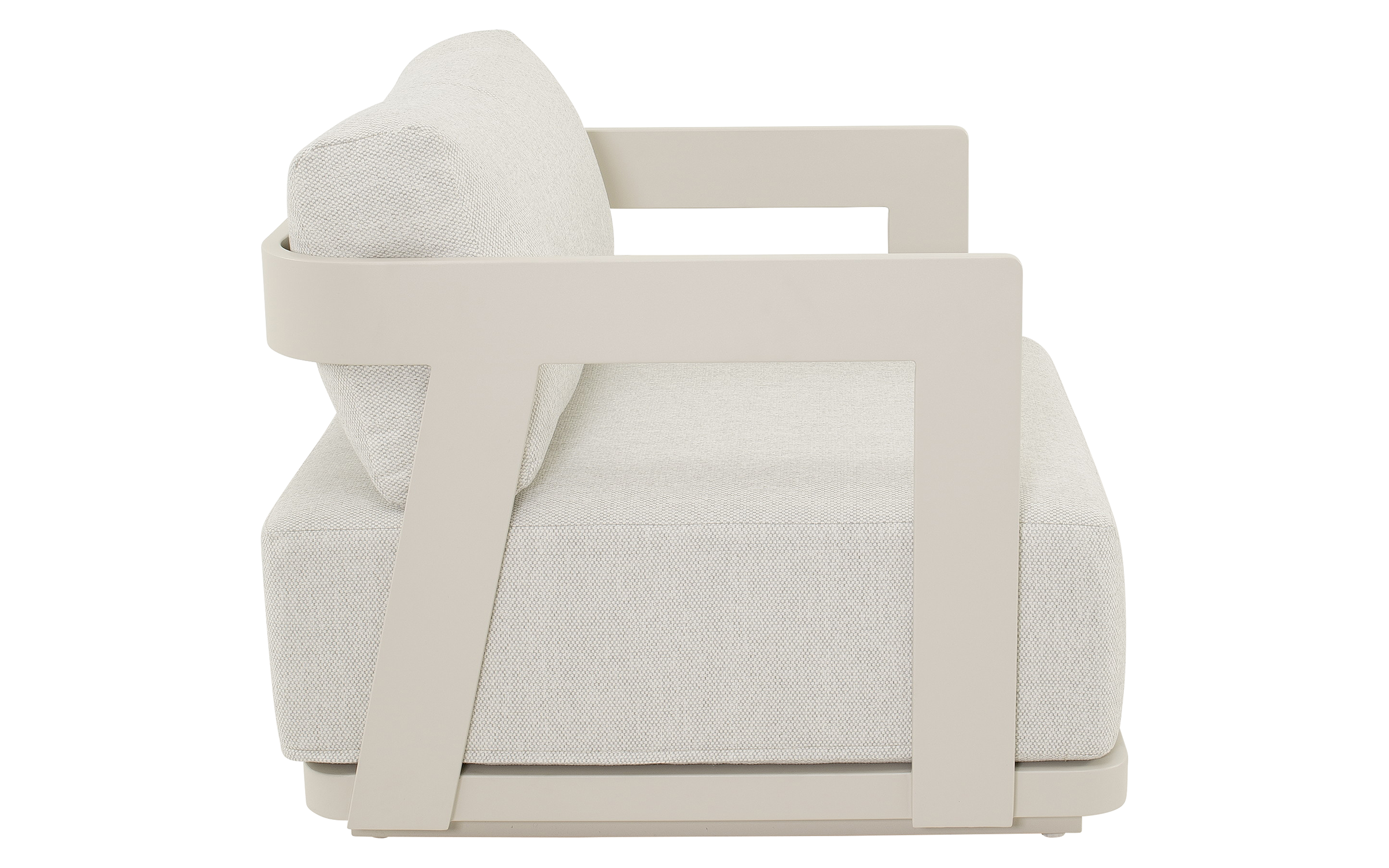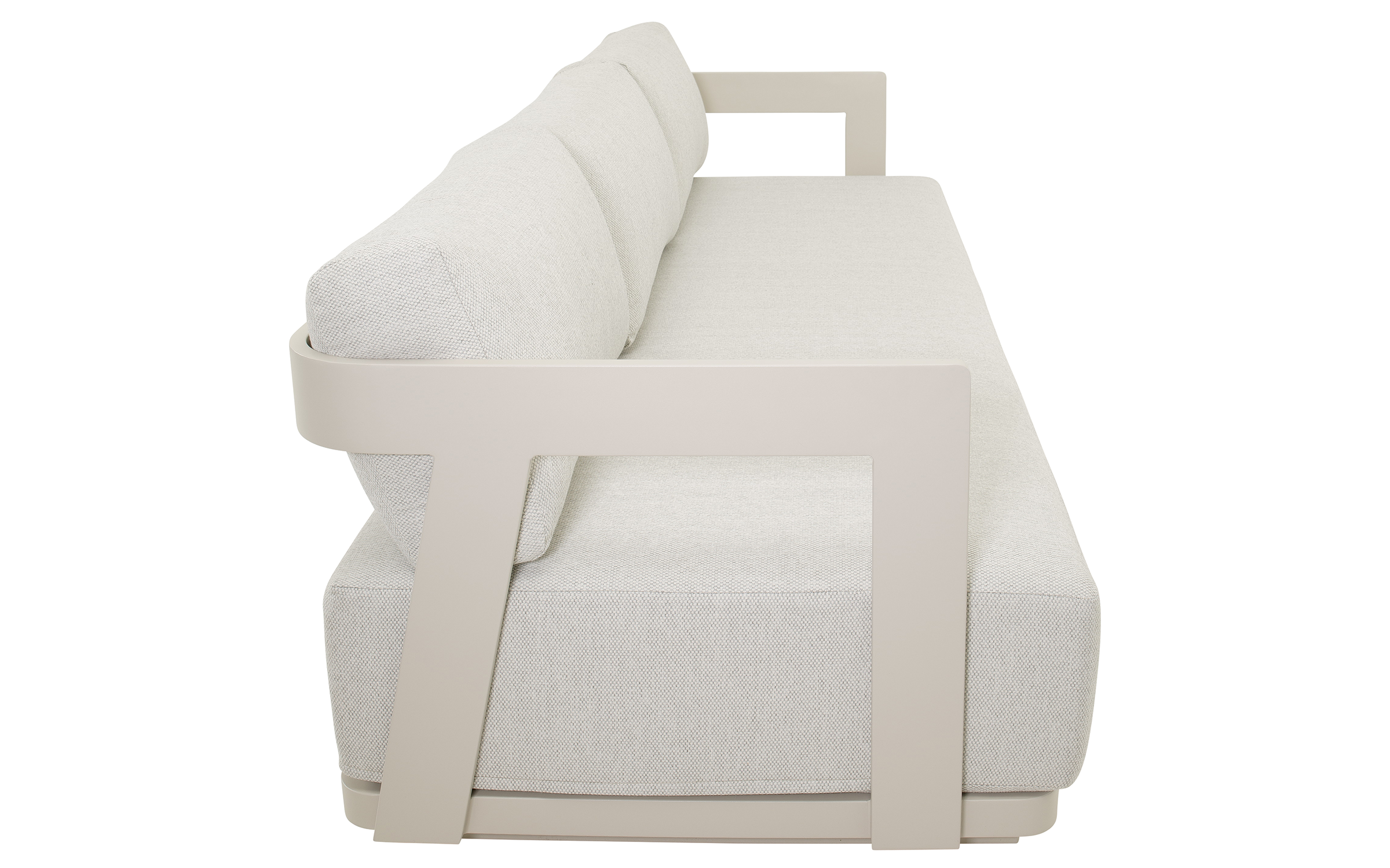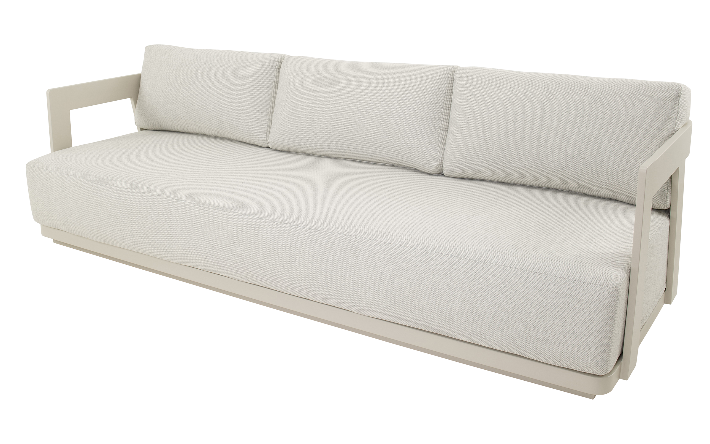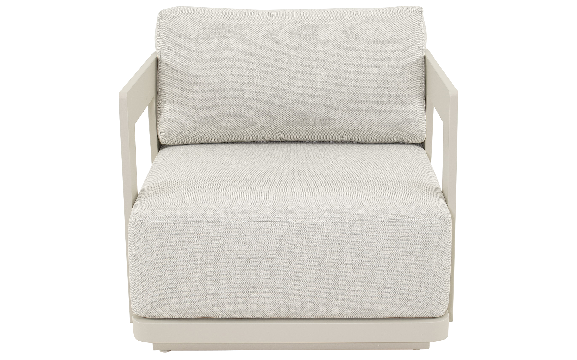 Jasnobeżowy nowoczesny zestaw na taras z szeroką sofą, wygodnymi fotelami i bardzo grubymi, wygodnymi poduszkami. Trwałe materiały i łatwe w czyszczeniu poduszki oraz nowoczesny design stworzą na tarasie niepowtarzalny zakątek wypoczynkowy.