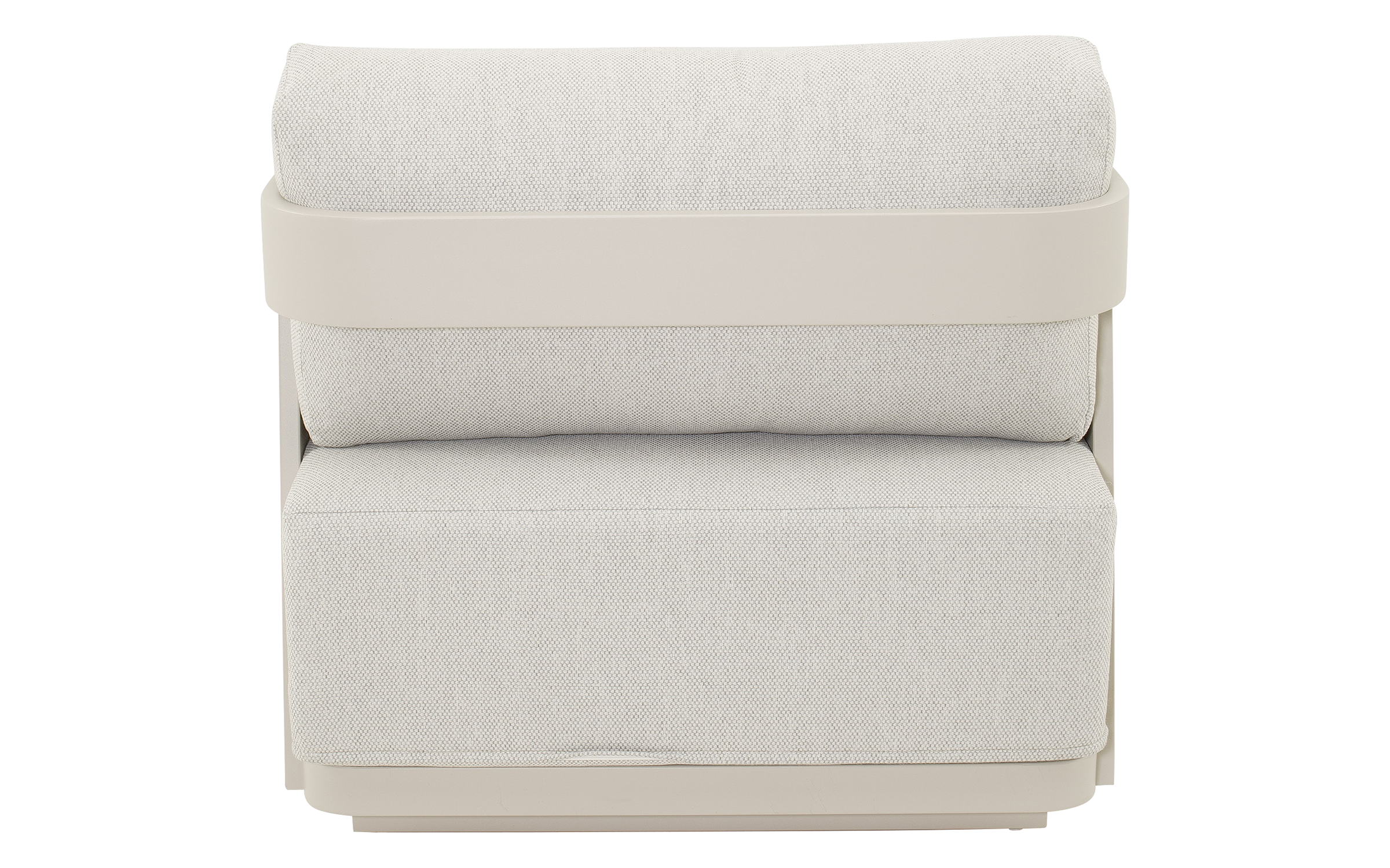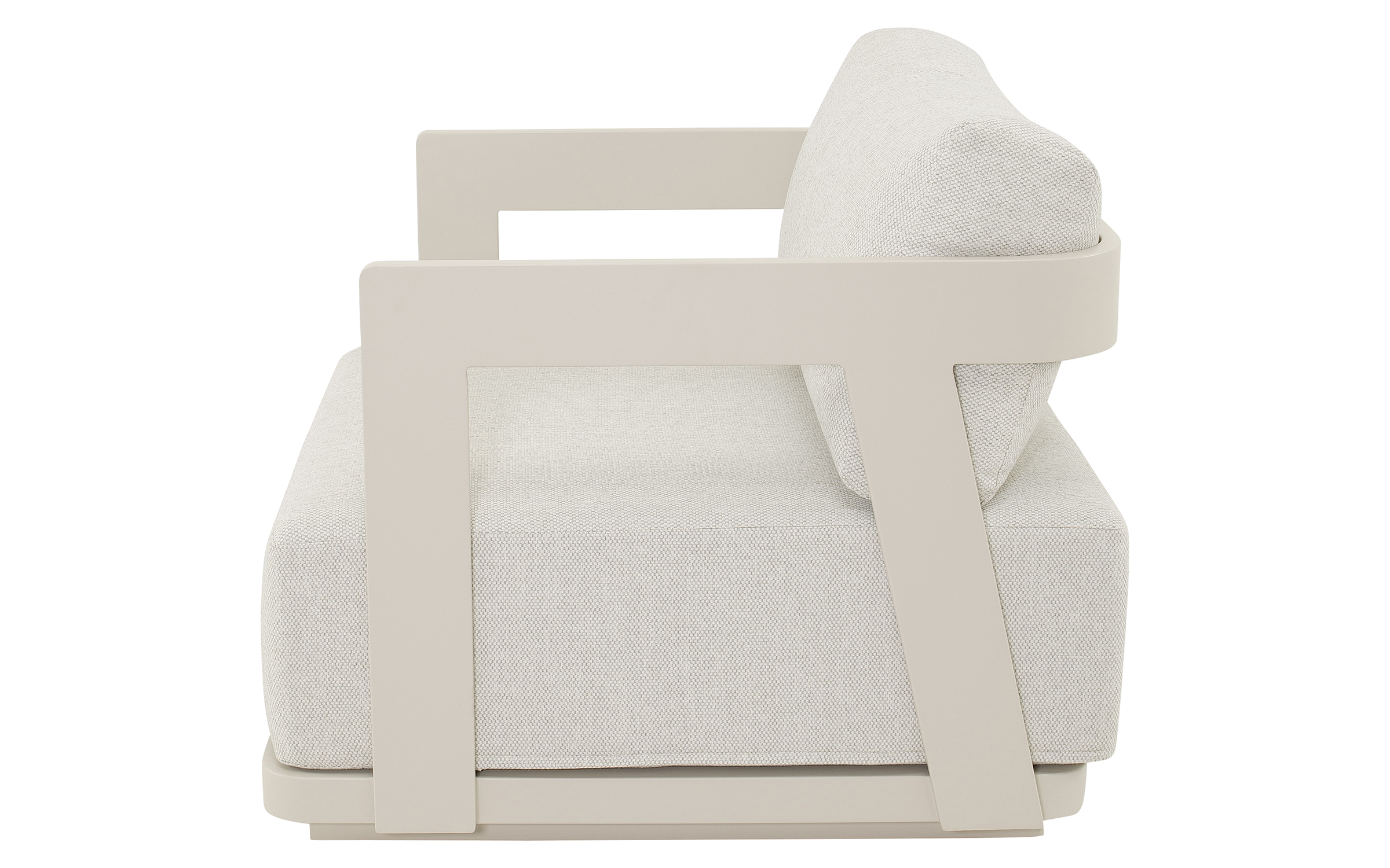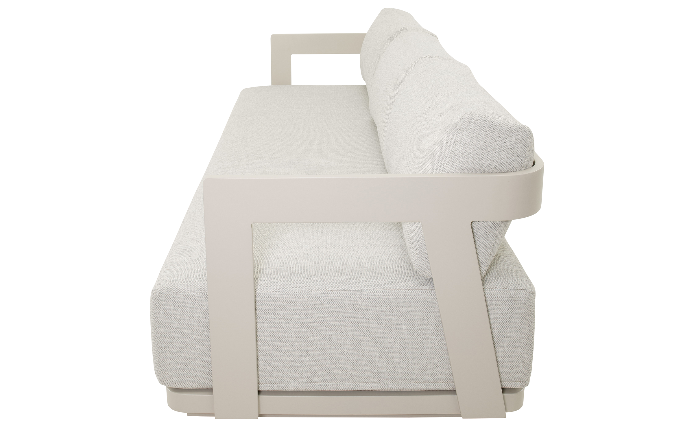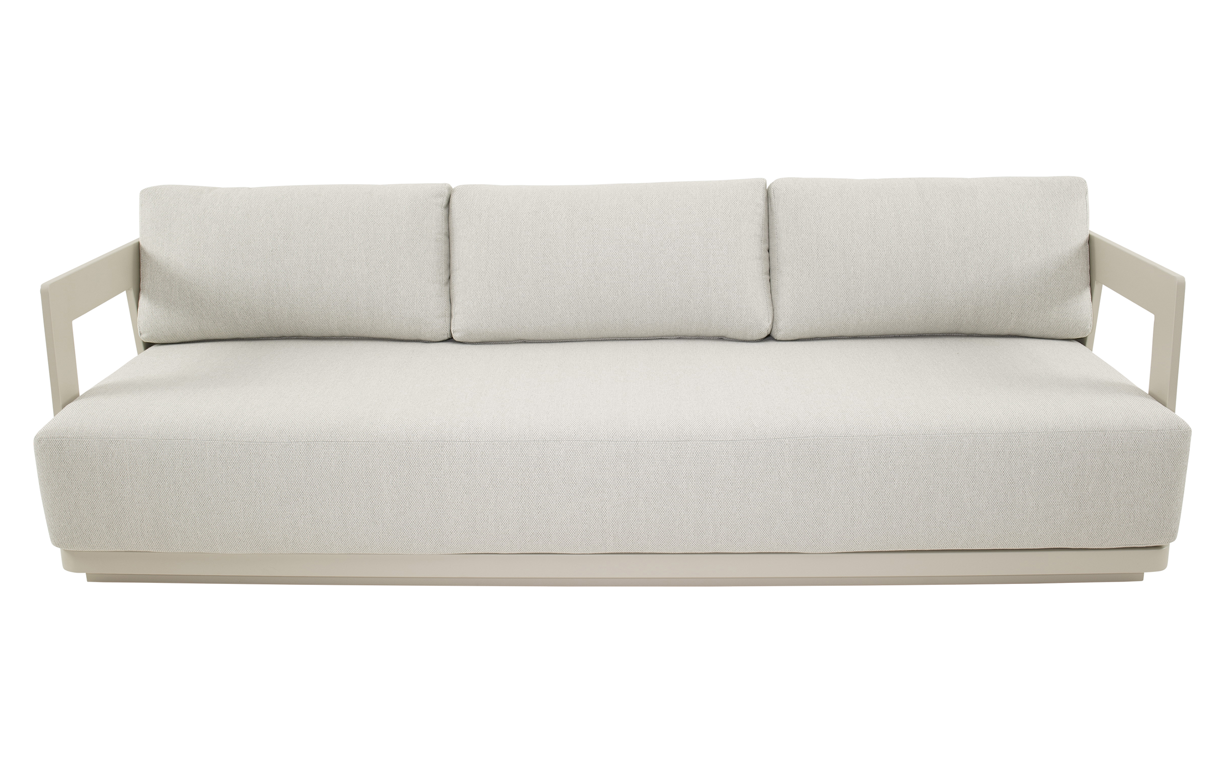 Jasnobeżowy nowoczesny zestaw na taras z szeroką sofą, wygodnymi fotelami i bardzo grubymi, wygodnymi poduszkami. Trwałe materiały i łatwe w czyszczeniu poduszki oraz nowoczesny design stworzą na tarasie niepowtarzalny zakątek wypoczynkowy.