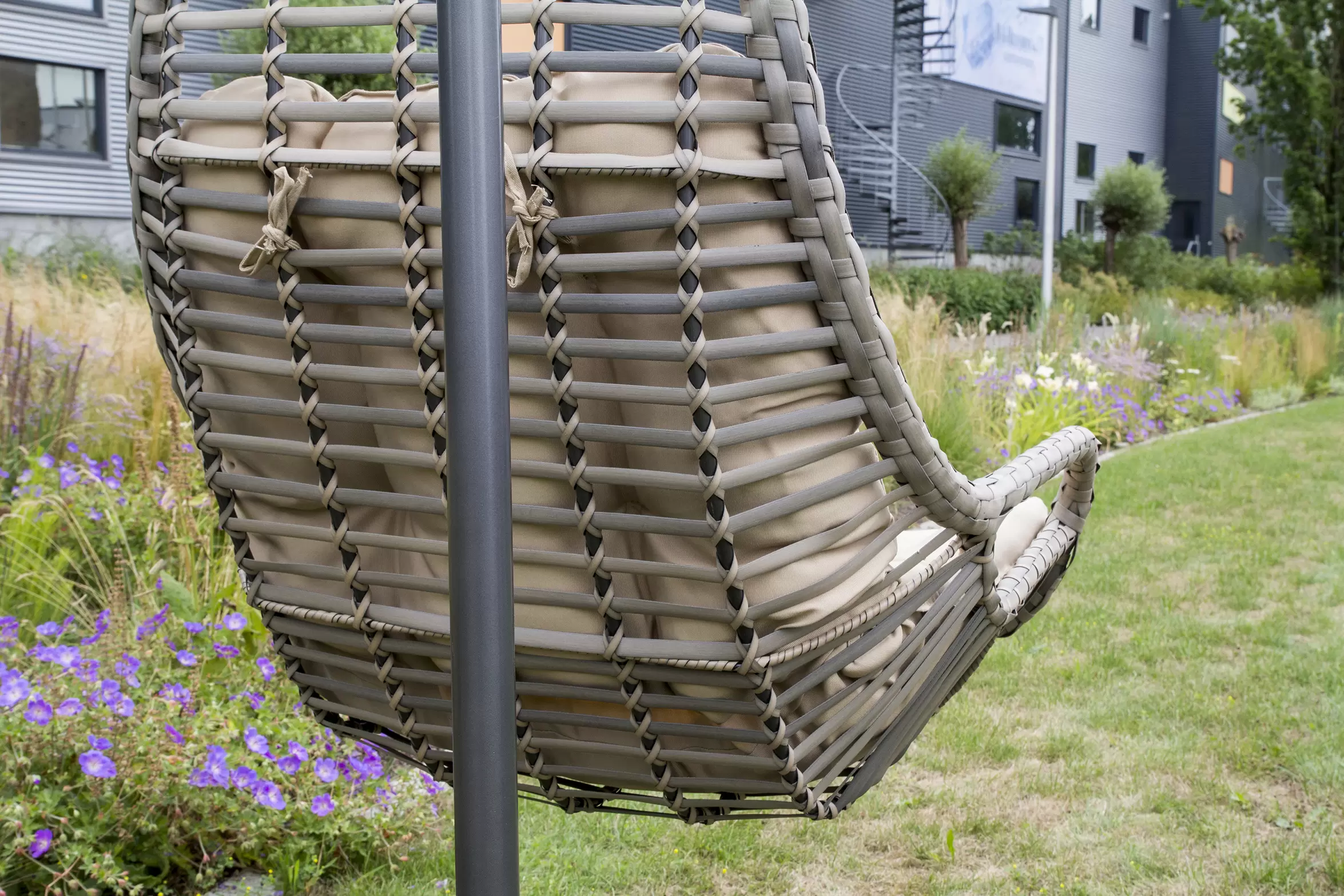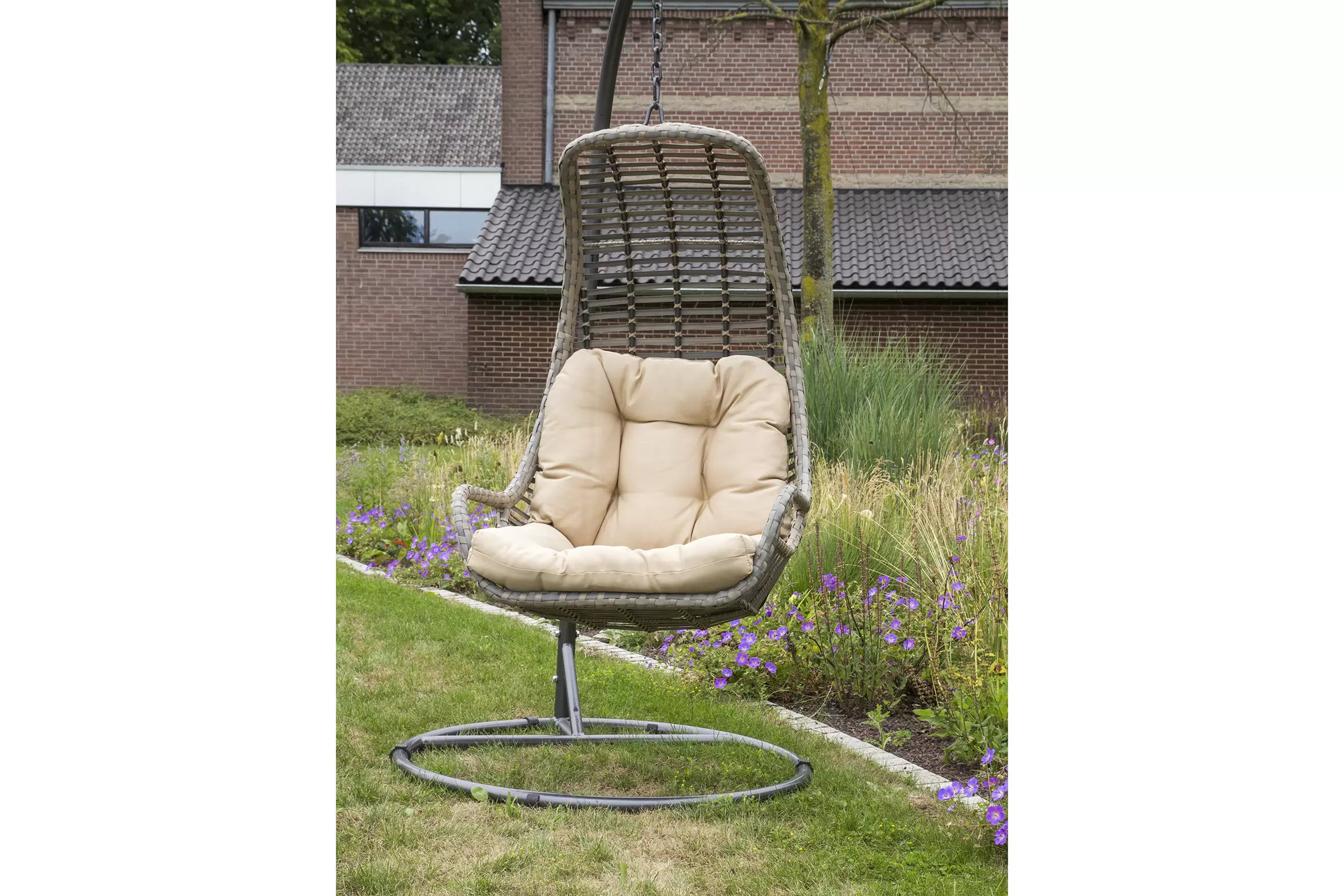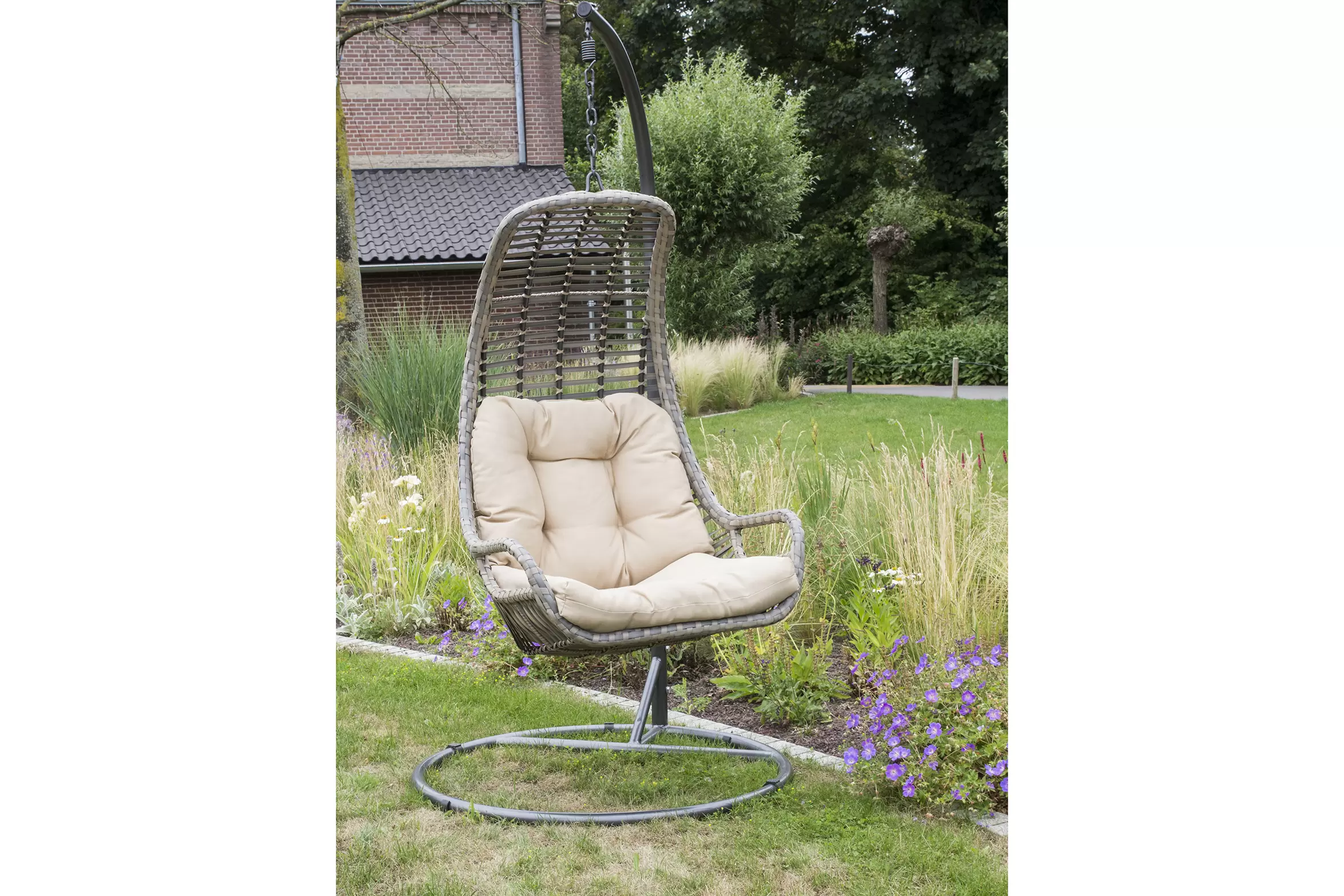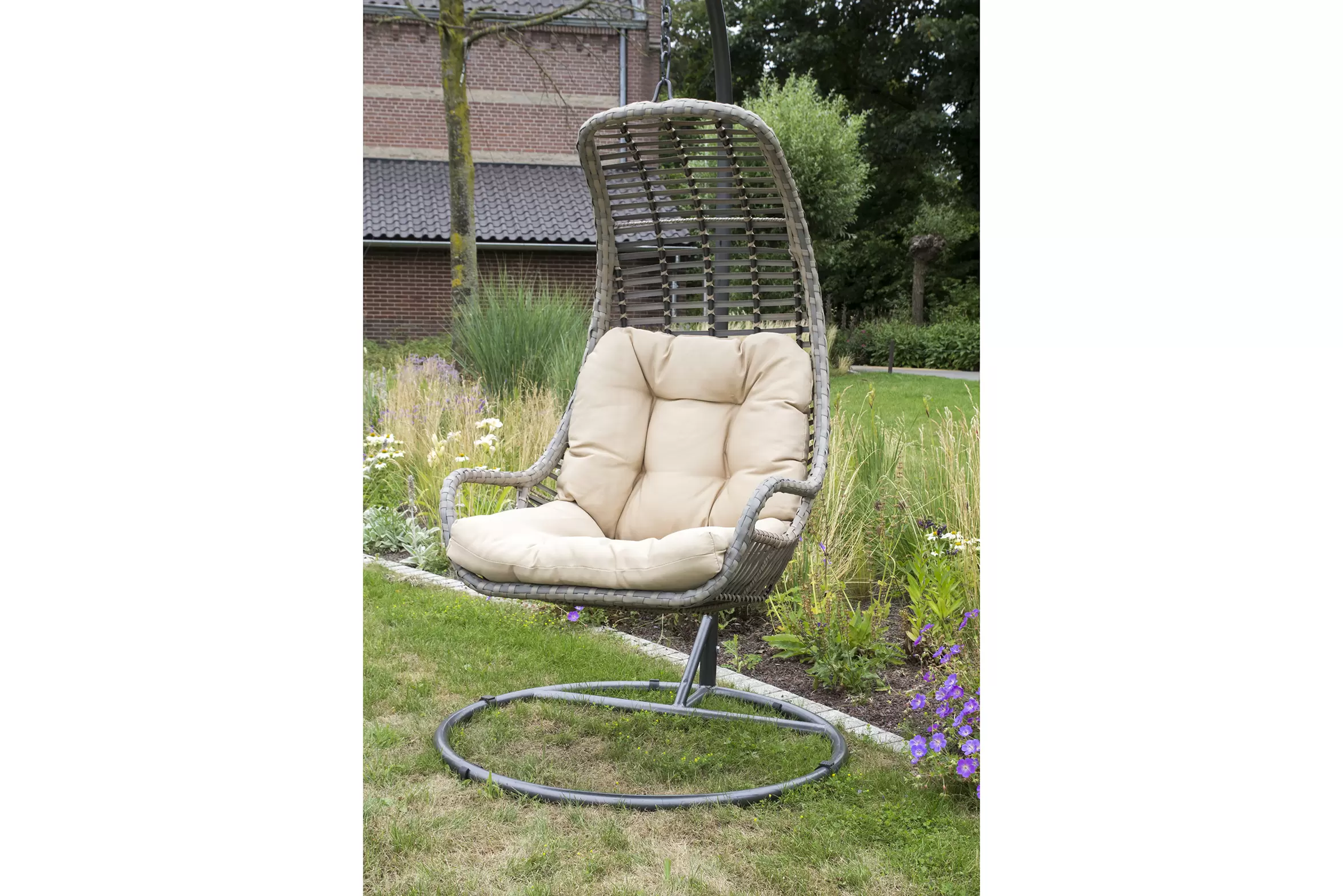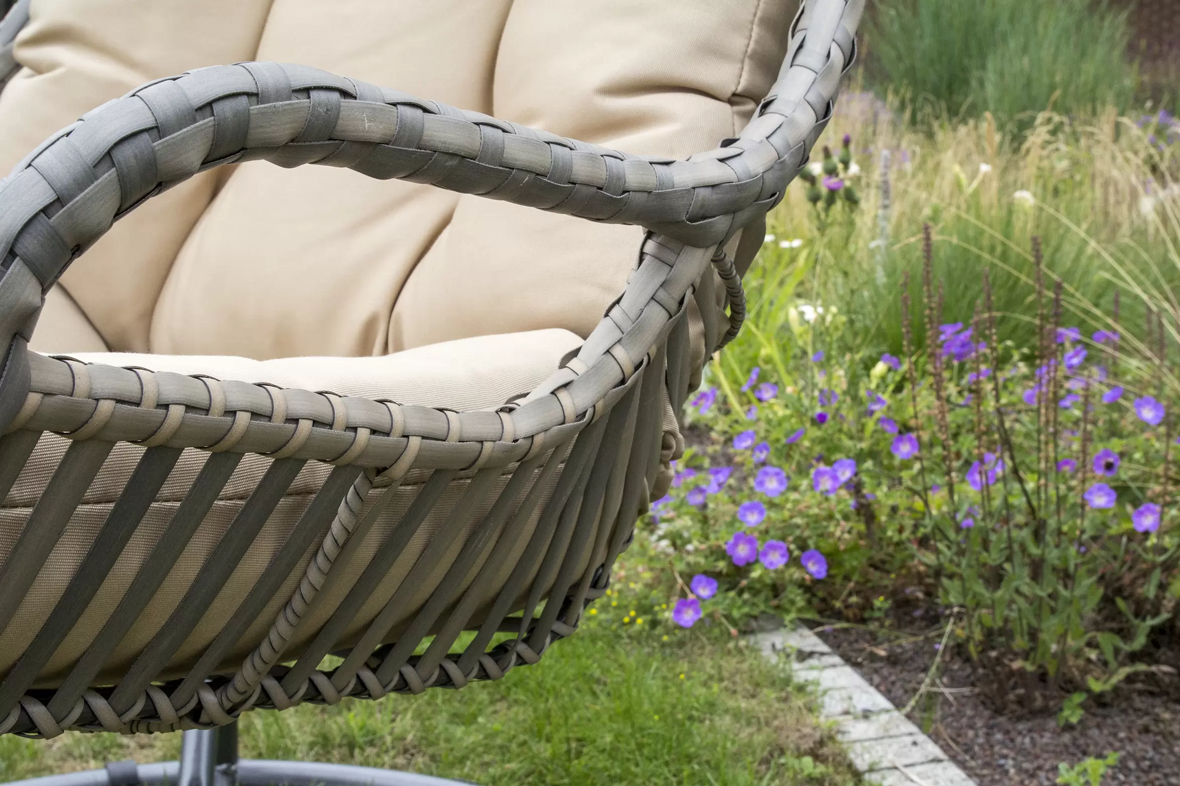 Huśtawka 1-osobowa typu kokon na stalowym stelażu. Siedzisko oplecione technorattanem. Wygodna poduszka.