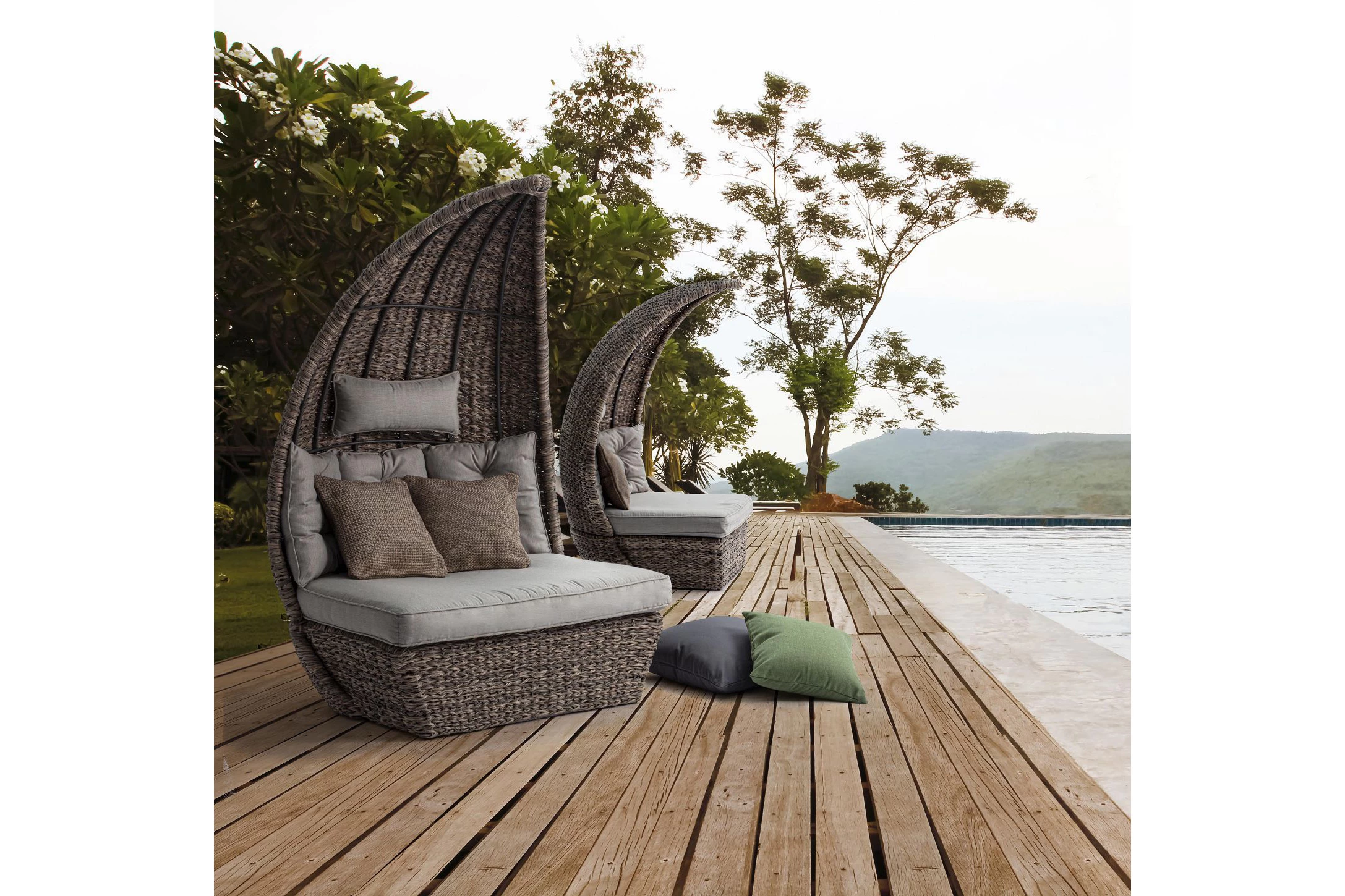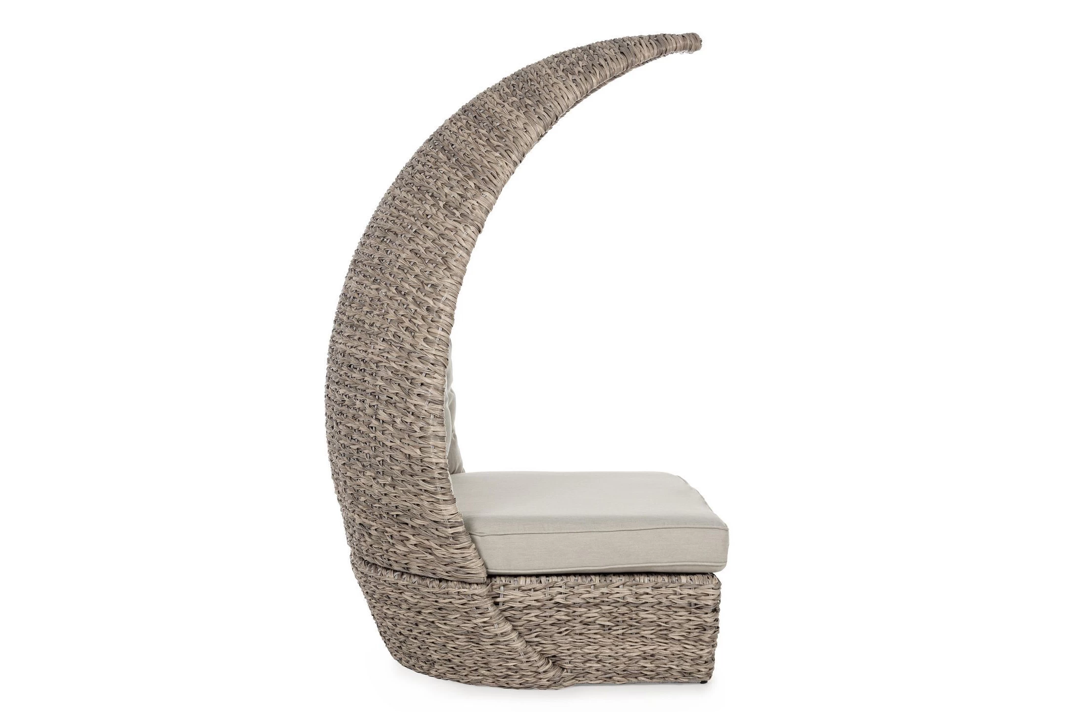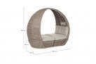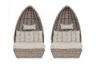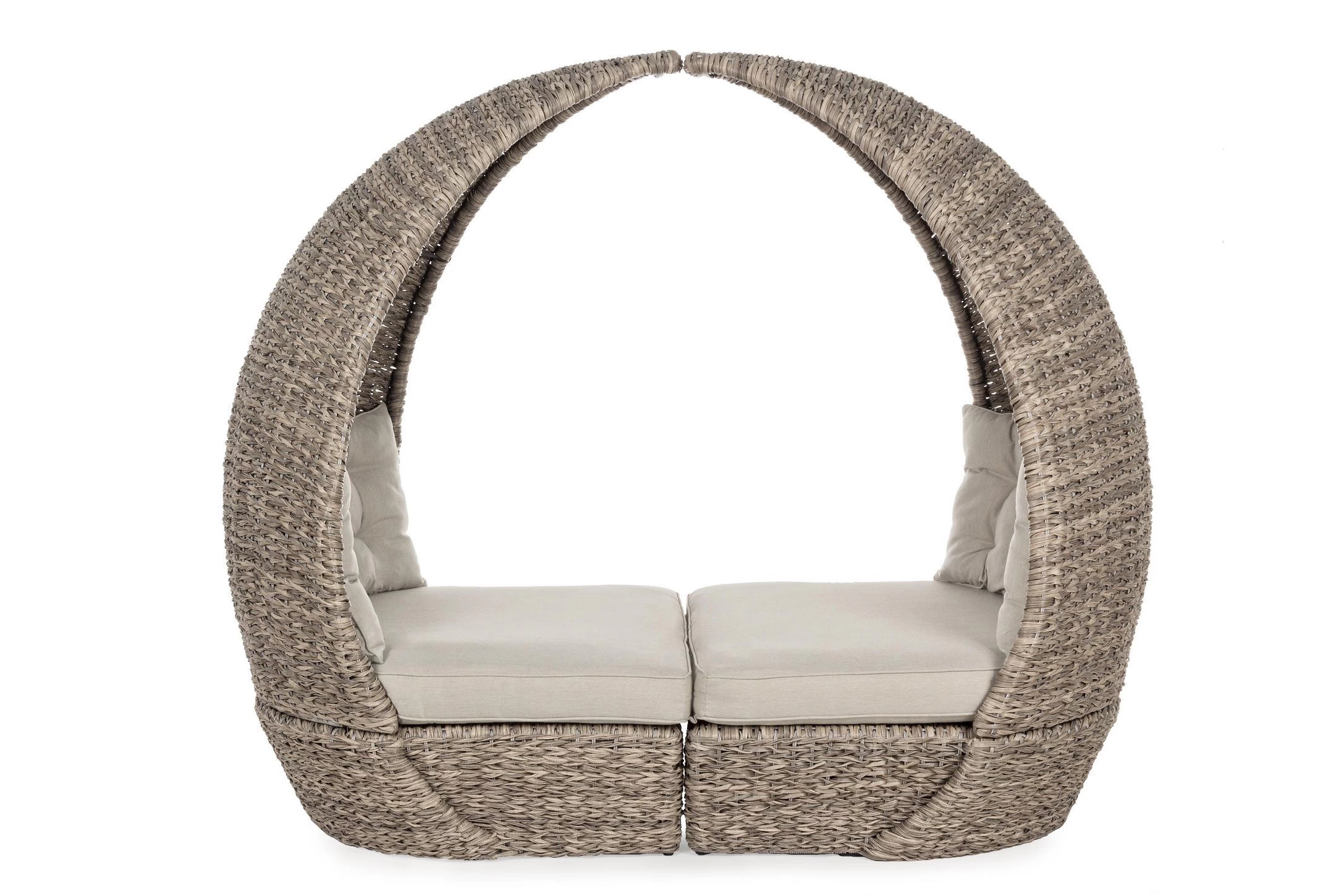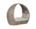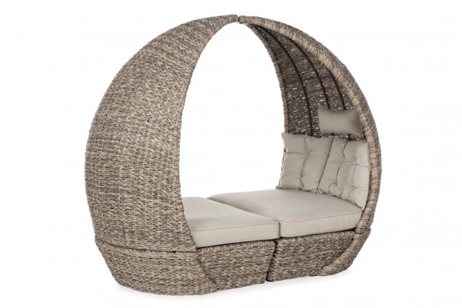 Łózko ogrodowe, które po rozdzieleniu zamienia się w 2 fotele z zadaszeniem. Technorattan beżowy o wyglądzie plecionki z bananowca. Beżowe poduszki.