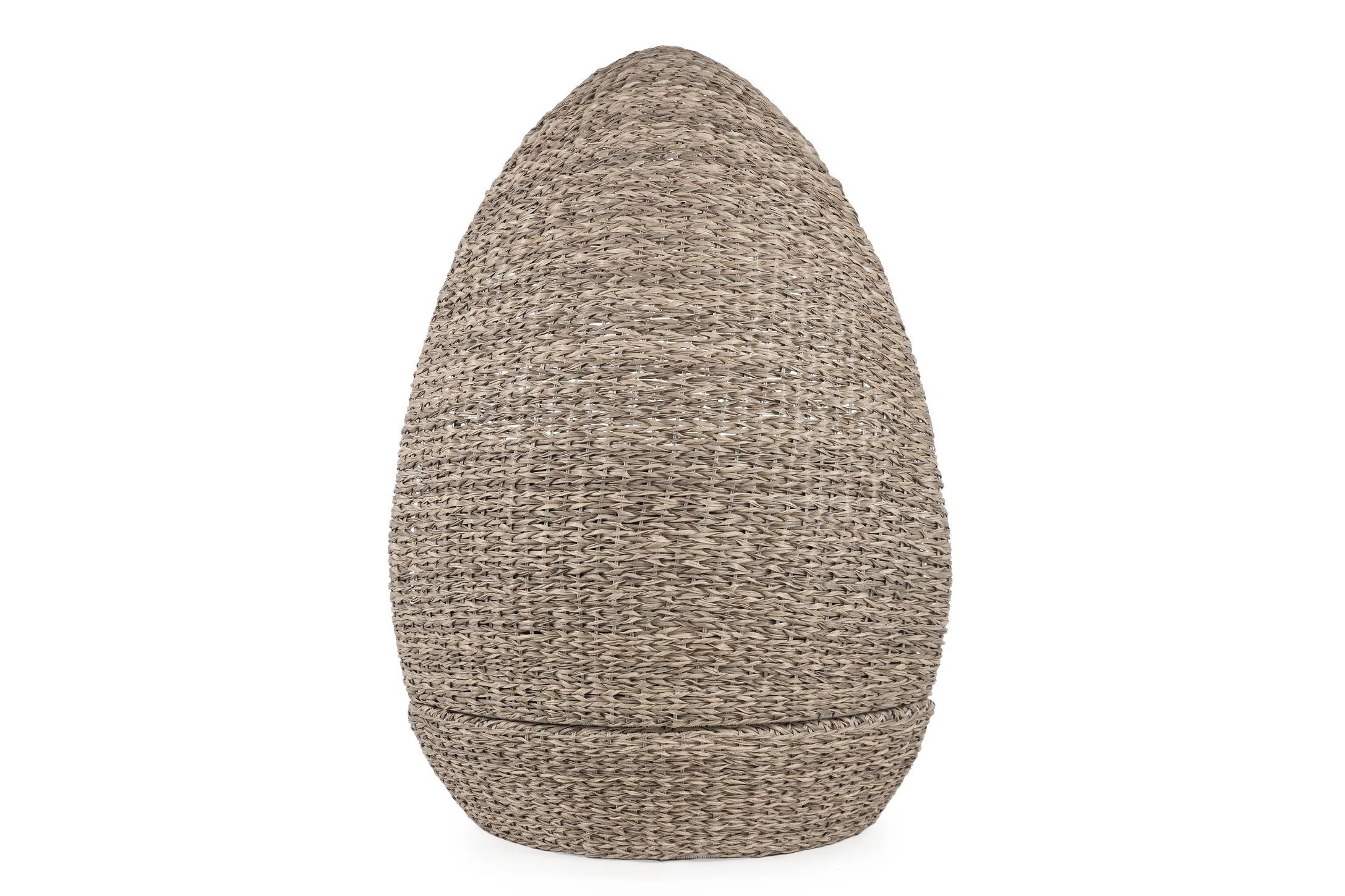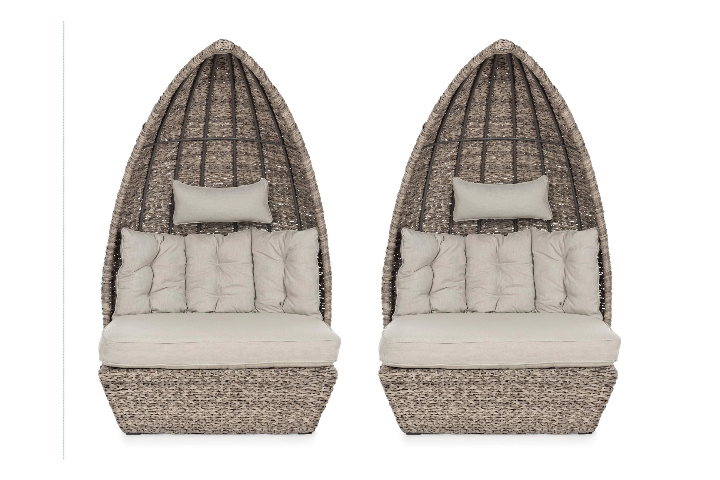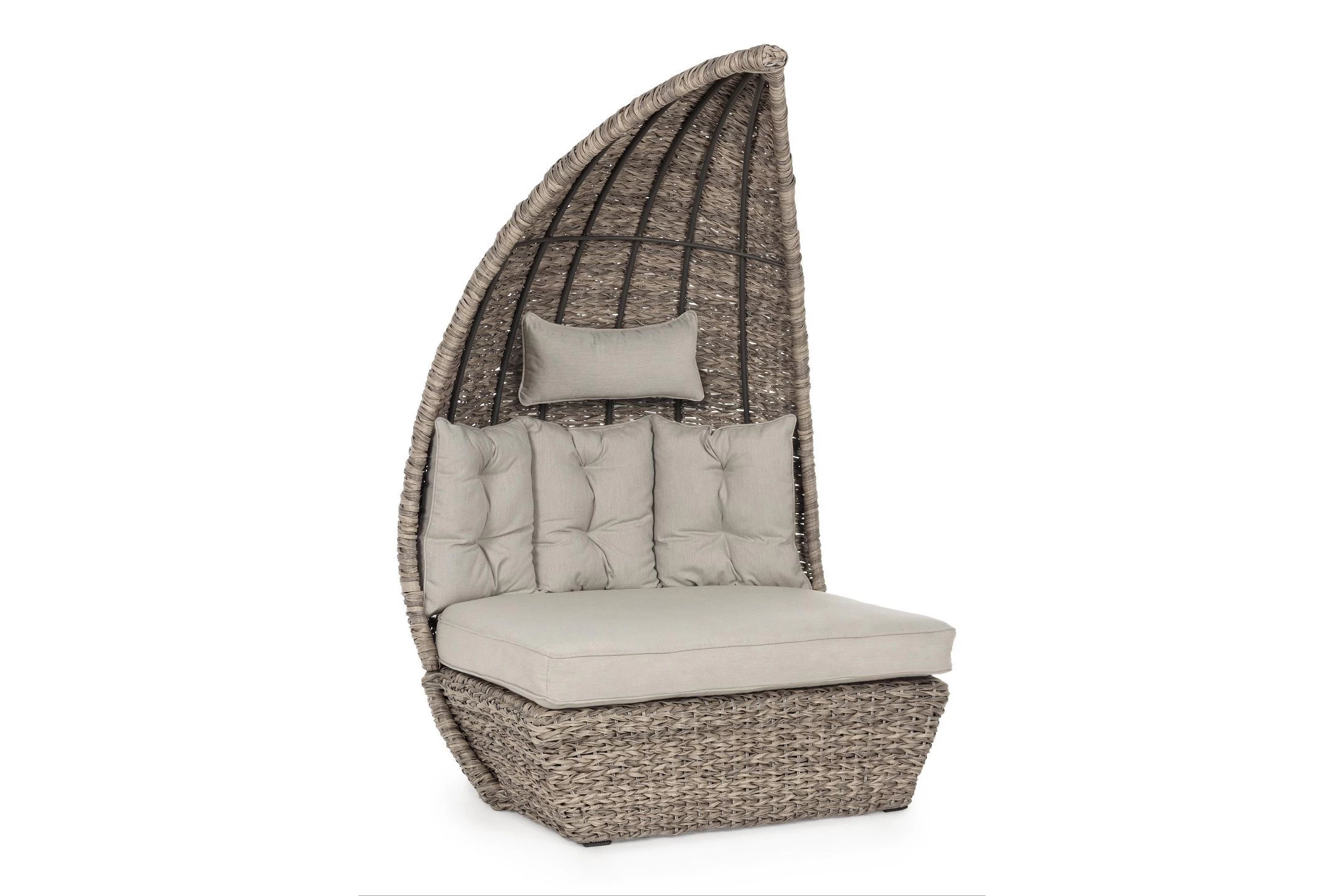 Łózko ogrodowe, które po rozdzieleniu zamienia się w 2 fotele z zadaszeniem. Technorattan beżowy o wyglądzie plecionki z bananowca. Beżowe poduszki.