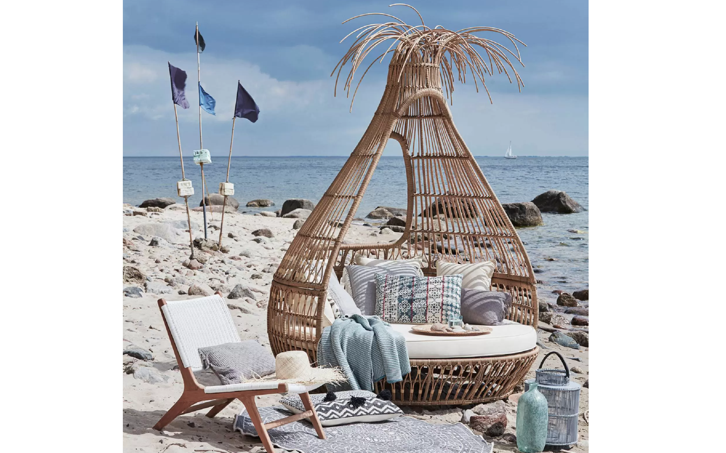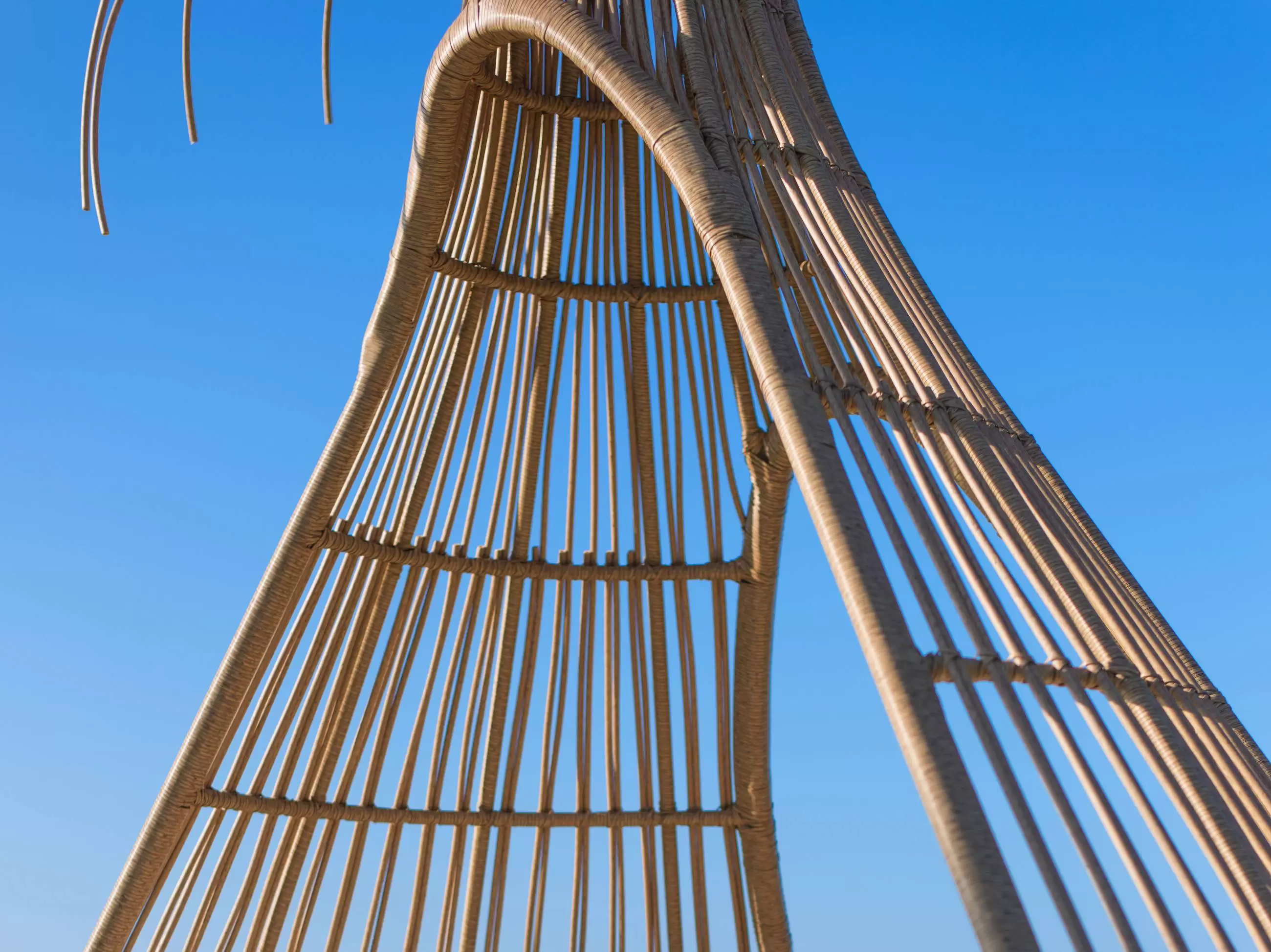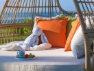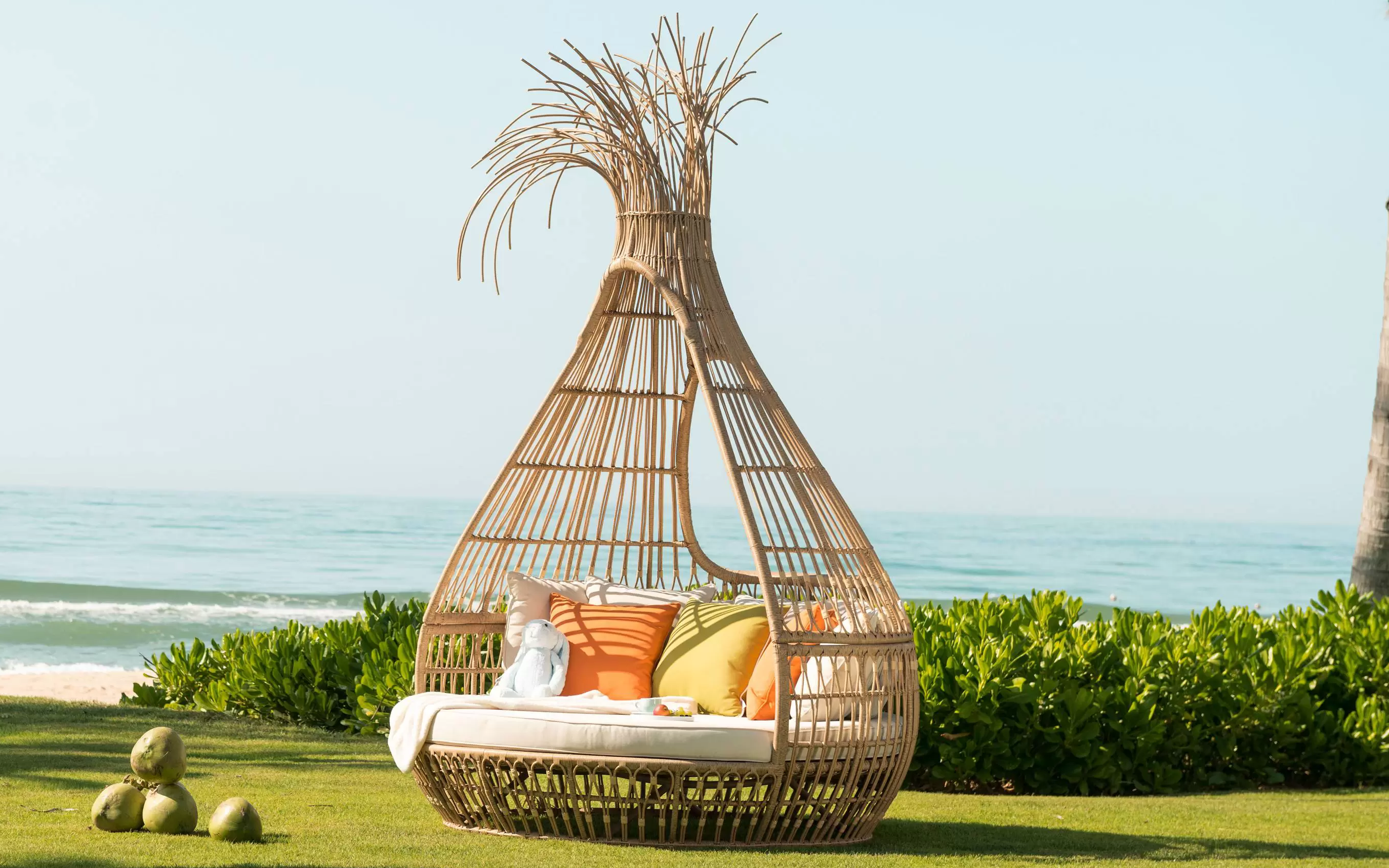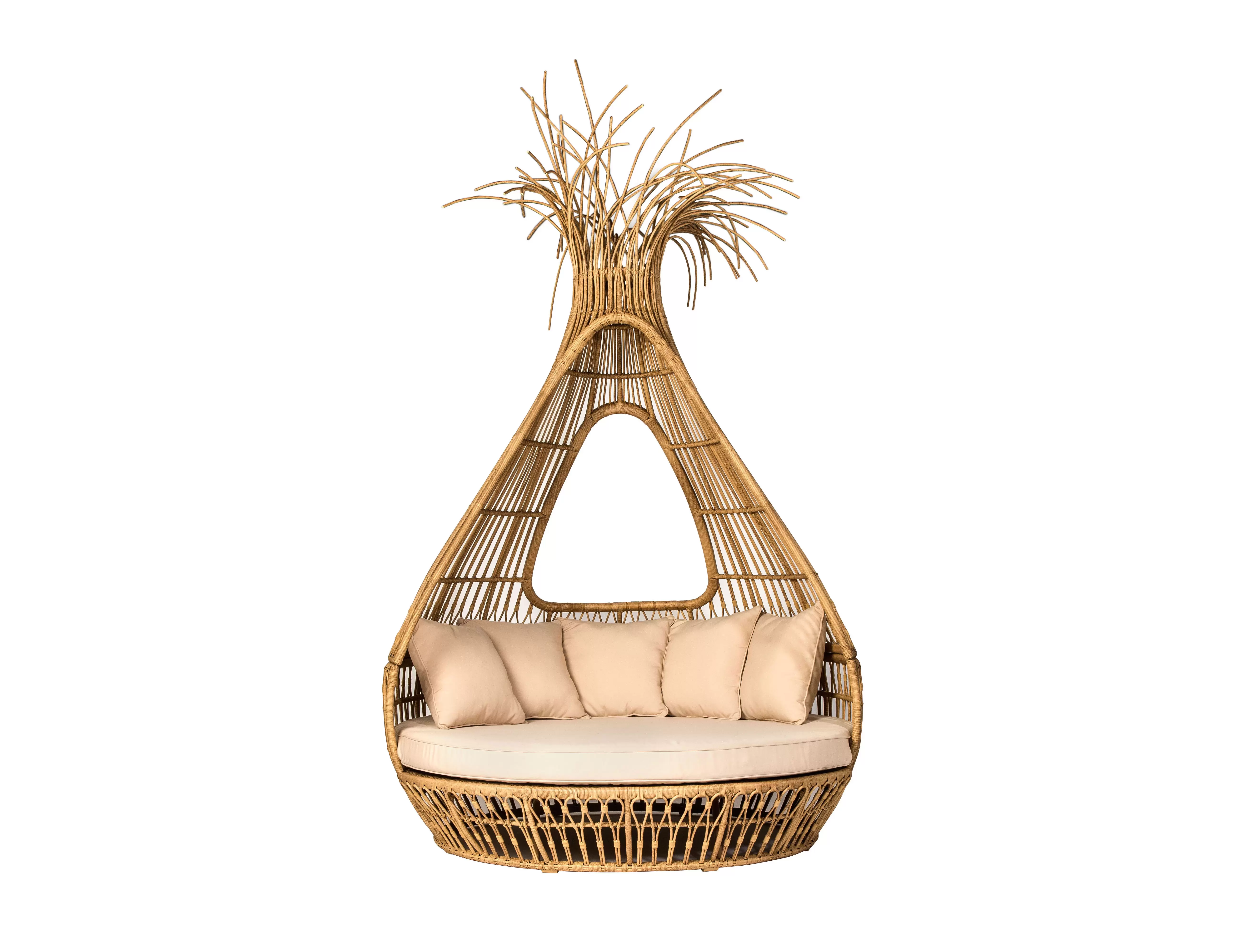 Łóżko ogrodowe o prawie okrągłym siedzisku z oryginalnym zadaszeniem w stylu afrykańskiej chatki. Łózko wykonane z aluminium i oplecione technorattanem w naturalnym kolorze. Poduszki z akrylowego materiału OLEFIN w kolorze białym.