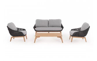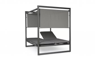 Luksusowe dwuosobowe łóżko wypoczynkowe na taras. Podstawa z drewna teak. Oparcie o konstrukcji aluminiowej z plecionką z liny polipropylenowej. Poduszki szybkoschnące z poszewkami z materiału Olefin.