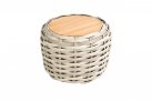 Do zestawu pasuje stolik kawowy z drewna teakowego, utrzymany w tym samym stylu.