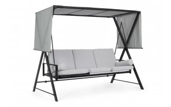 Rama z aluminium, wykończona technorattanem o półokrągłym splocie (ø 6 mm). Poduszki z poliestru 260 g/m² – odporne na wilgoć, promieniowanie UV i łatwe w czyszczeniu. Kolorystyka: szaro-kremowa.