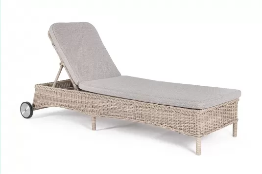 Stylowy leżak na taras klasyczny z kółkami / technorattan okrągły beżowy / poduszki wodoodporne ze zdejmowanymi poszewkami z materiału Olefin