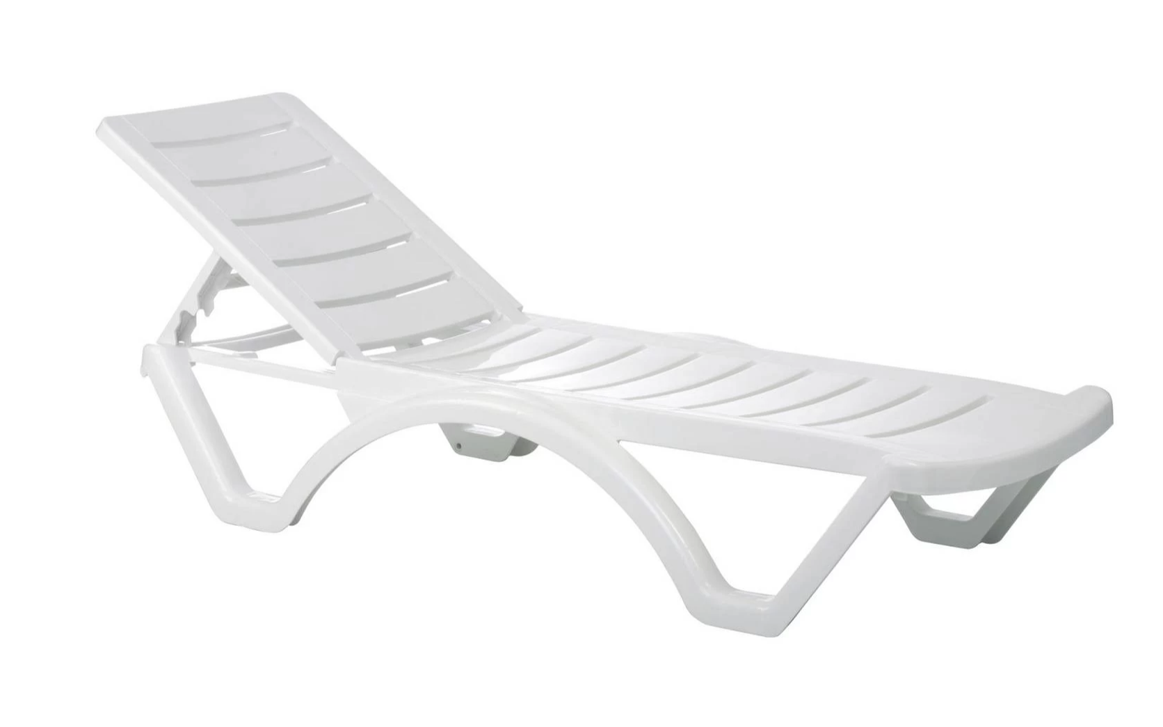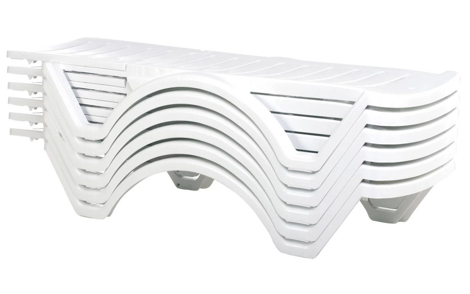 Nowoczesny, sztaplowany leżak ogrodowy wykonany z białego polipropylenu.
