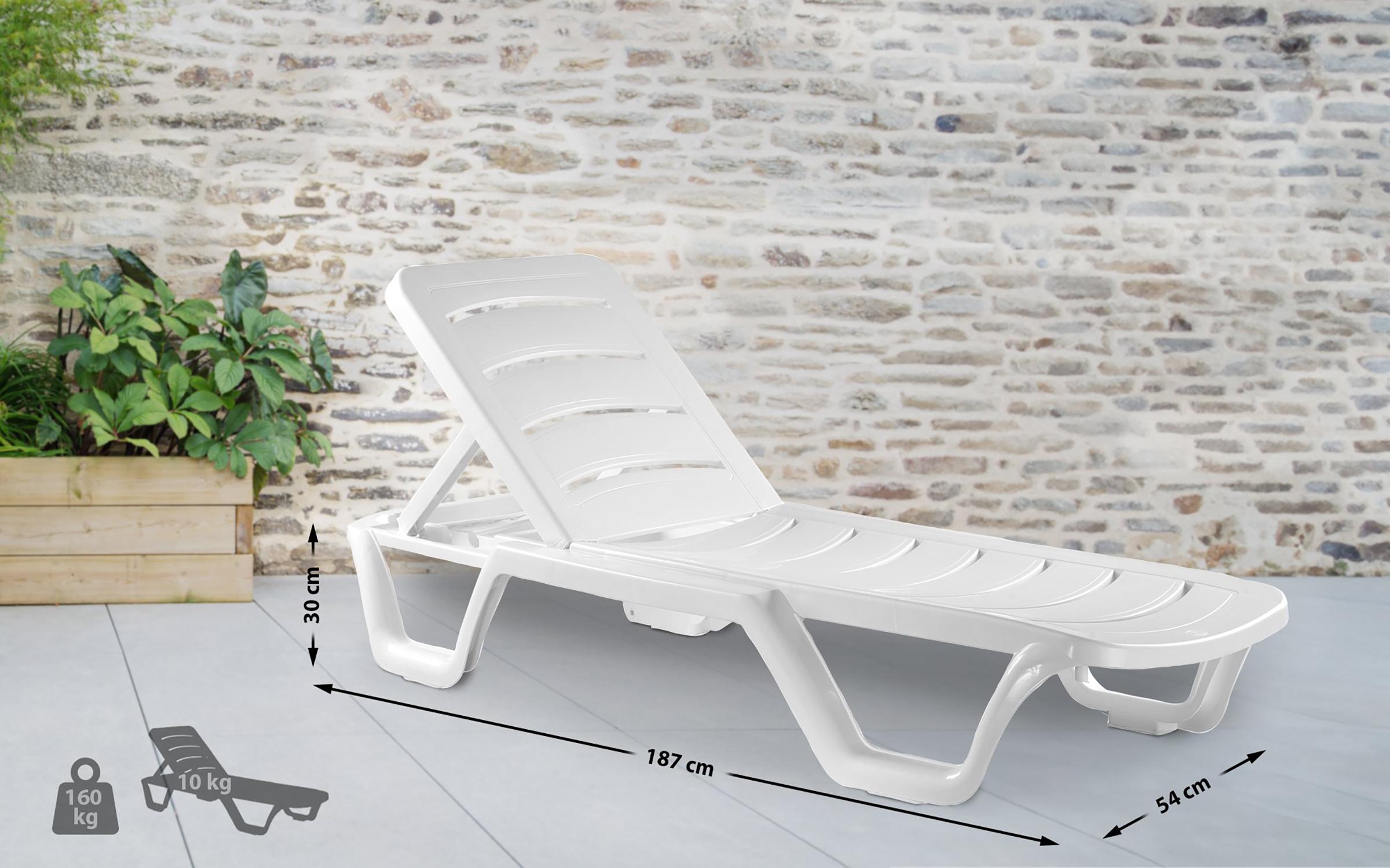 Oparcie można regulować w pięciu pozycjach, co pozwala na dobranie wygodnej pozycji. Szerokie nóżki zapewniają dobrą stabilność bez przechylania. Ponadto dwa niewidoczne koła zapewniają łatwy transport, dzięki czemu można łatwo przestawiać leżak! Siedziska są wykonane z tworzywa sztucznego odporne na warunki atmosferyczne. Leżak BAHAMA można układać w stos.