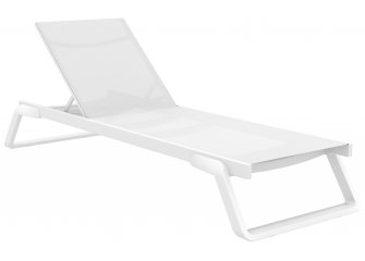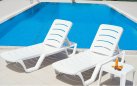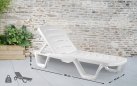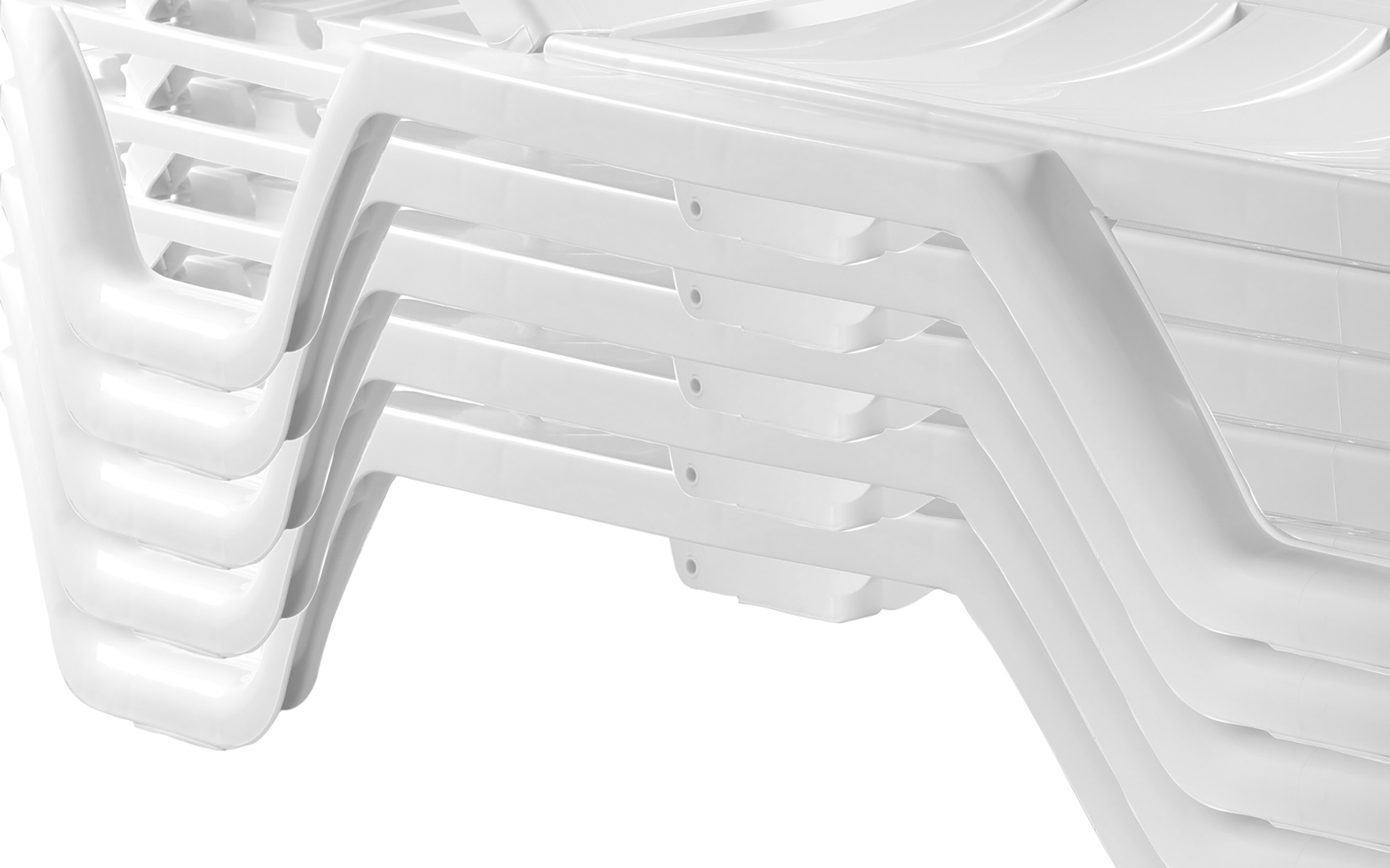 Nowoczesny, sztaplowany leżak ogrodowy wykonany z białego polipropylenu.