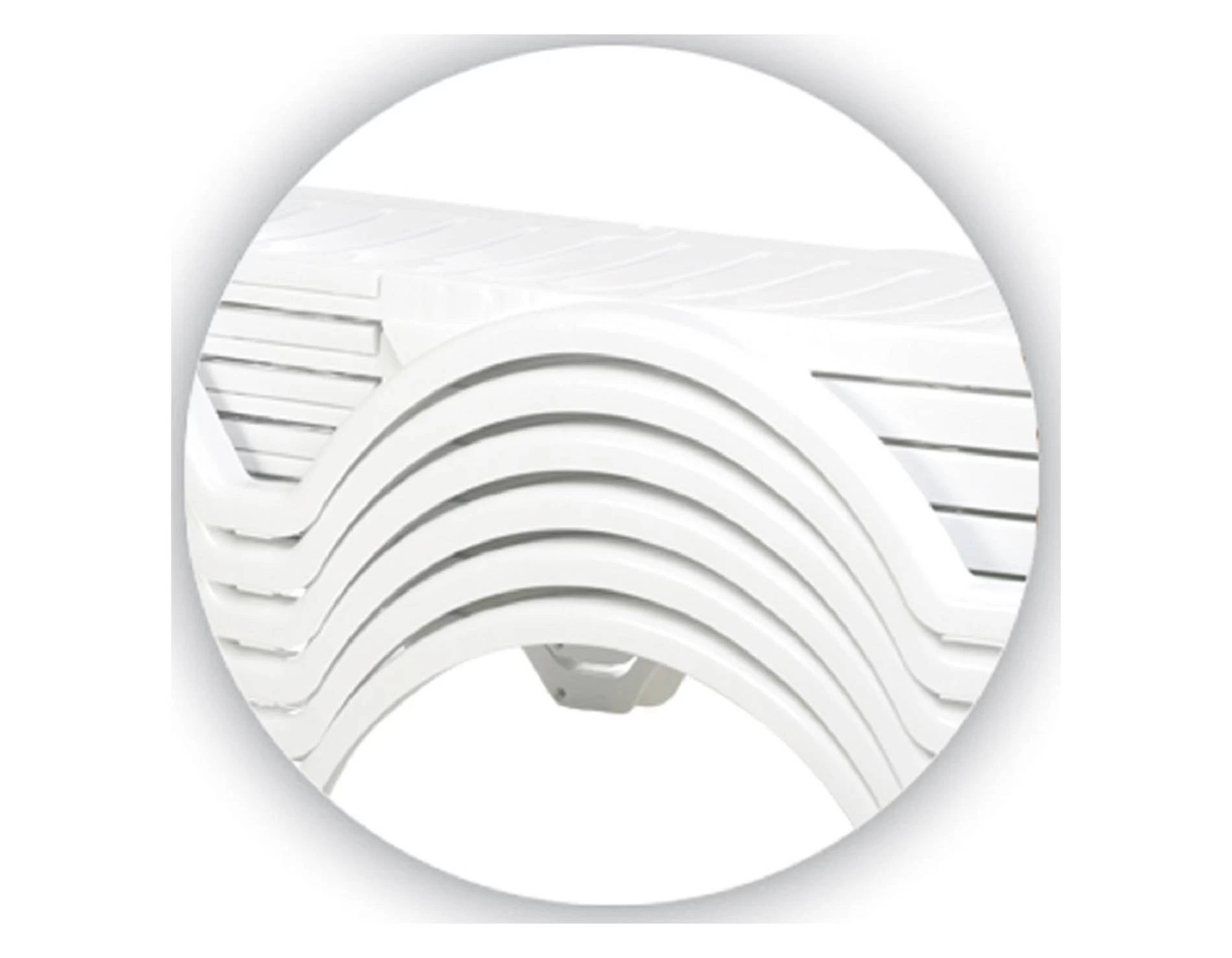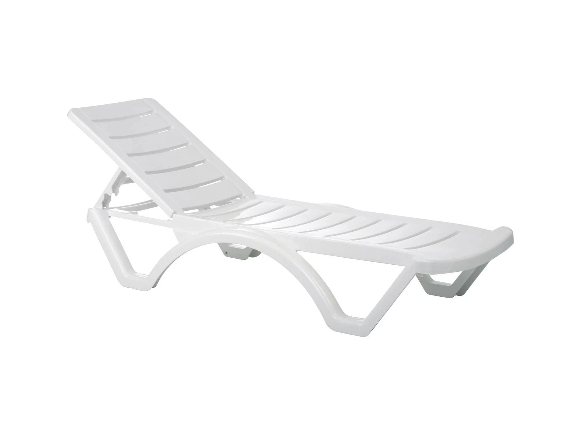 Nowoczesny, sztaplowany leżak ogrodowy wykonany z białego polipropylenu.