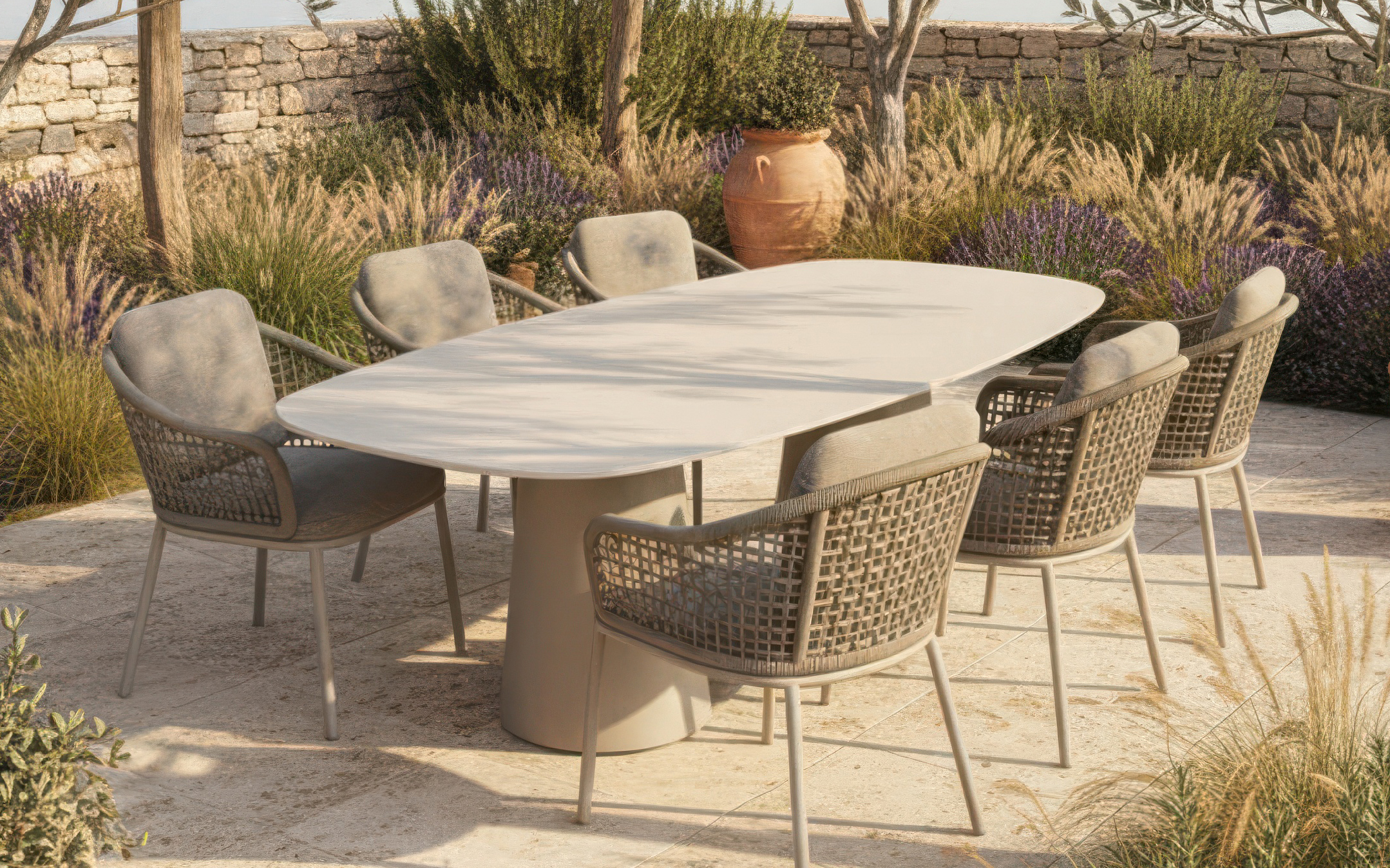 Głównym punktem zestawu jest stół z blatem ceramicznym w odcieniu jasnego kamienia. Ceramika to jeden z najbardziej wytrzymałych materiałów outdoorowych – cechuje się niemal całkowitą odpornością na zarysowania mechaniczne, wchłanianie wilgoci oraz ekstremalne temperatury. Jasna, naturalna kolorystyka blatu optycznie odciąża konstrukcję, nadając jej nowoczesny, szlachetny wygląd.