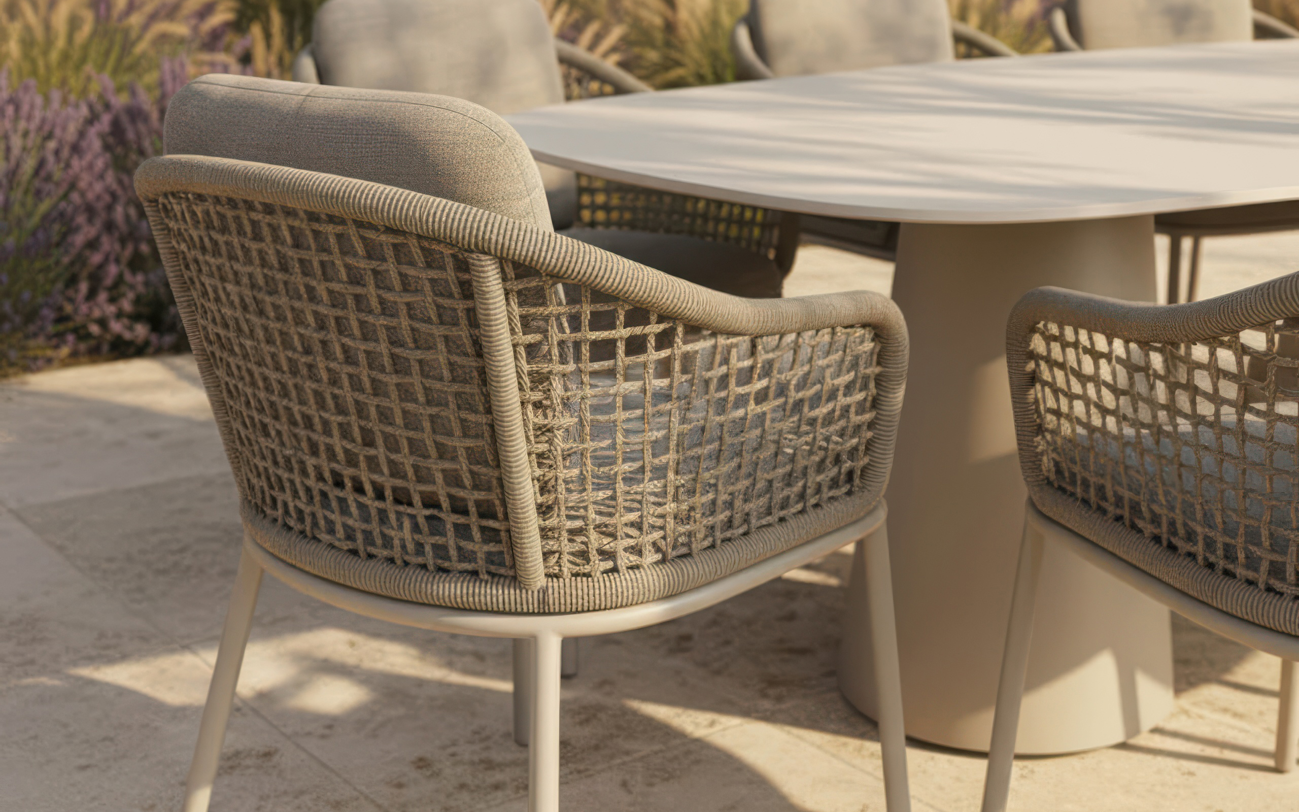W komplecie znajduje się sześć krzeseł aluminiowych w piaskowym odcieniu beżu. Ich znakiem rozpoznawczym jest ażurowa plecionka z liny syntetycznej na oparciach i bokach. Takie rozwiązanie nie tylko podnosi walory wizualne mebli, ale przede wszystkim gwarantuje doskonałą cyrkulację powietrza (przewiewność), co jest kluczowe podczas użytkowania w upalne dni.