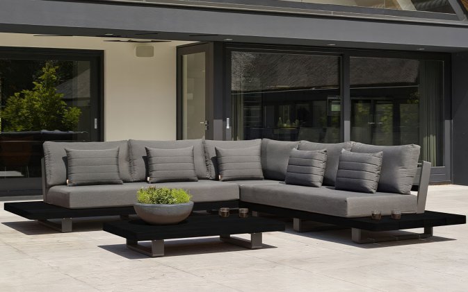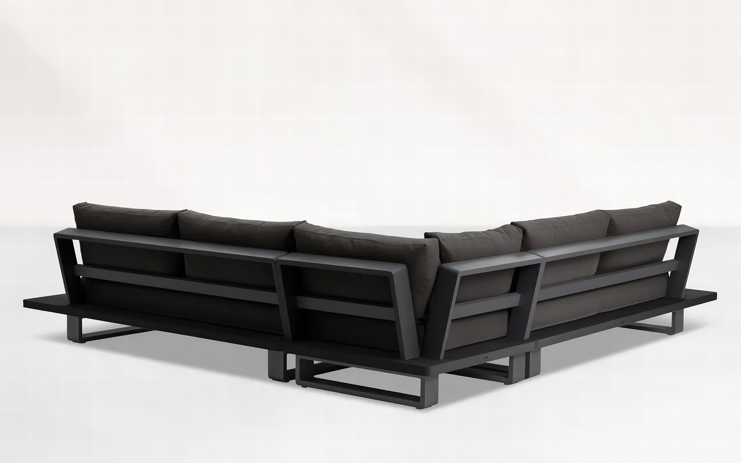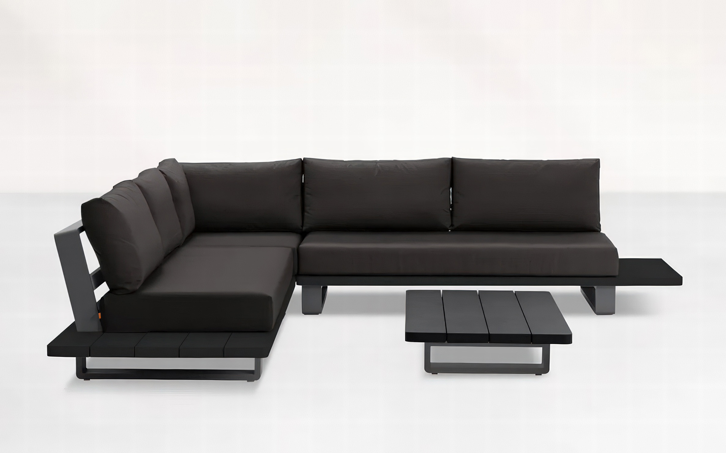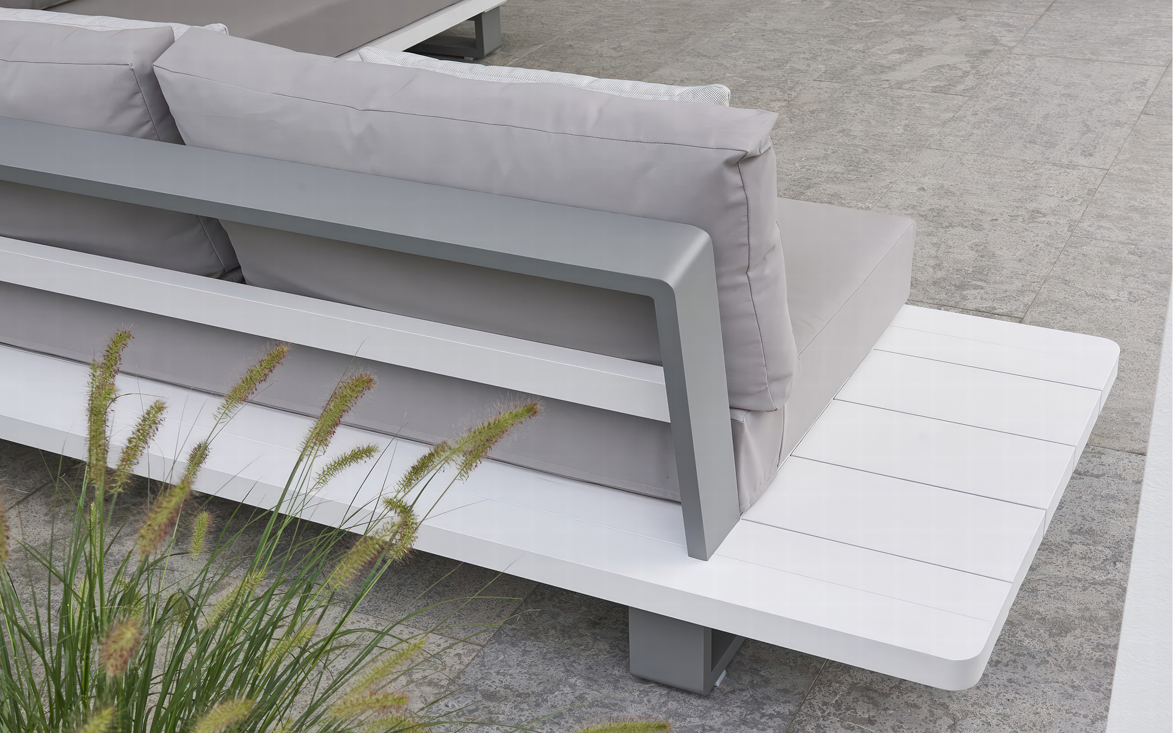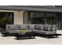 Nowoczesny i przyci¹gaj¹cy wzrok zestaw, który zapewnia przestronne miejsce dla ka¿dego z nutka poczucia luksusu. Surowoœæ aluminium jest ³agodzona przez grube teakowe blaty. Dziêki bocznym stolikom nigdy nie bêdziesz daleko od swoich posi³ków. Mocna i wykonana z aluminium rama stanowi piêkny kontrast dla wygodnych, grubych poduszek. Lekko pochylone i stosunkowo wysokie oparcie pozwala zapewniæ wysok¹ wygodê odpoczynku. G³êbokie siedziska to z kolei zaproszenie do popo³udniowej drzemki na tarasie. Ca³oœæ mo¿na dopieœciæ ma³ymi poduszkami dekoracyjnymi z pikowaniem - dostêpne w kilku rozmiarach. Poszewki poduszek wykonane s¹ z materia³u CONFORMA Basalt o kolorze bardzo ciemnego antracytu.