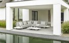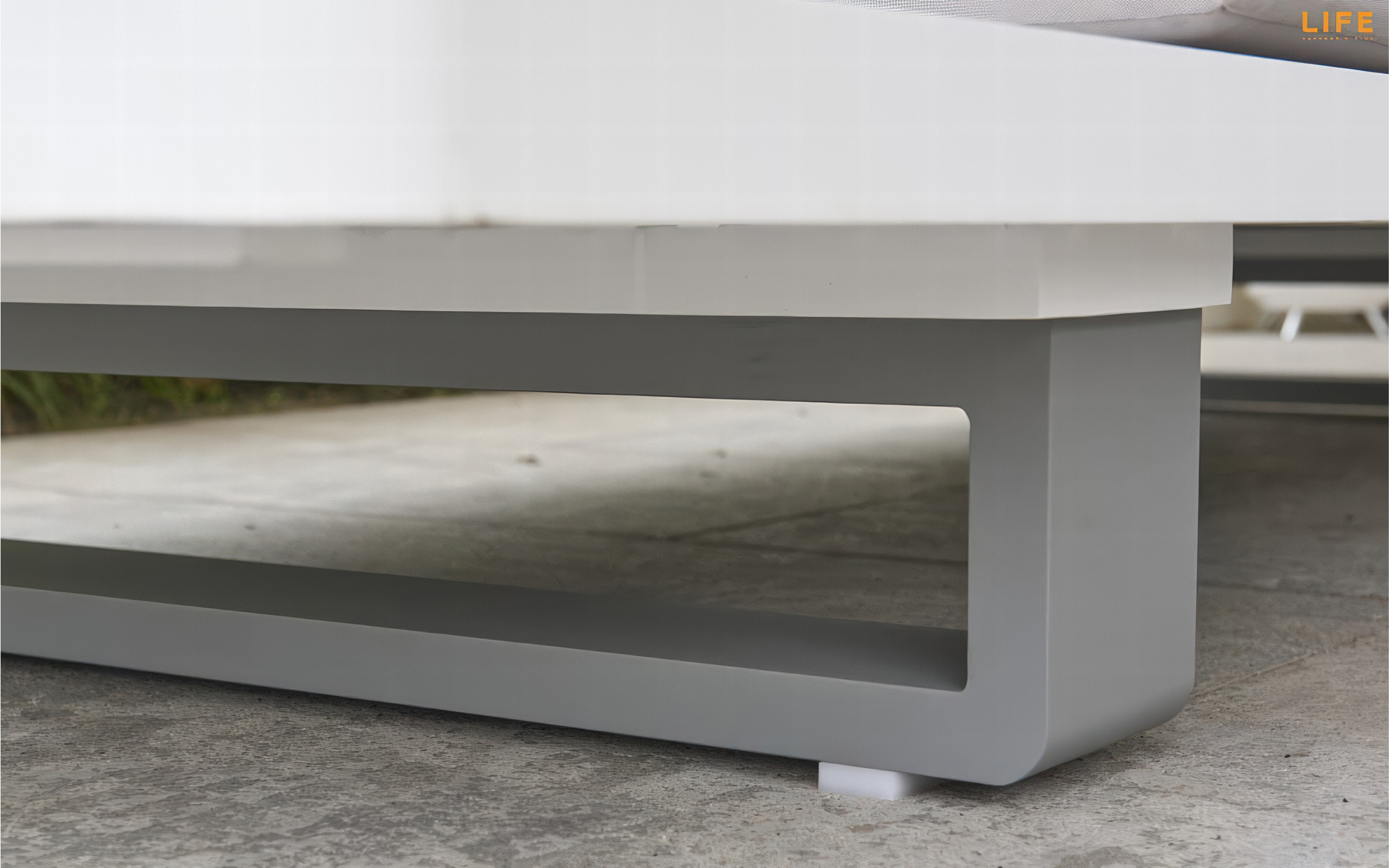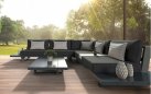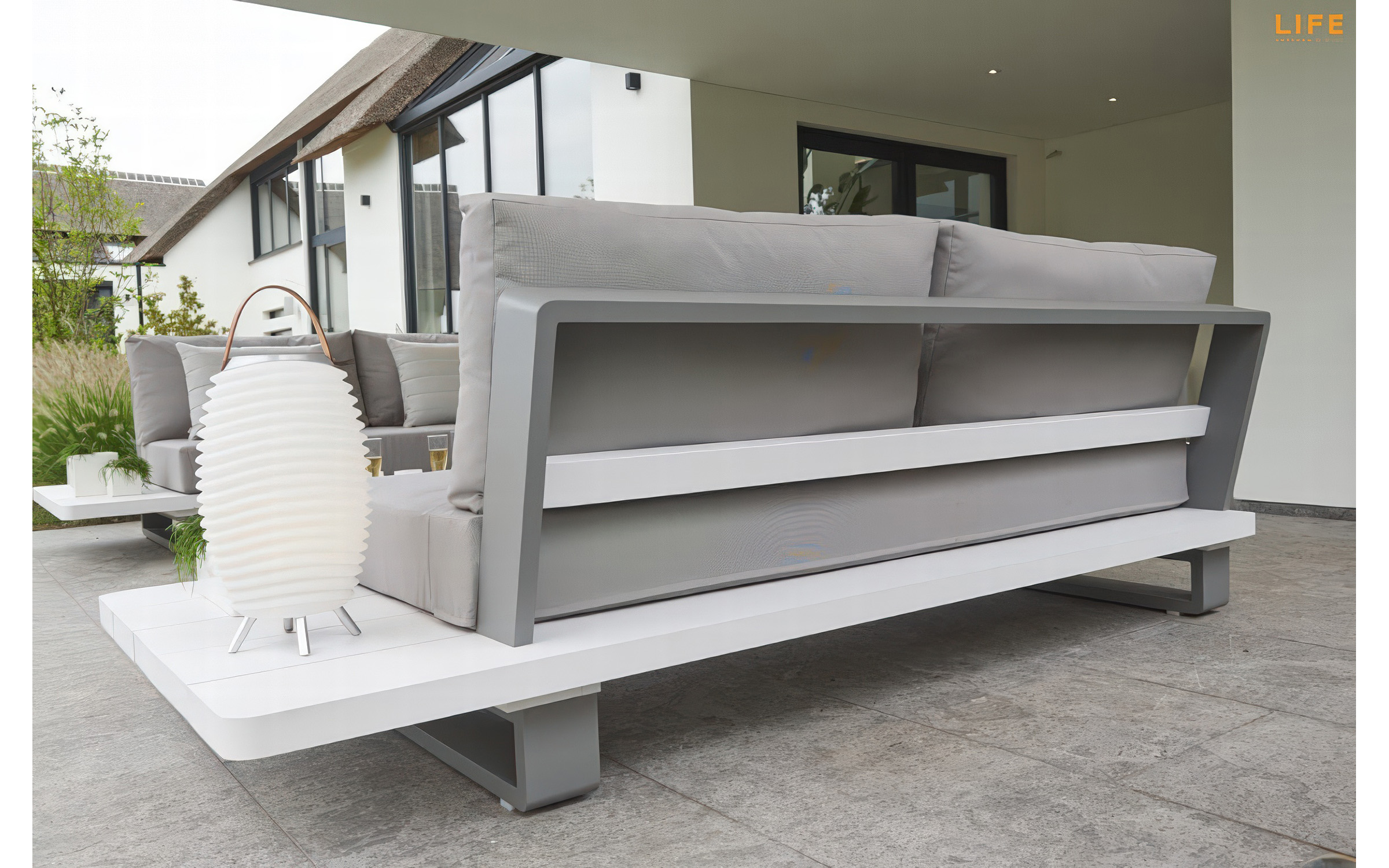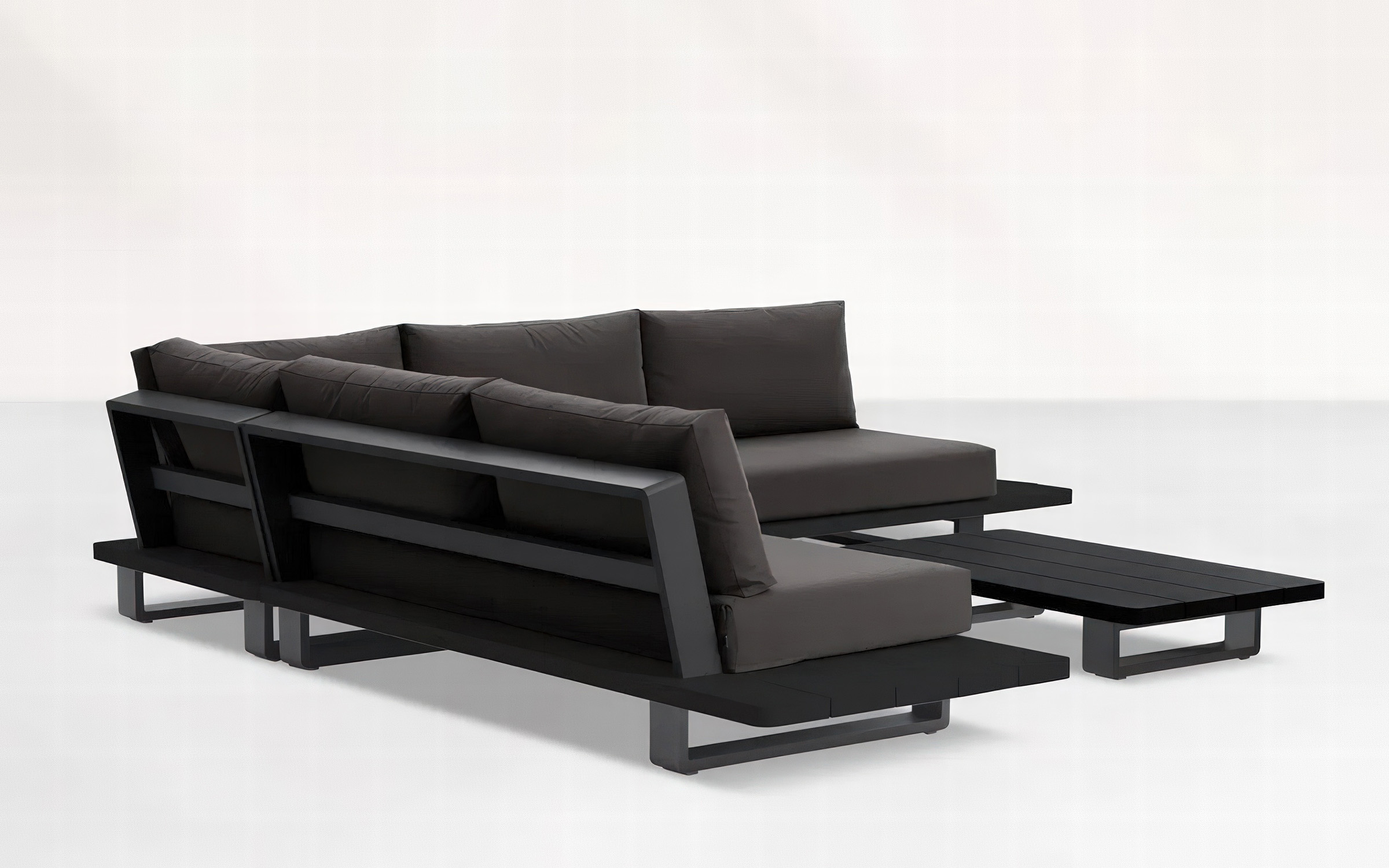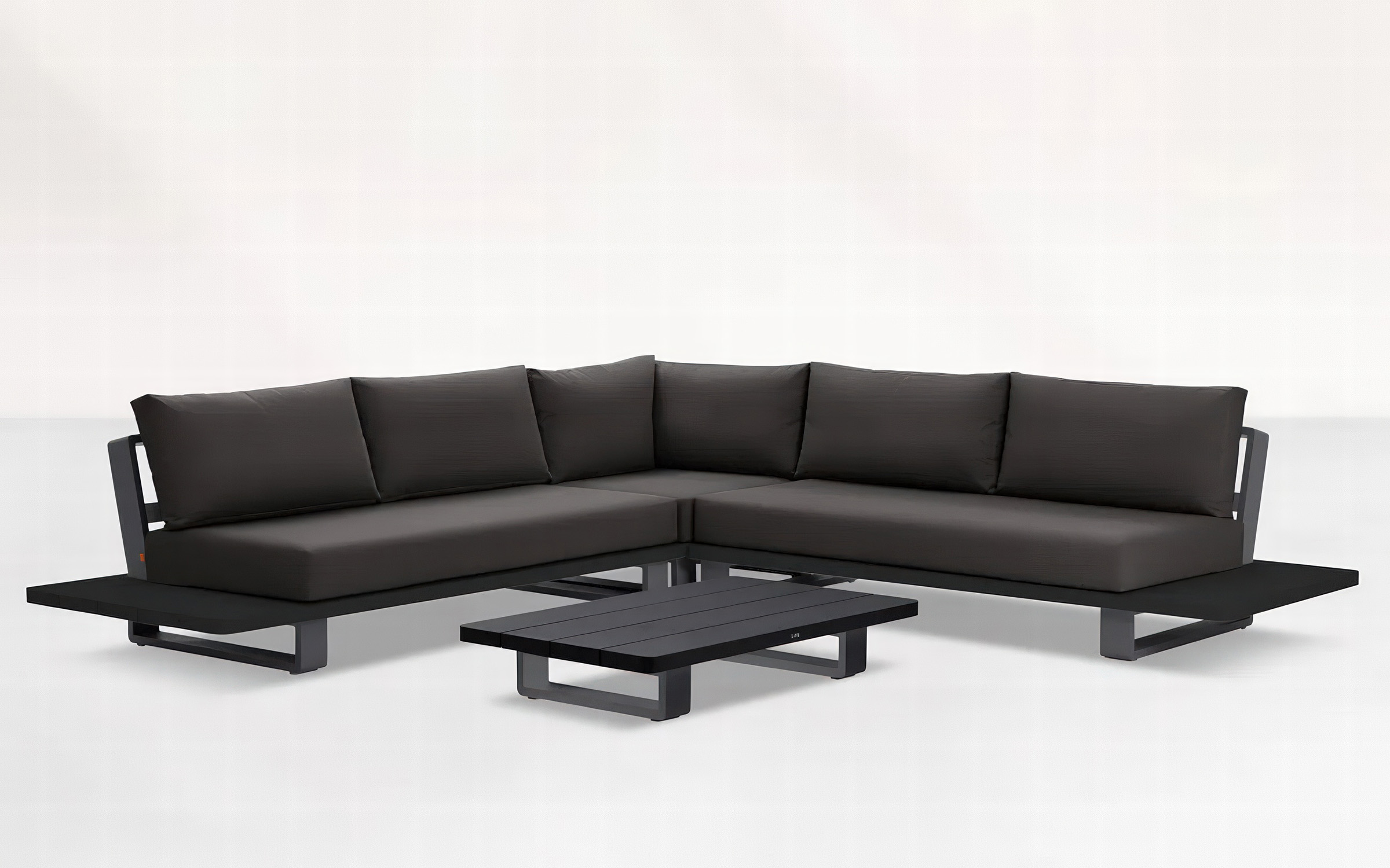 Nowoczesny i przyci¹gaj¹cy wzrok zestaw, który zapewnia przestronne miejsce dla ka¿dego z nutka poczucia luksusu. Surowoœæ aluminium jest ³agodzona przez grube teakowe blaty. Dziêki bocznym stolikom nigdy nie bêdziesz daleko od swoich posi³ków. Mocna i wykonana z aluminium rama stanowi piêkny kontrast dla wygodnych, grubych poduszek. Lekko pochylone i stosunkowo wysokie oparcie pozwala zapewniæ wysok¹ wygodê odpoczynku. G³êbokie siedziska to z kolei zaproszenie do popo³udniowej drzemki na tarasie. Ca³oœæ mo¿na dopieœciæ ma³ymi poduszkami dekoracyjnymi z pikowaniem - dostêpne w kilku rozmiarach. Poszewki poduszek wykonane s¹ z materia³u CONFORMA Basalt o kolorze bardzo ciemnego antracytu.