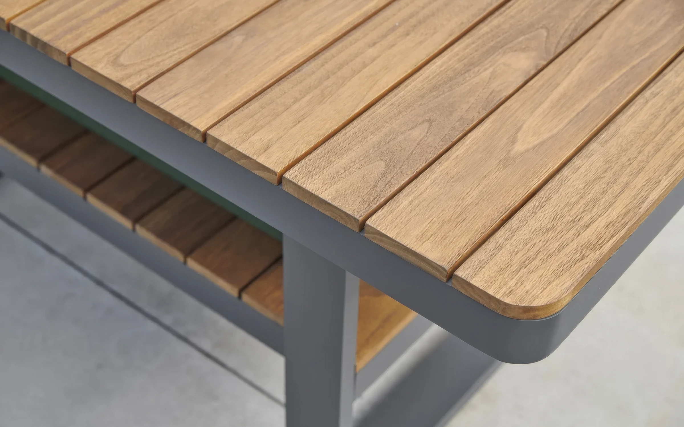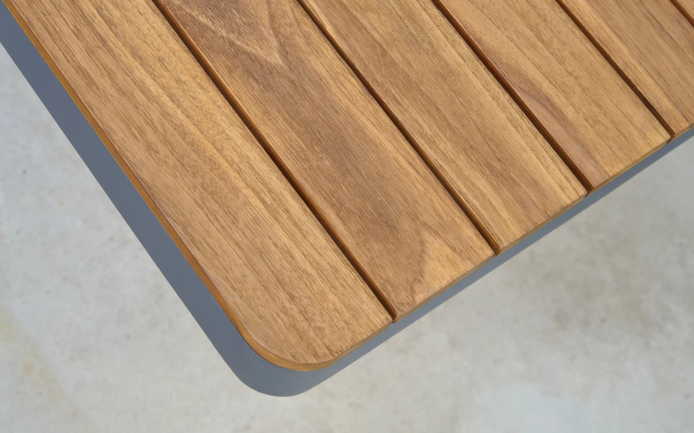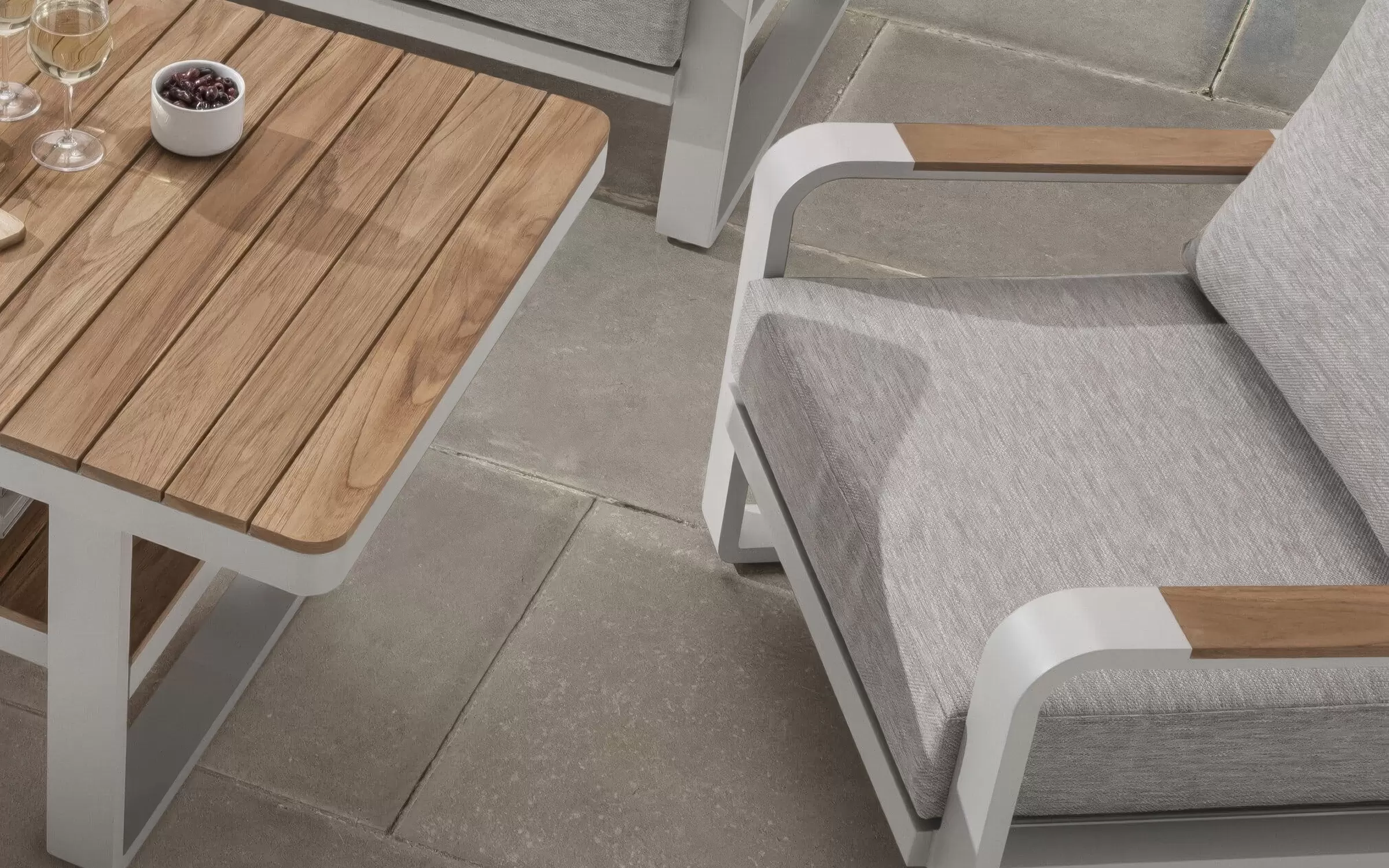 Podłokietniki oraz blat stolika wykonane są z drewna teakowego, cenionego za swoją naturalną urodę i odporność na wilgoć, szkodniki oraz wahania temperatur.