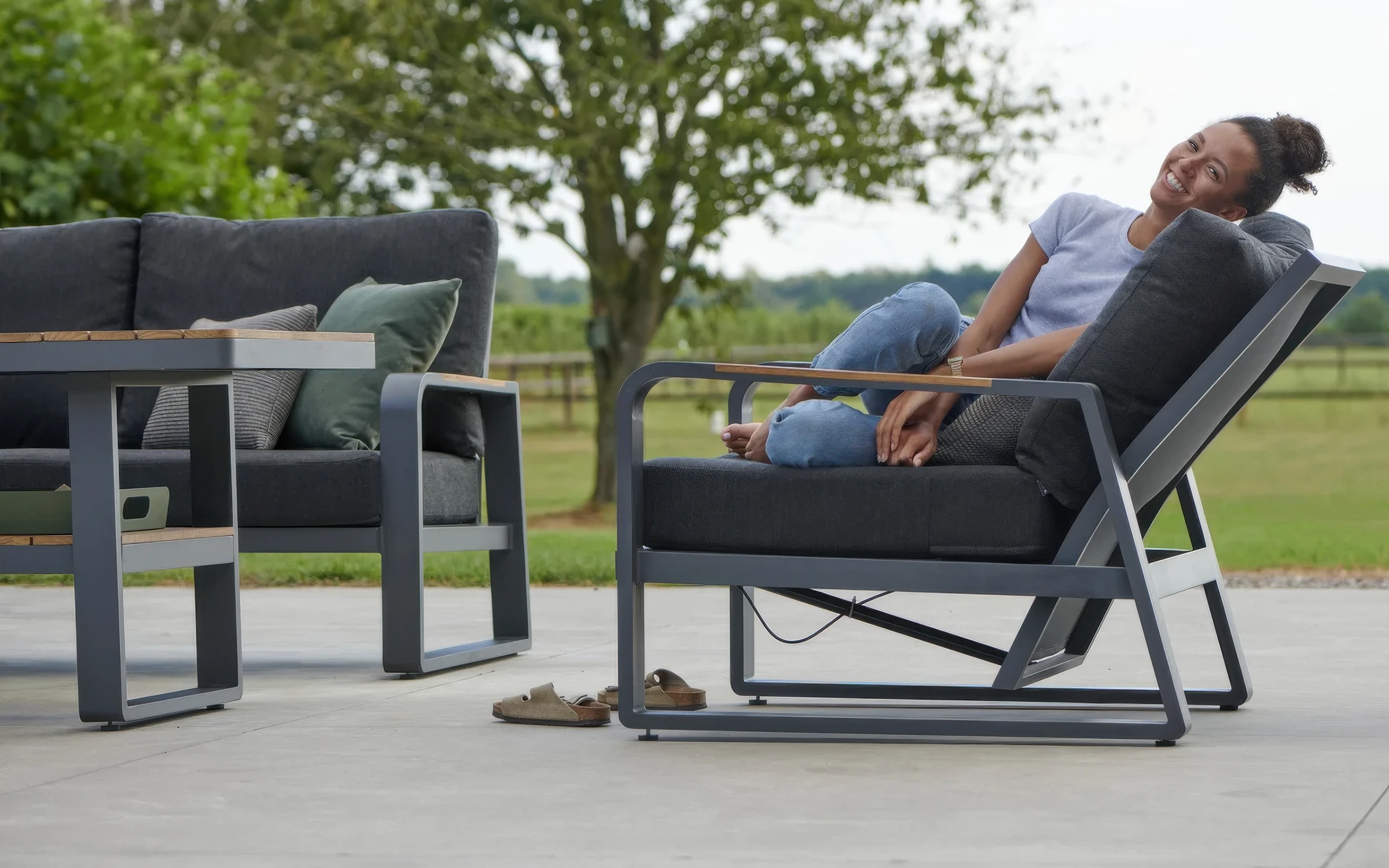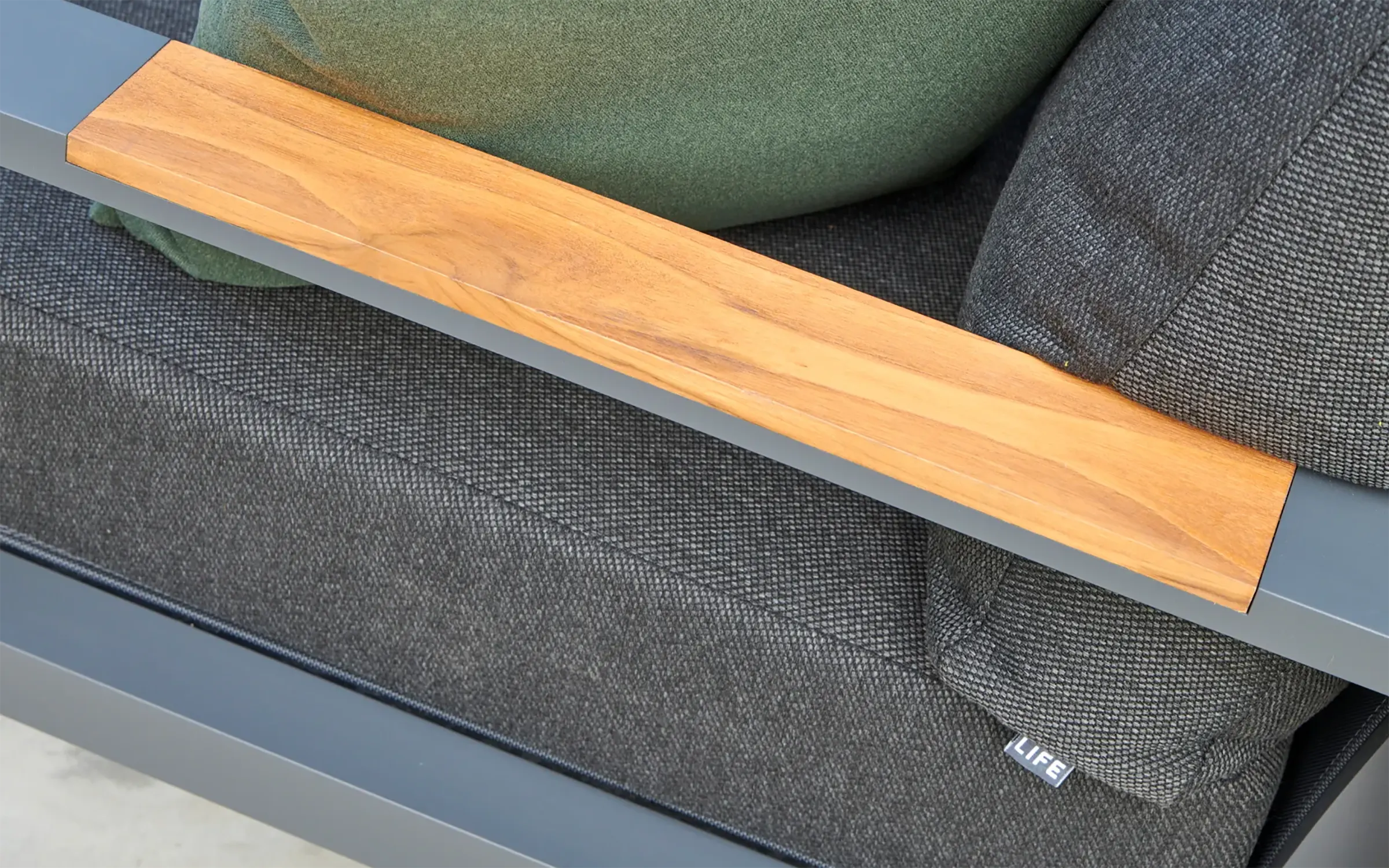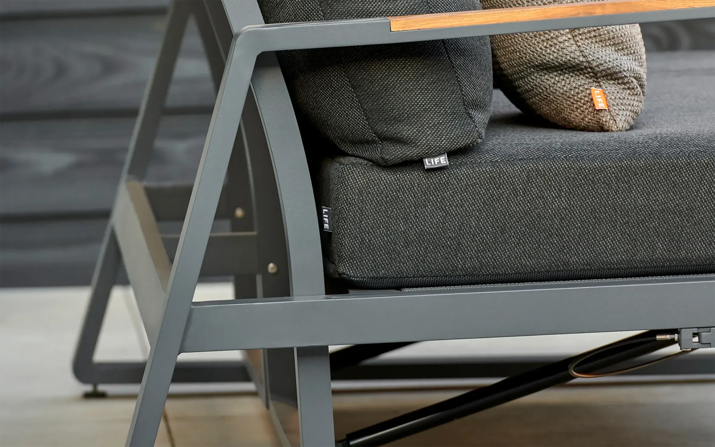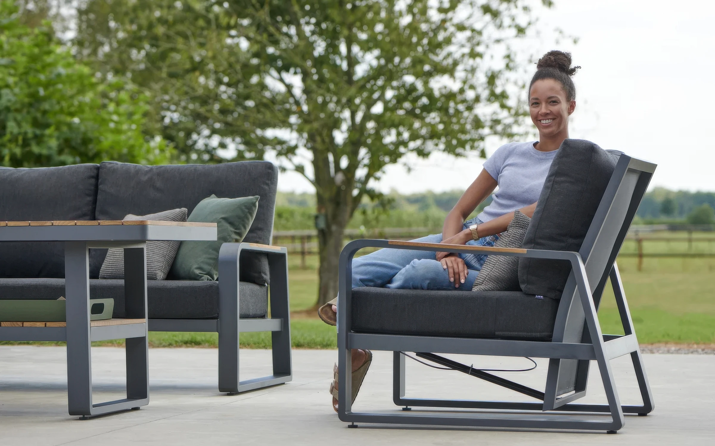 Podłokietniki oraz blat stolika wykonane są z drewna teakowego, cenionego za swoją naturalną urodę i odporność na wilgoć, szkodniki oraz wahania temperatur.