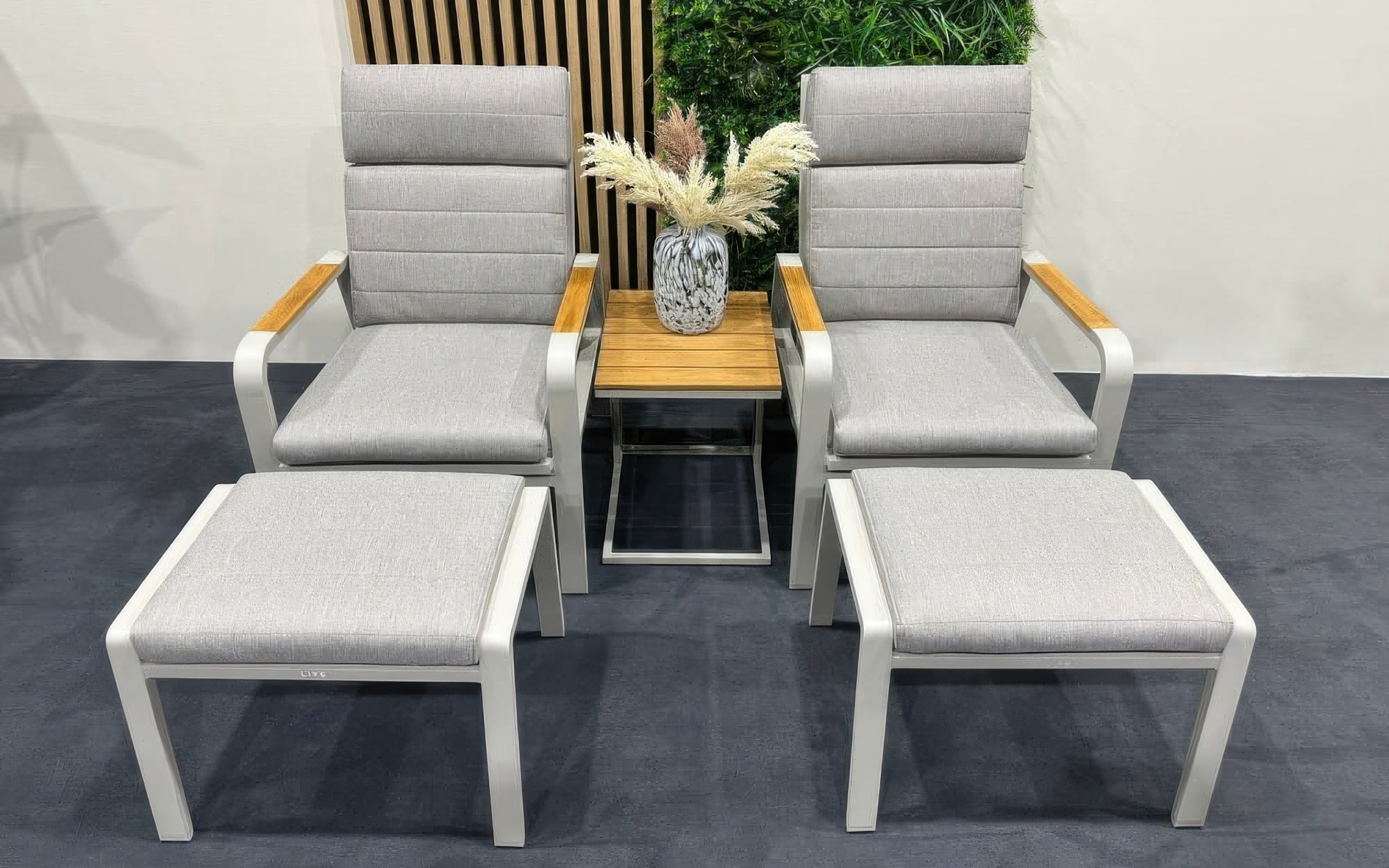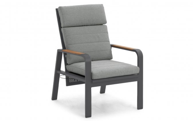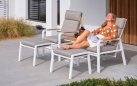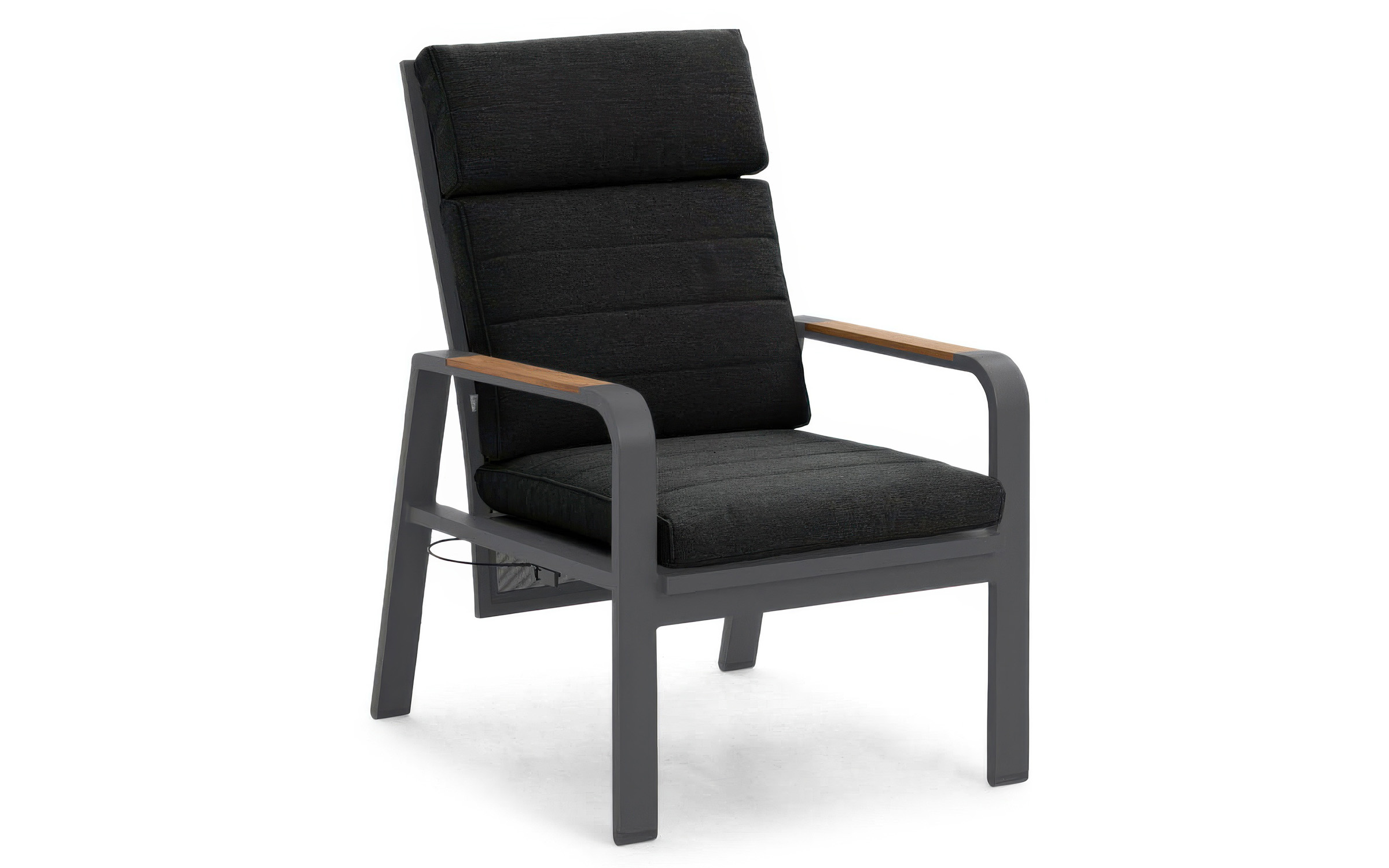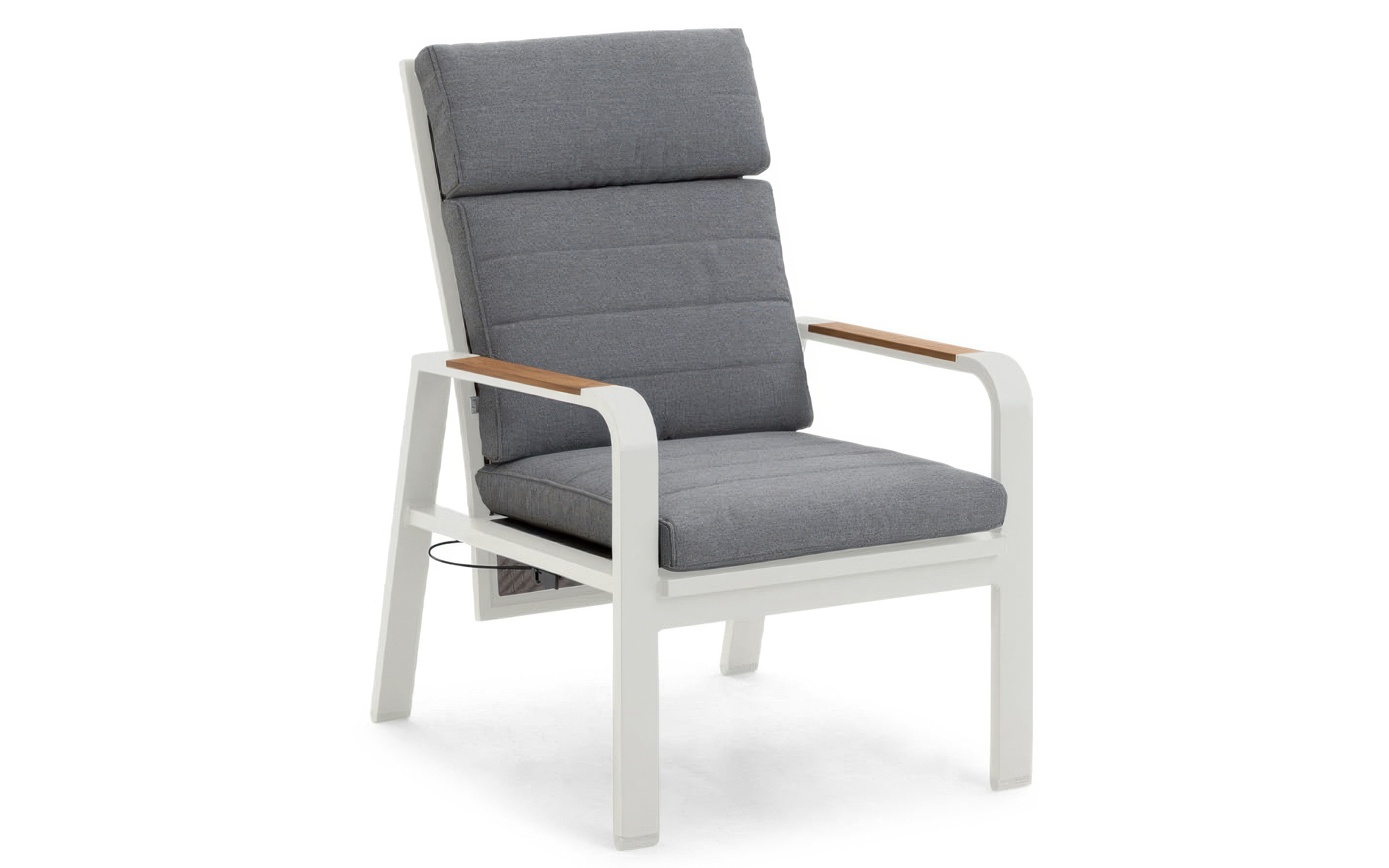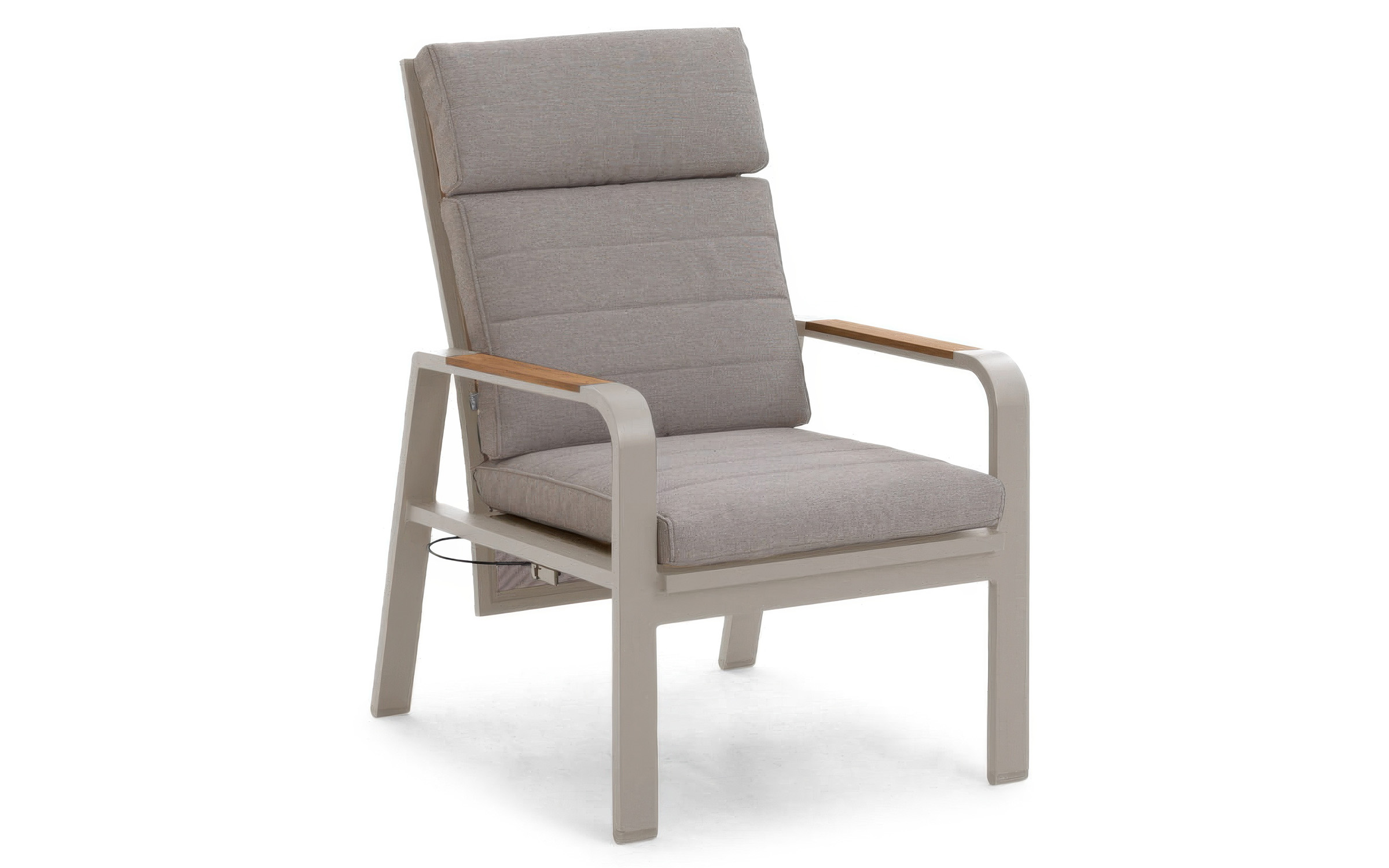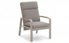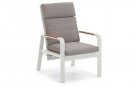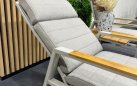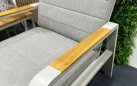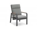 Aluminiowa rama fotela zapewnia wyjątkową trwałość i stabilność, co czyni go odpornym na zmienne warunki atmosferyczne. Dodatkowo, subtelne akcenty z drewna teakowego na podłokietnikach wprowadzają ciepły, naturalny element, który podkreśla elegancki wygląd fotela i nadaje mu unikalny charakter. Teak, znany ze swojej odporności na warunki zewnętrzne, gwarantuje, że fotel będzie służył przez wiele lat, zachowując swoje walory estetyczne i funkcjonalne.
