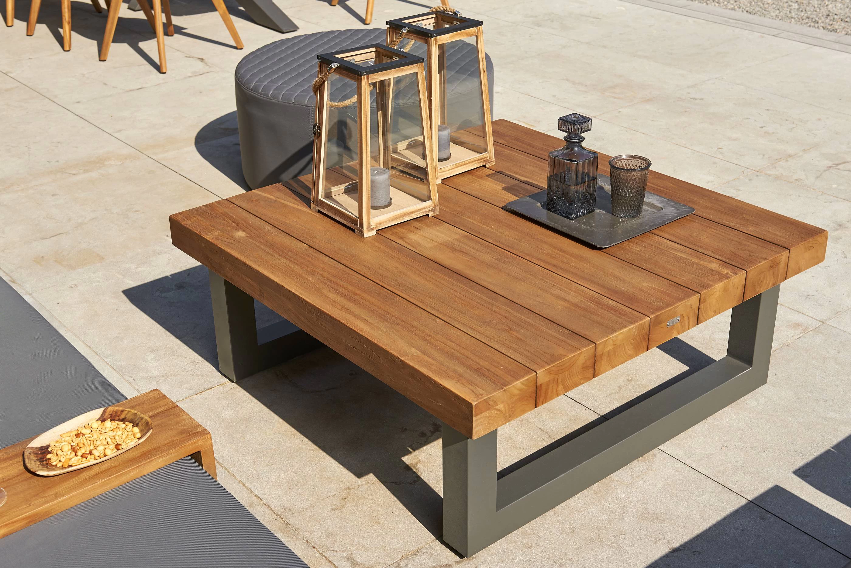 Mniejsza wersja mebli ogroodwych aluminiowych NEVADA - konstrukcja cienmoszara stolik z blatem teak stolik boczny
