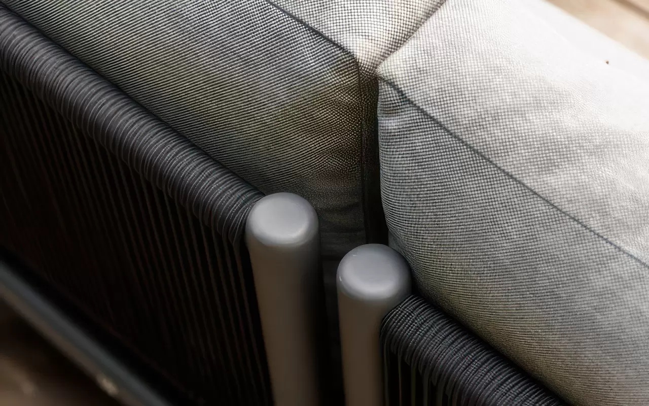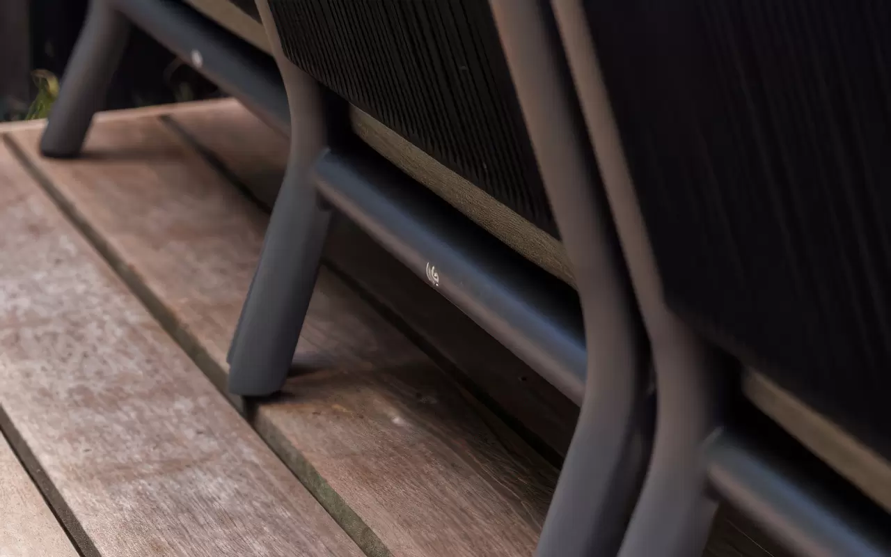 Fundamentem kolekcji jest lekka konstrukcja z aluminium malowanego proszkowo w głębokim kolorze antracytowym. Materiał ten łączy wysoką stabilność mechaniczną z pełną odpornością na zmienne warunki atmosferyczne. Nowoczesny charakter zestawu definiuje czarna lina techniczna, pełniąca rolę elementu konstrukcyjno-dekoracyjnego. Dynamiczny kontrast pomiędzy antracytową ramą a głęboką czernią plecionki nadaje meblom eleganckiego, a zarazem surowego wyglądu.