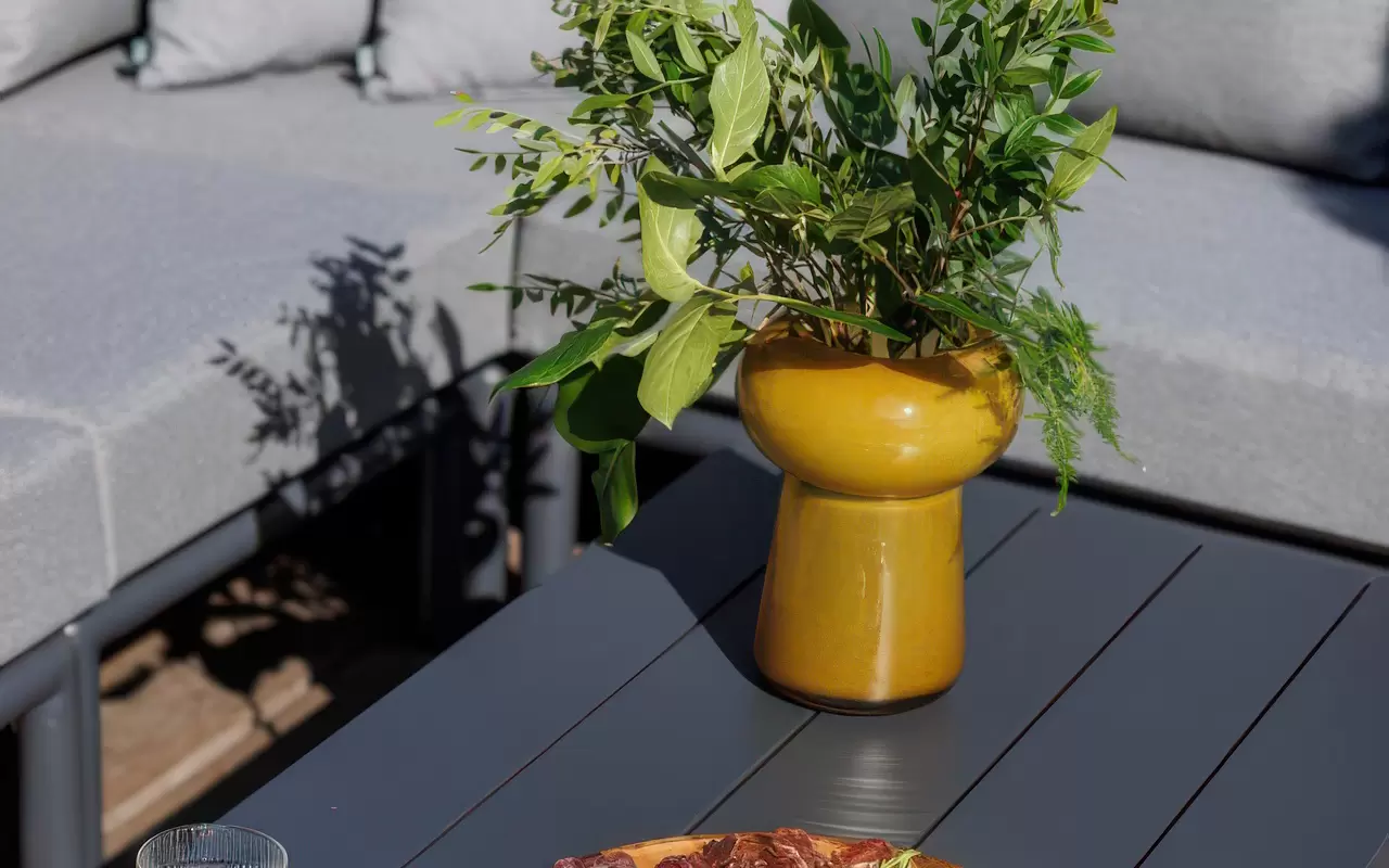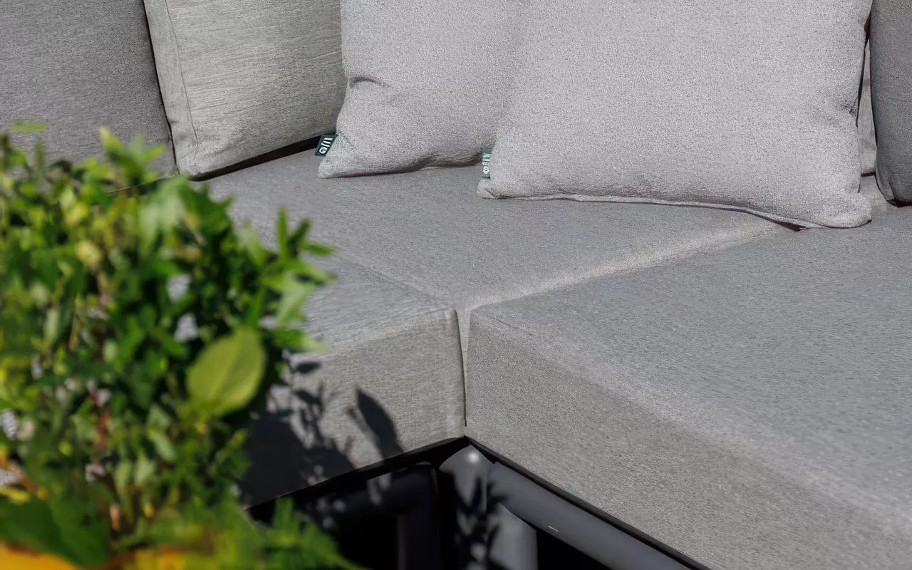 Wysoki standard komfortu zapewniają poduszki outdoorowe w tkaninie Soltex w kolorze szarym. Ich stonowana kolorystyka idealnie balansuje ciemną tonację ramy i plecionki, wprowadzając wizualną lekkość. Poduszki zostały zoptymalizowane pod kątem intensywnej eksploatacji zewnętrznej – technologia Soltex gwarantuje wysoką barierowość wobec wilgoci oraz promieniowania UV, ułatwiając jednocześnie utrzymanie zestawu w nienagannej czystości.