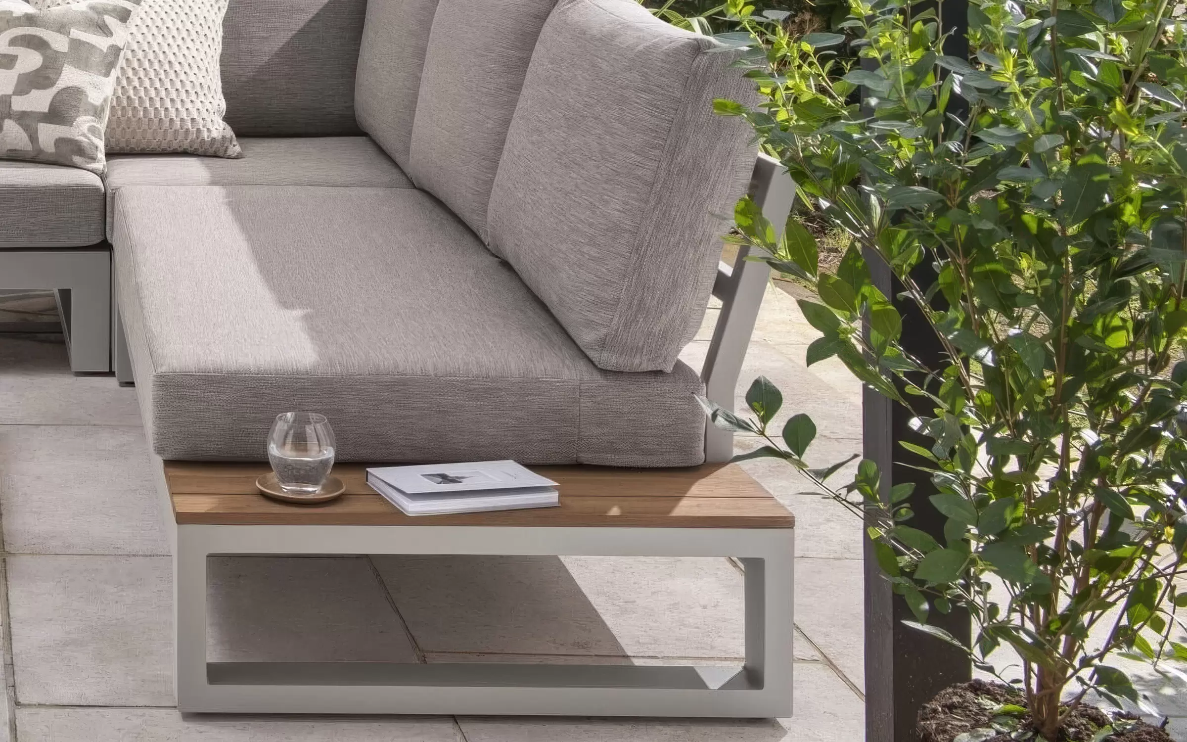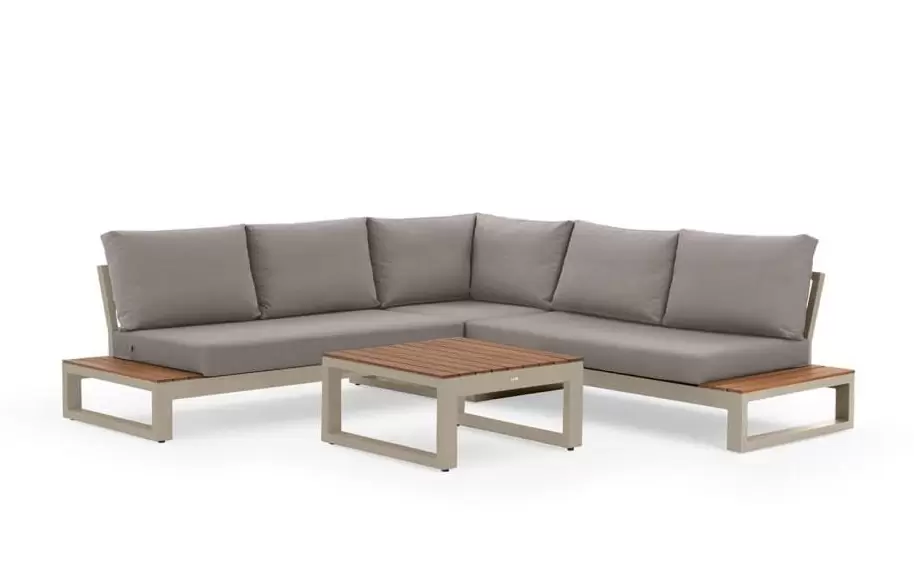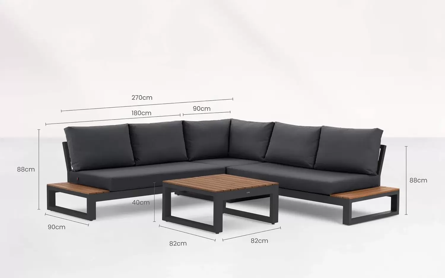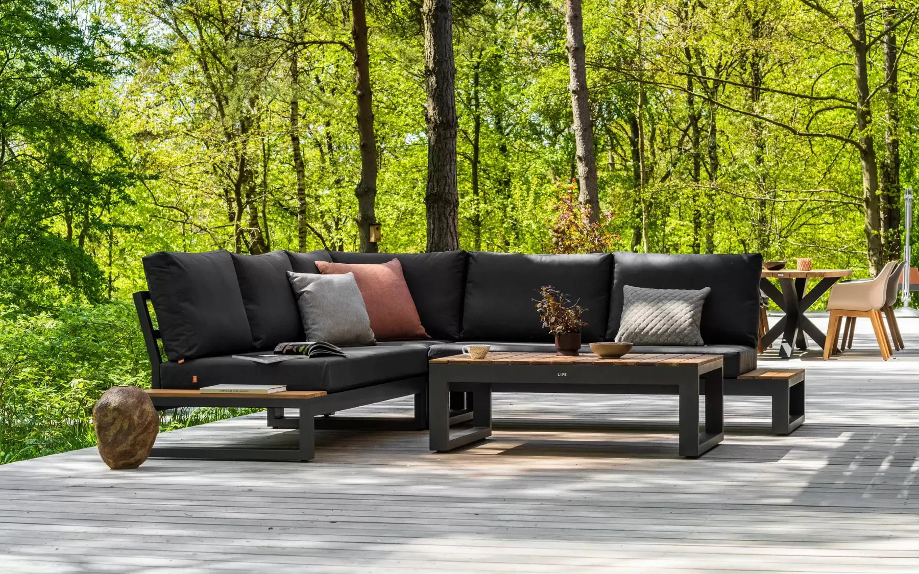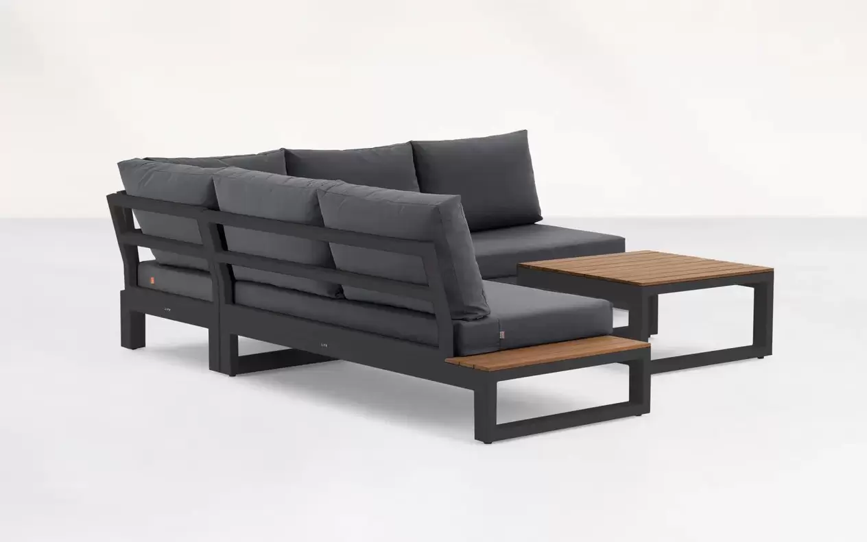 Nowoczesny narożnik Life Outdoor złożony z 3 elementów. Proponowany zestaw posiada na zakończeniach ramion stolik z blatów teak. Zestaw łączy proste kształty solidnej aluminiowej ciemnoszarej konstrukcji z teakowymi dodatkami w ciepłym miodowym kolorze. Stolik w tym komplecie posiada wymiary 82x82 cm.
