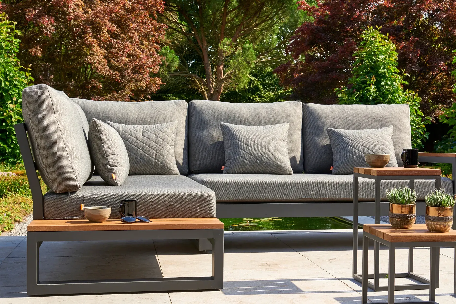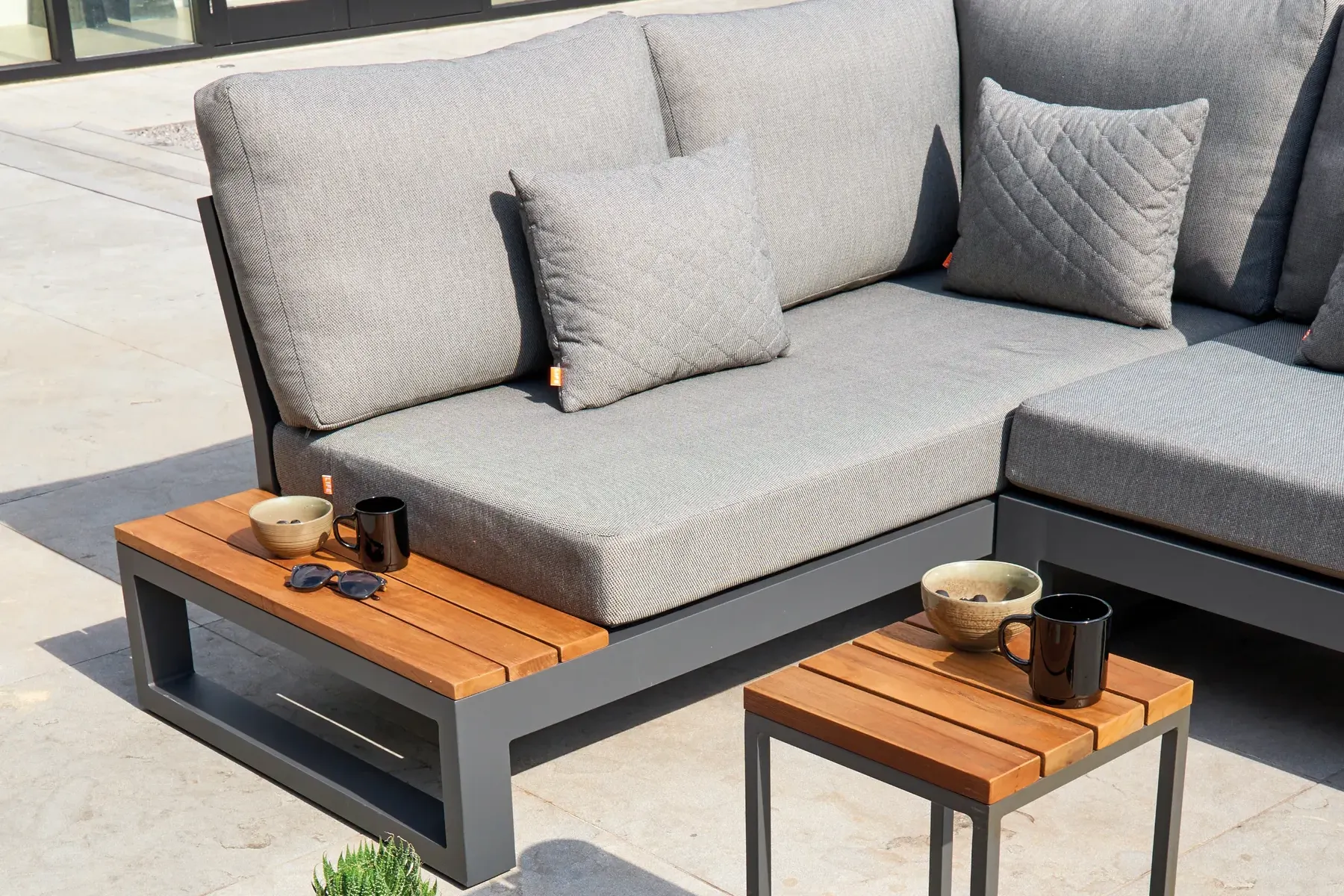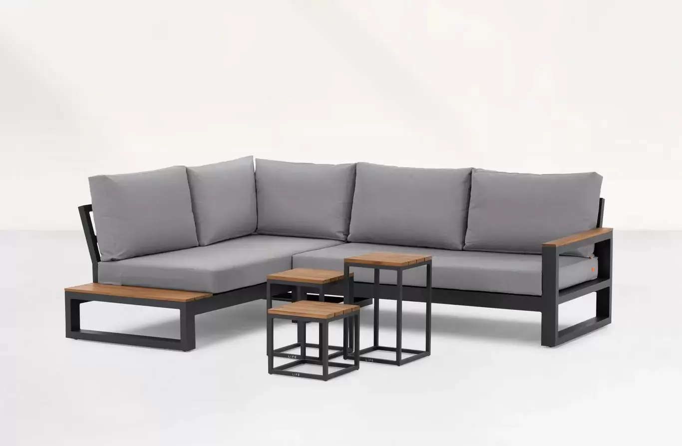 Nowoczesny narożnik Life Outdoor złożony z 2 elementów. Proponowany zestaw z jednej strony posiada podłokietnik, natomiast z drugiej strony stolik. Zestaw łączy proste kształty solidnej aluminiowej ciemnoszarej konstrukcji z teakowymi dodatkami z ciepłym miodowym kolorze.
