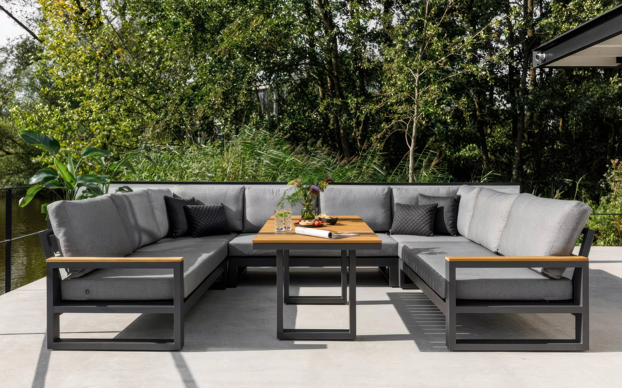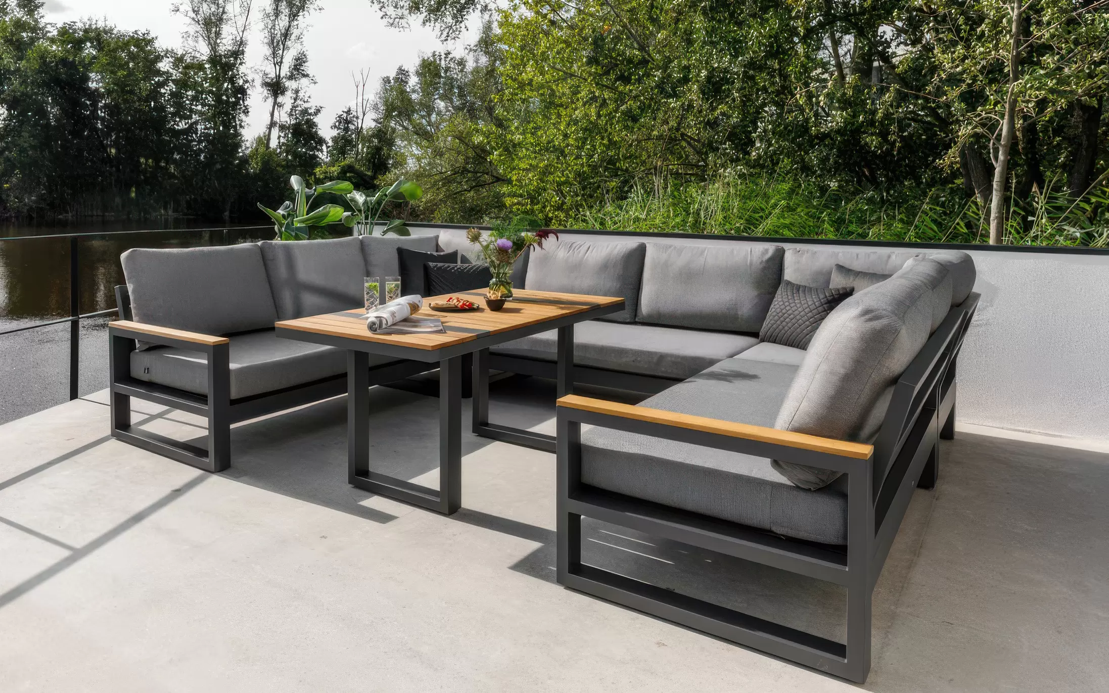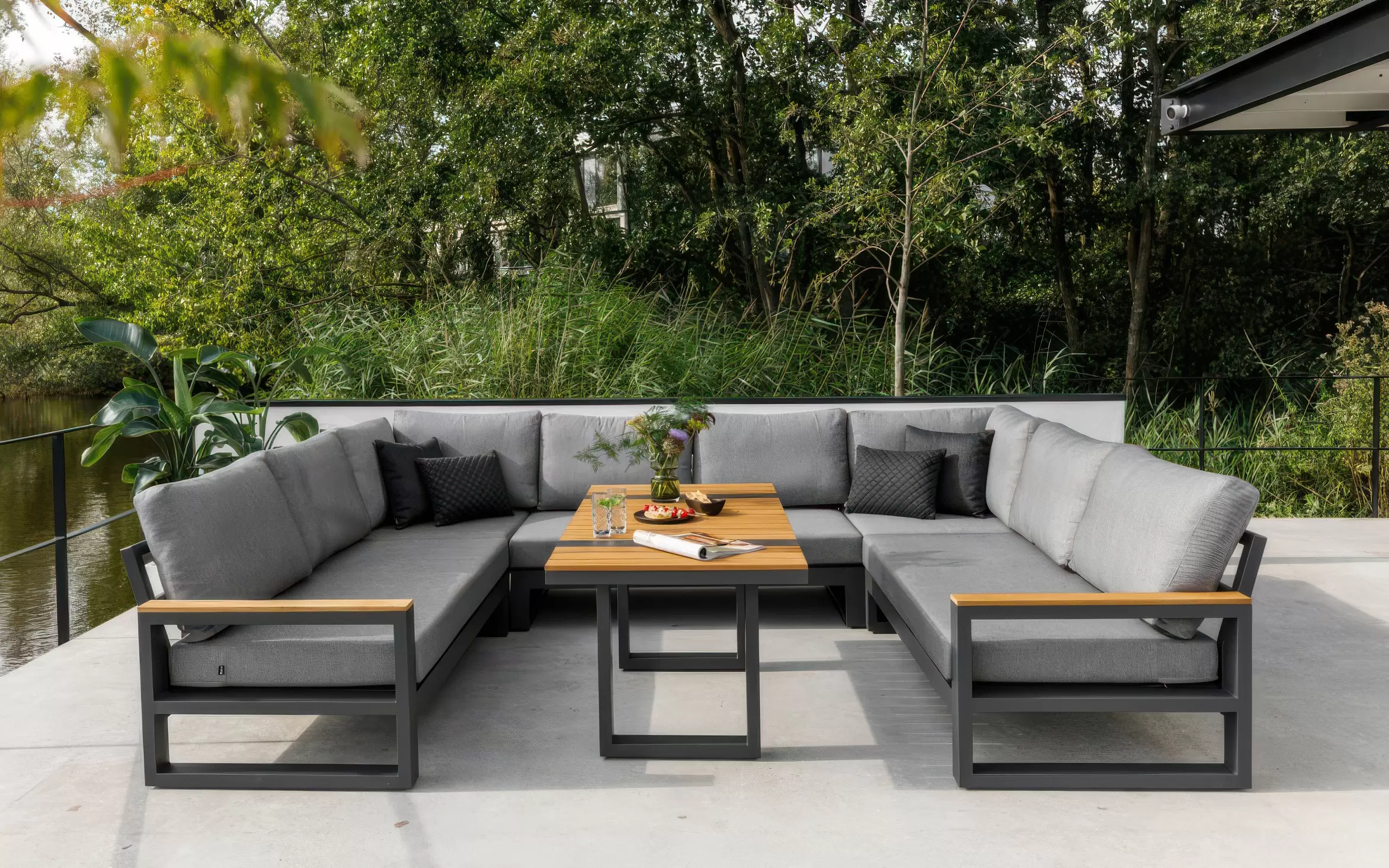 Centralnym punktem kompozycji jest stolik kawowy z blatem z drewna teakowego. Ten naturalny surowiec wprowadza do surowej, antracytowej stylistyki niezbędną dozę ciepła i organicznej elegancji. Drewno teakowe, dzięki swojej legendarnej odporności, podkreśla prestiżowy status kolekcji SOHO, tworząc szlachetny kontrast z jasną tapicerką i grafitowym aluminium.