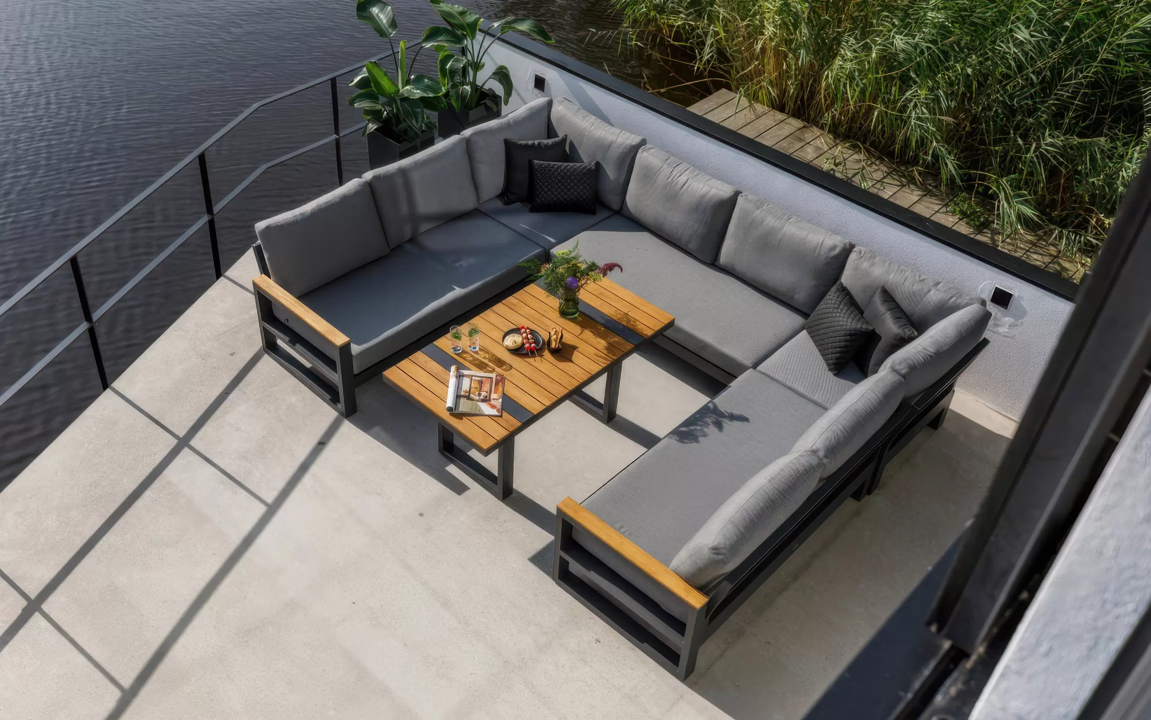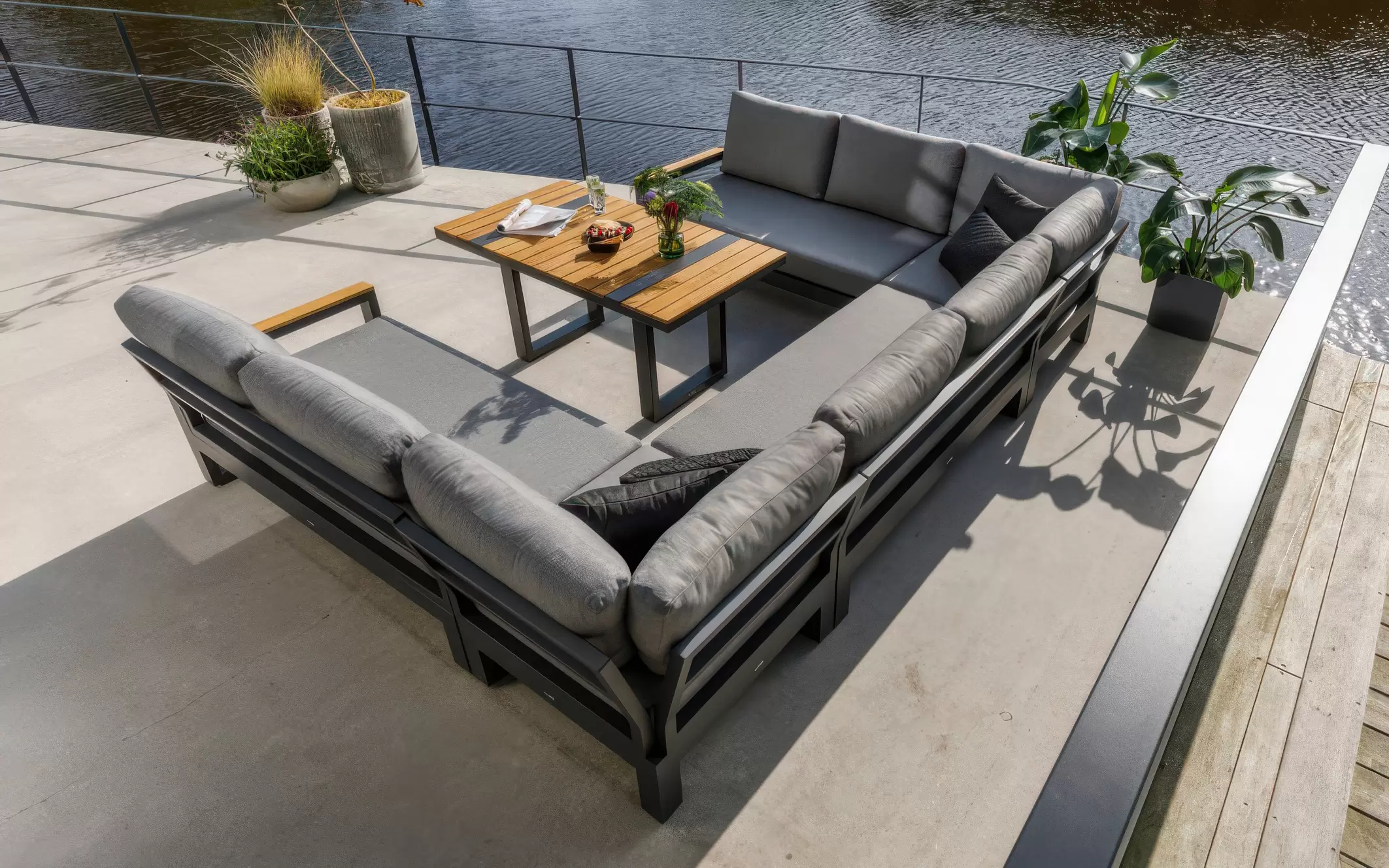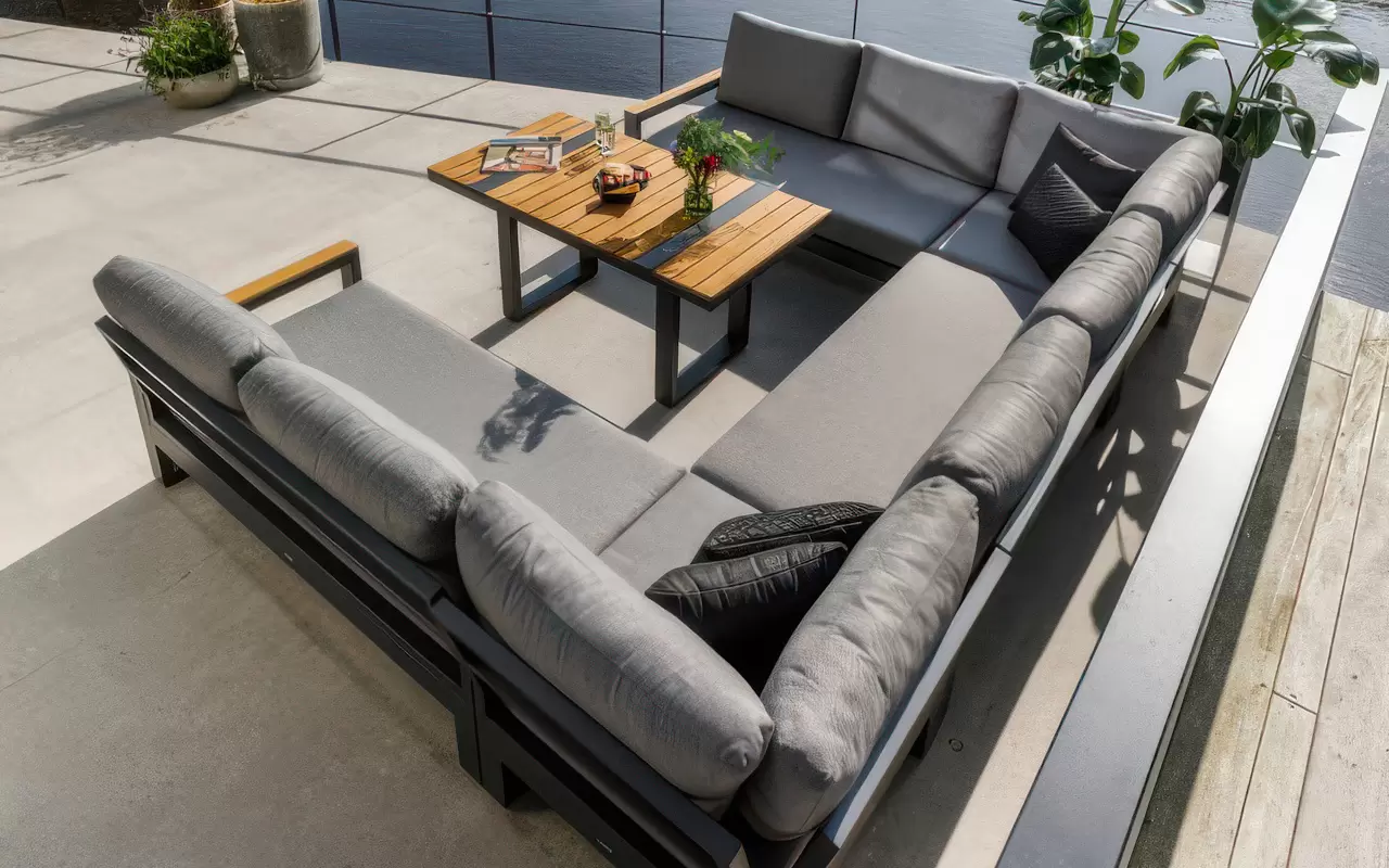 Centralnym punktem kompozycji jest stolik kawowy z blatem z drewna teakowego. Ten naturalny surowiec wprowadza do surowej, antracytowej stylistyki niezbędną dozę ciepła i organicznej elegancji. Drewno teakowe, dzięki swojej legendarnej odporności, podkreśla prestiżowy status kolekcji SOHO, tworząc szlachetny kontrast z jasną tapicerką i grafitowym aluminium.